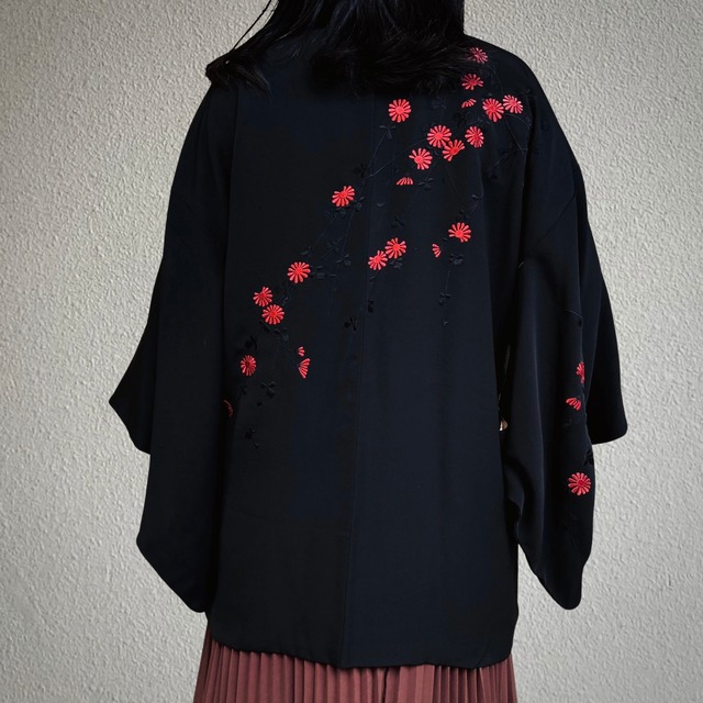 風に舞う華 - Red flower emboss design Japanese vintage haori black