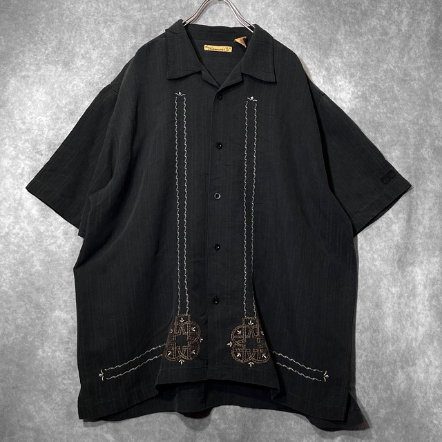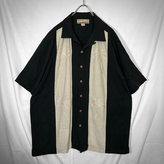 開襟 embroidery Palm tree pattern design Black × Beige H/S shirt