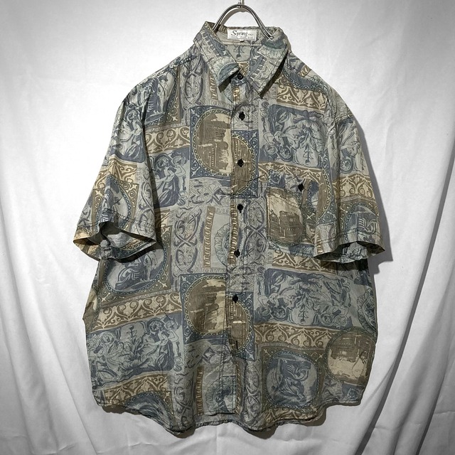 ...................................... ミステリアスなペイズリーを中心としたモダンなアートデザインが全体に落とし込まれた雰囲気ムンムンな総柄シャツの入荷です。 無機質なグレーと深みのあるカーキのコントラストが印象的。 しなやかで柔らかいレーヨンの生地で 経年変化による風合いがありヴィンテージのような質感と雰囲気が楽しめる1着。 80〜90's の時代を感じさせるオープンカラー(開襟)のディテールが、よりレトロモダンな雰囲気を作り上げてます。 メンズだけでなく、ウィメンズ問わずユニセックスで着用ができ、女性にも是非推したい開襟シャツです。 ...................................... size:XXL ( L ) 着丈:71.5 cm / 72.5 cm ( 前 / 後ろ ) 身幅:55.5 cm 肩幅:54 cm 袖丈:23 cm Length:71.5 cm / 72.5 cm (front / back) Width:55.5 cm Shoulder Width :54 cm Sleeves Length:23 cm material:silk 70%, rayon 30% made:China rank:B A → 数回使用した程度の非常に綺麗な状態 B → 使用感が少ない比較的良好な状態 C → 着用に問題がない程度の使用感がある状態 D → 傷やダメージが目立つ状態 ※サイズは全て平置きでの採寸です。多少の誤差がありますのでご了承ください。 ※こちらUSEDですので多少の汚れや傷、生地・糸のほつれ等が見られる場合がございます。あらかじめご理解ご了承くださいませ。 A → Very clean condition, used only a few times. B → Good condition with few wears. C → Wearable without problems, but with signs of use. D → Scratches and damages are noticeable. * All measurements are taken flat. Please note that there is a slight margin of error. * This is a USED item, so there may be some stains, scratches, loose fabric and threads. Please understand and understand in advance. ks21-0524-K20 ......................................