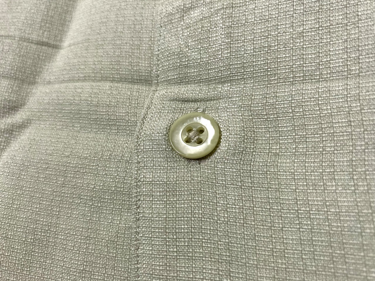 生地と同色のボタン、オープンカラー(開襟)、袖口にボタンが1つあり。