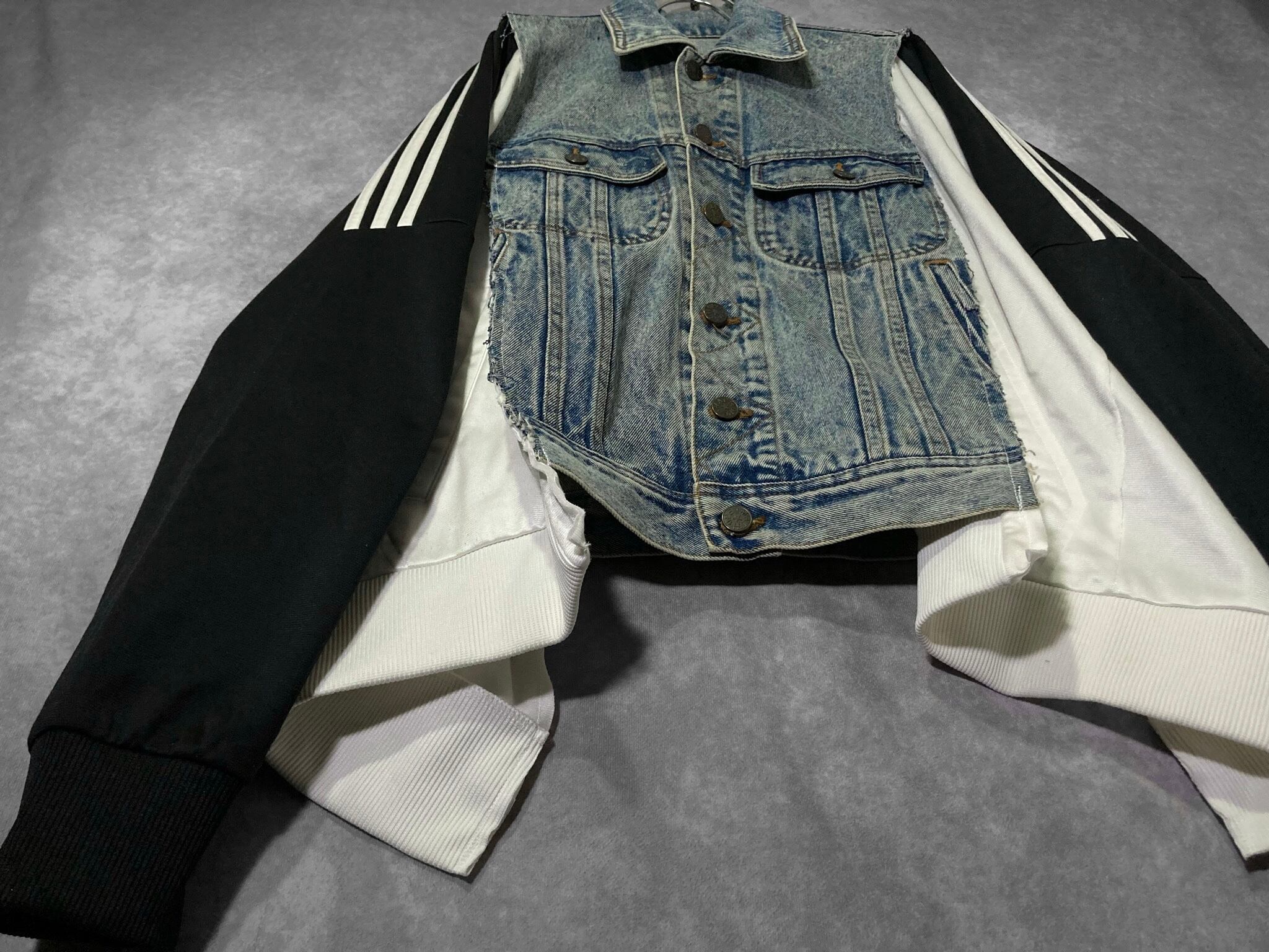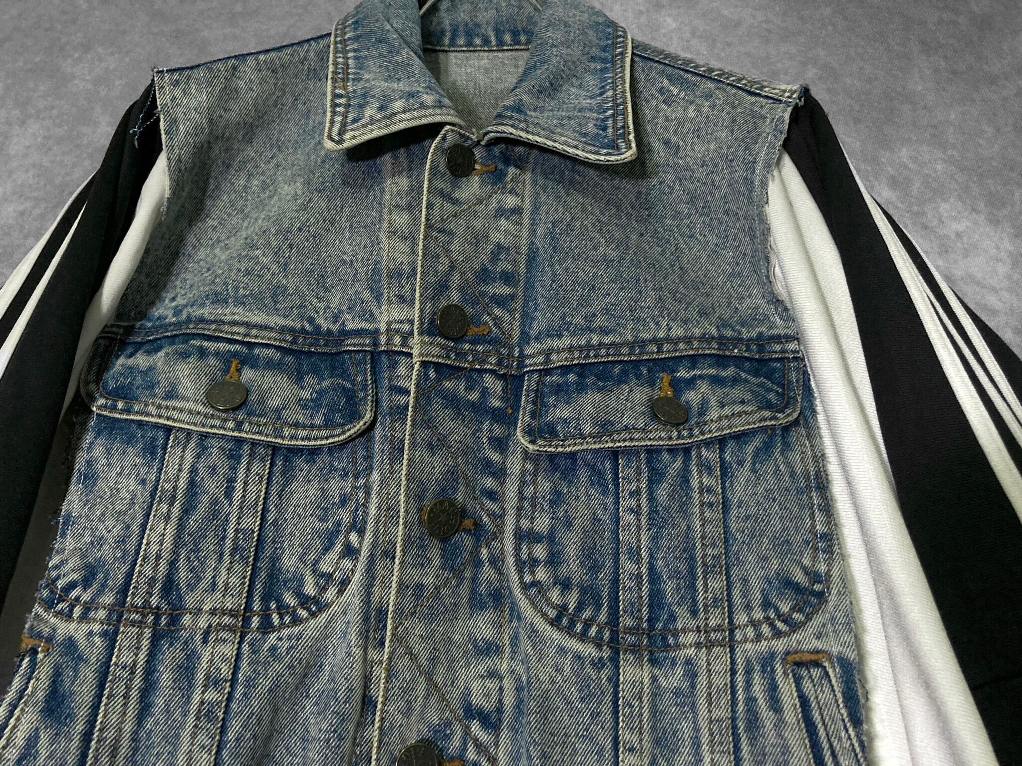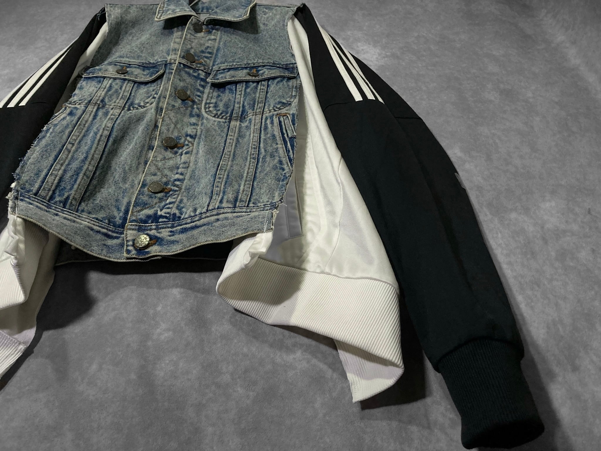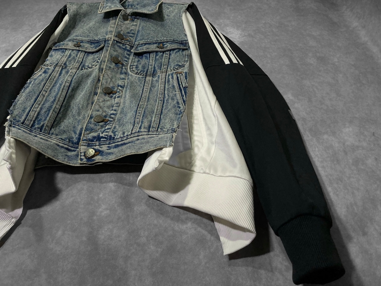 ストライプのサイドラインのトラックジャージとウォッシュとアタリによるコントラストが美しいグランジ感のあるヴィンテージデニムをドッキングさせた再構築ジャケット。