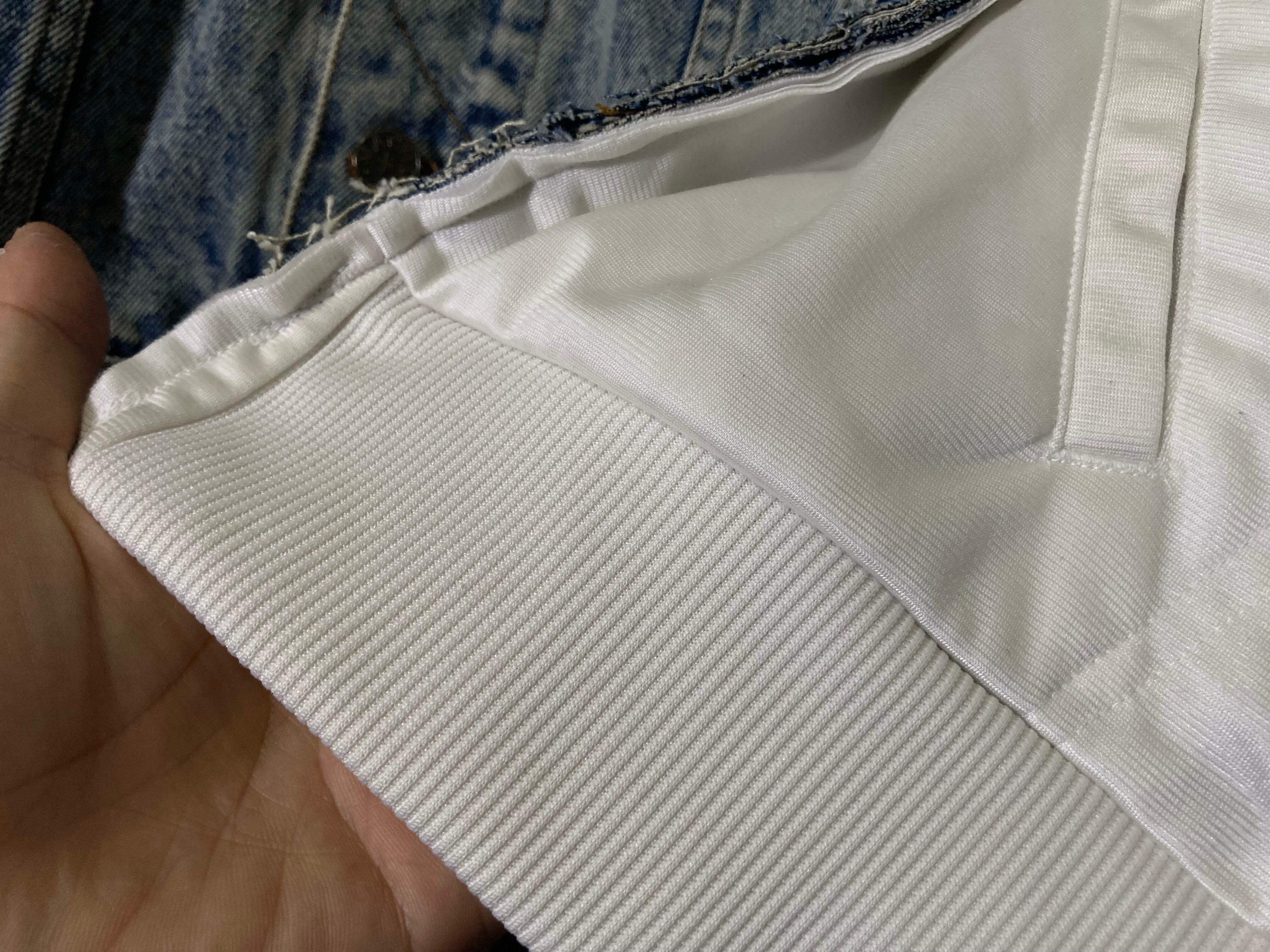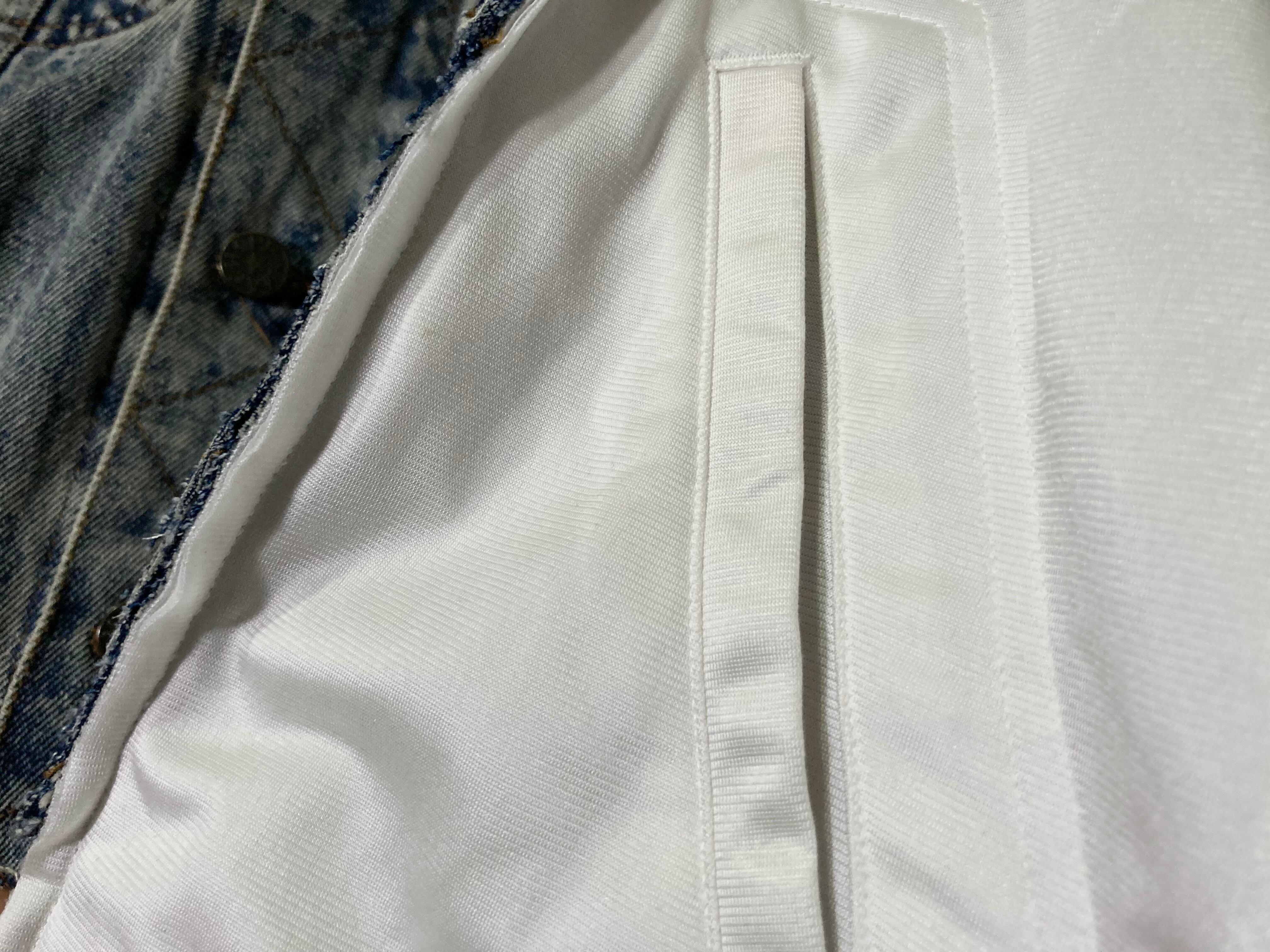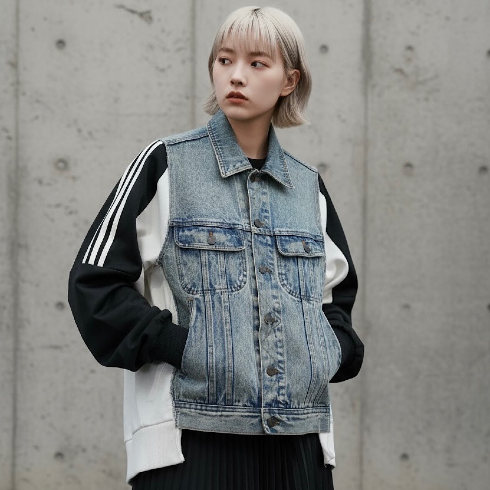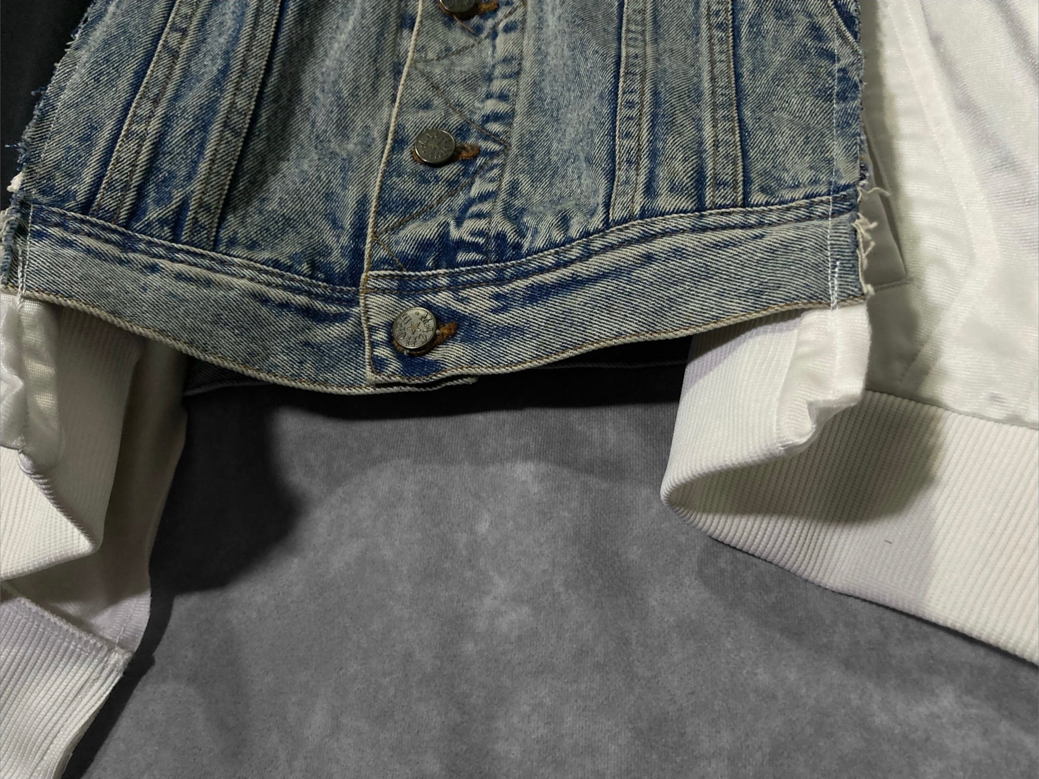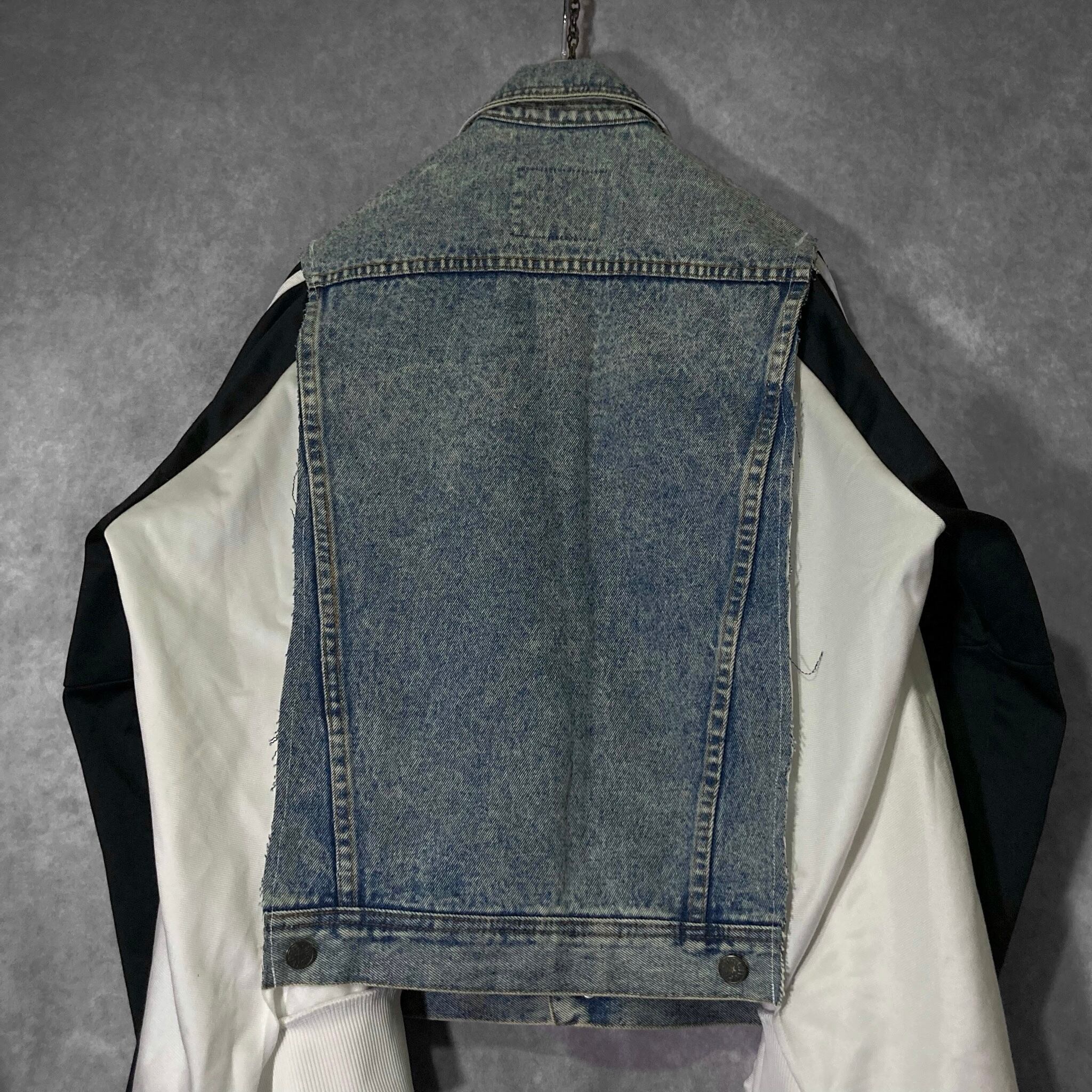 ストライプのサイドラインのトラックジャージとウォッシュとアタリによるコントラストが美しいグランジ感のあるヴィンテージデニムをドッキングさせた再構築ジャケット。
