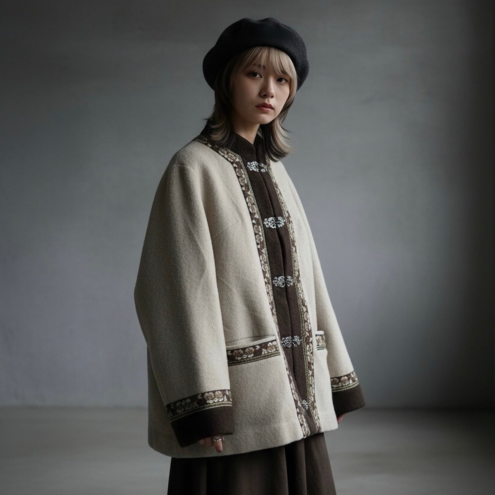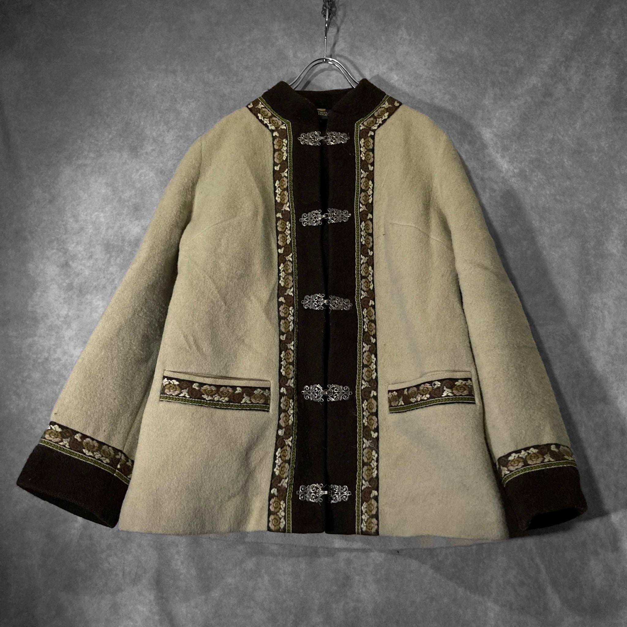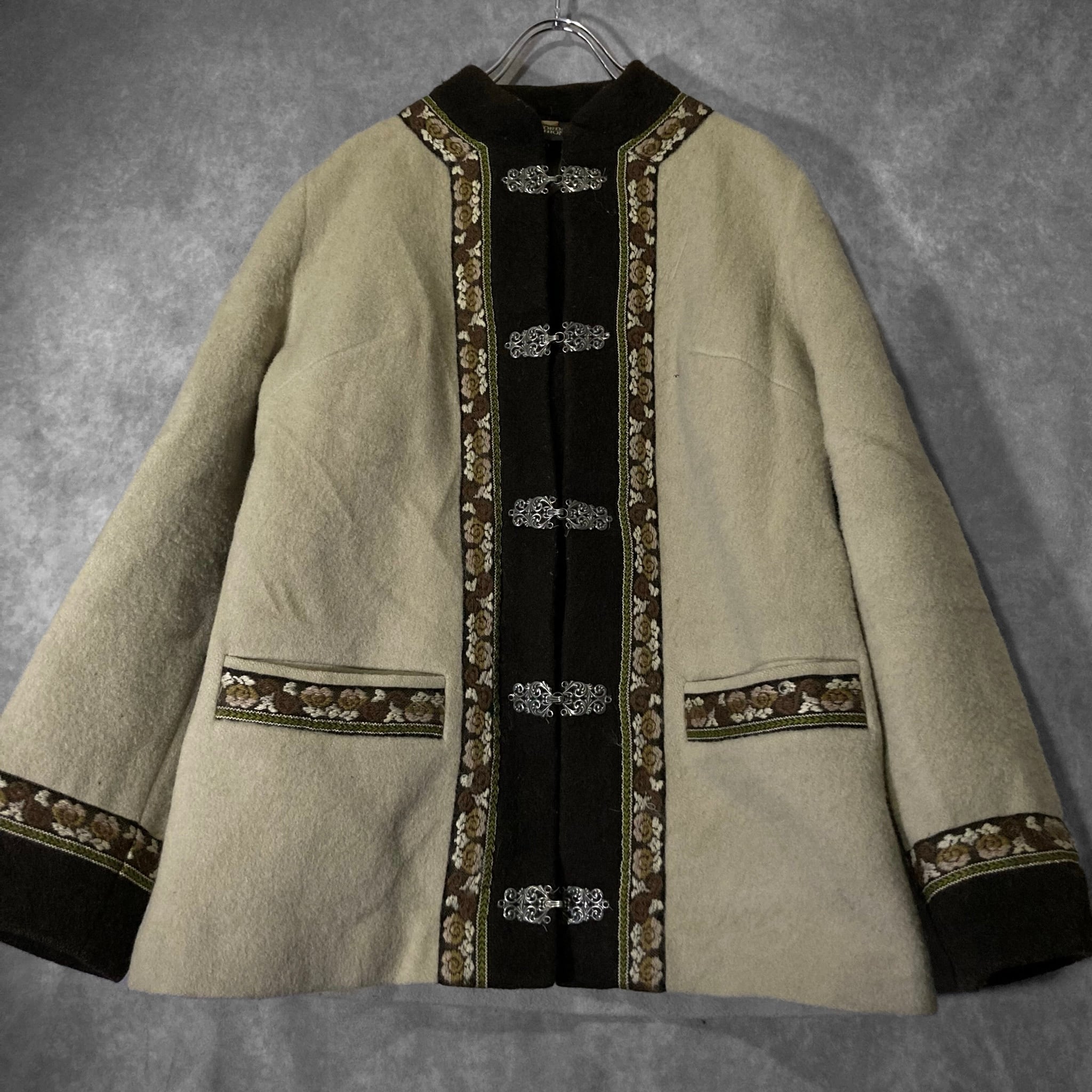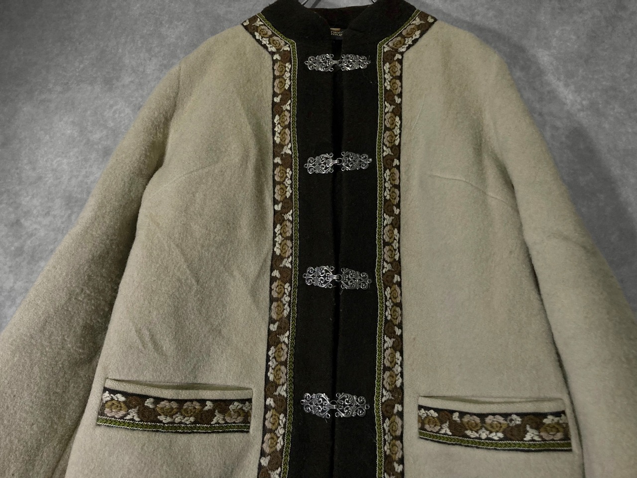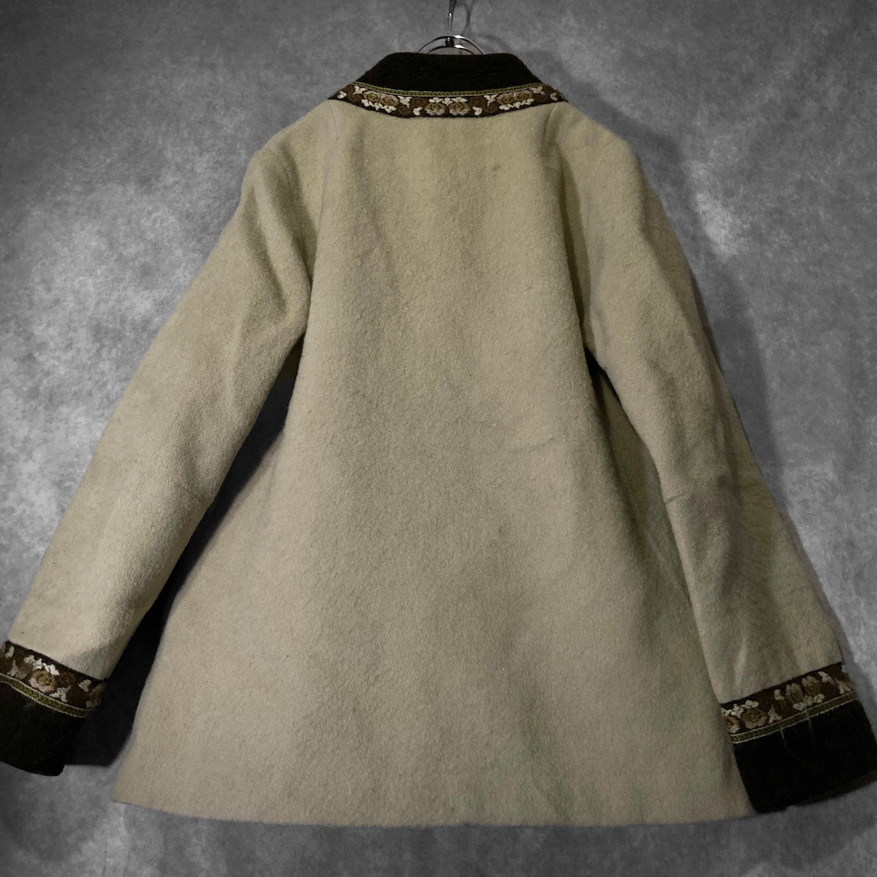 手触りのいい上質なウールの生地にグラデーションの効いた渦模様の総柄をフロントのボタンライン、ポケット、袖口に配した暖かみを感じるデザイン。