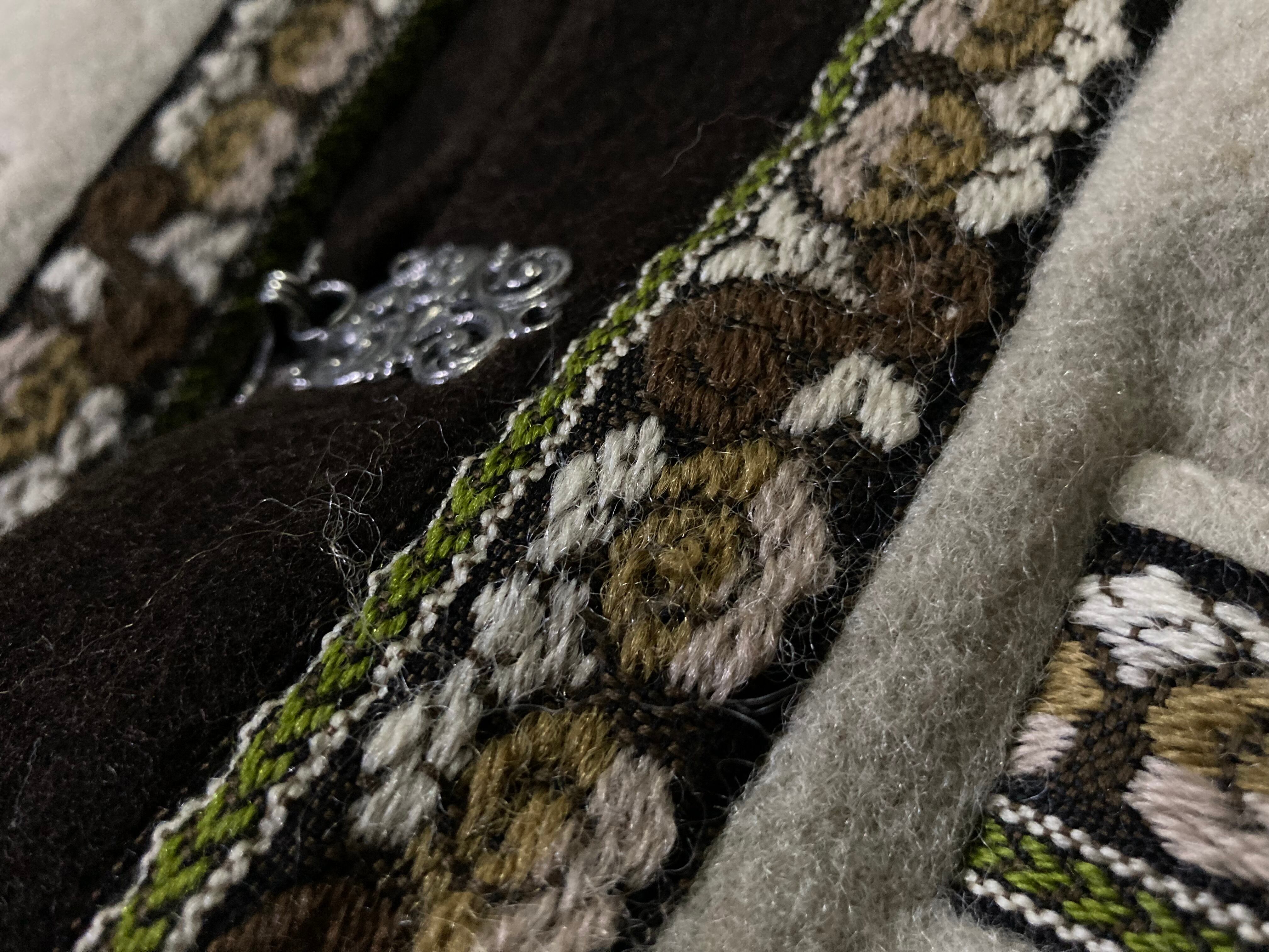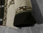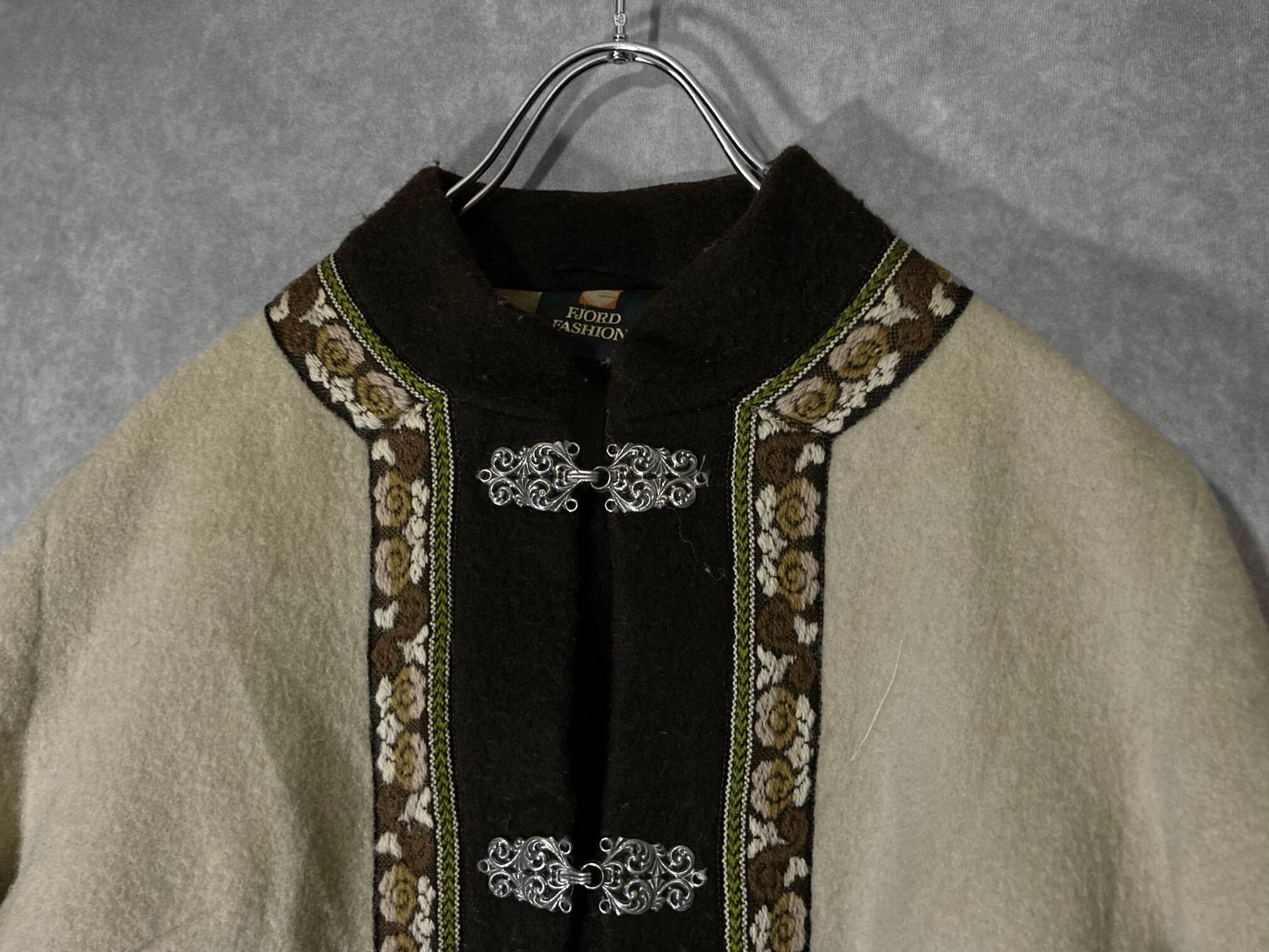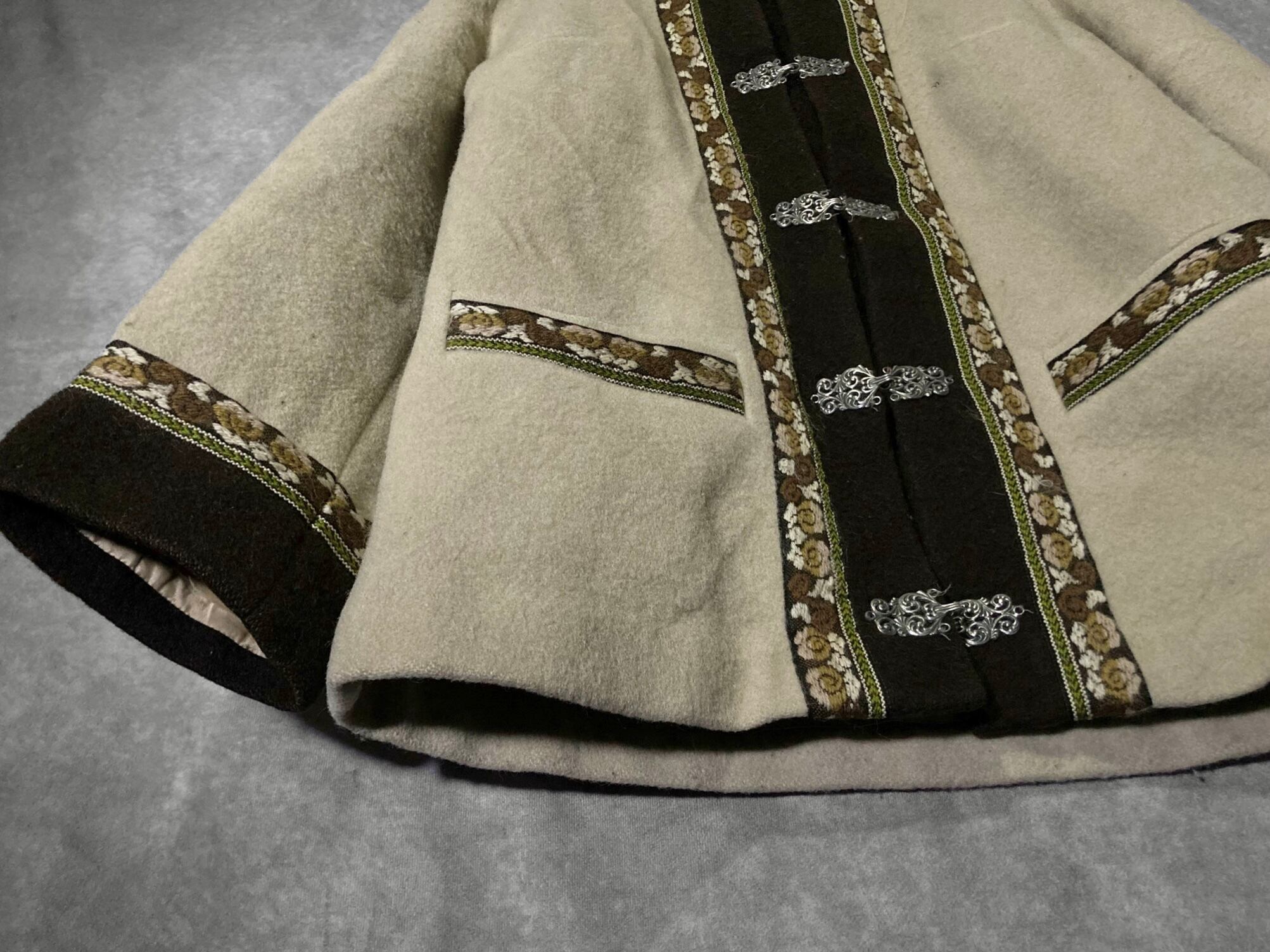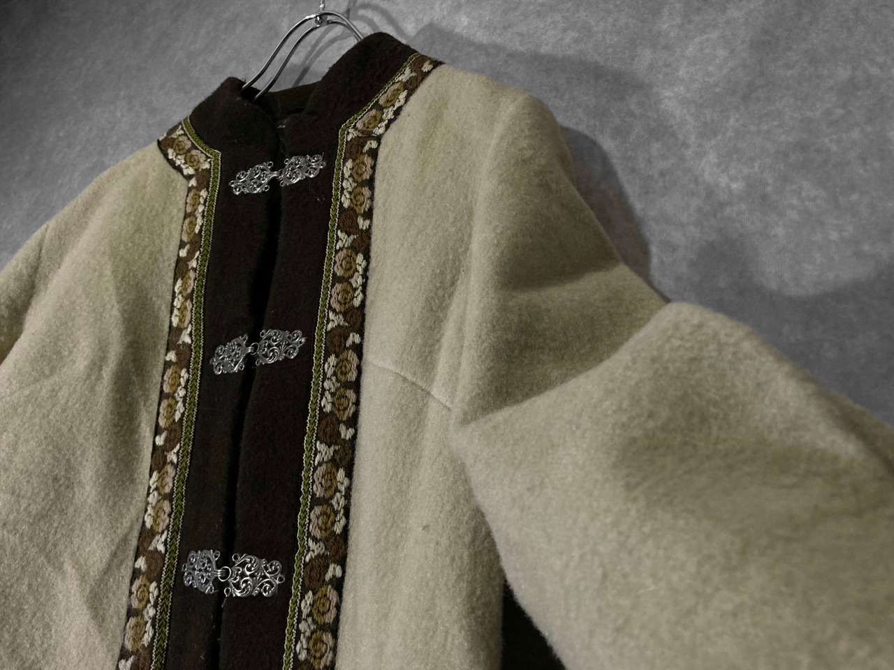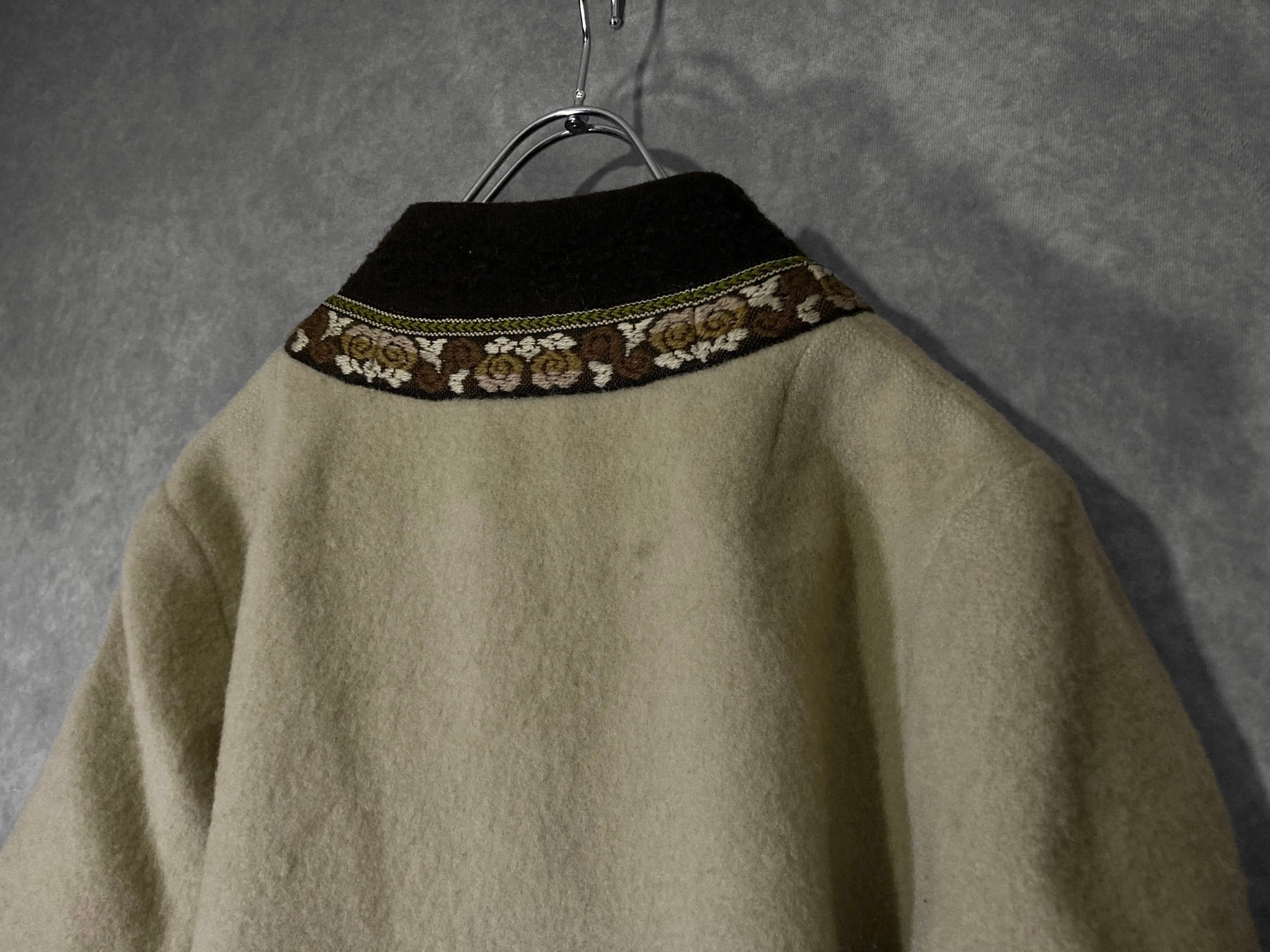 手触りのいい上質なウールの生地にグラデーションの効いた渦模様の総柄をフロントのボタンライン、ポケット、袖口に配した暖かみを感じるデザイン。