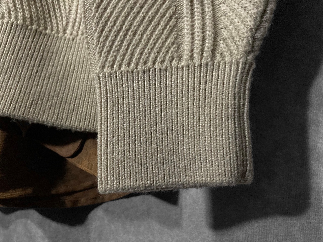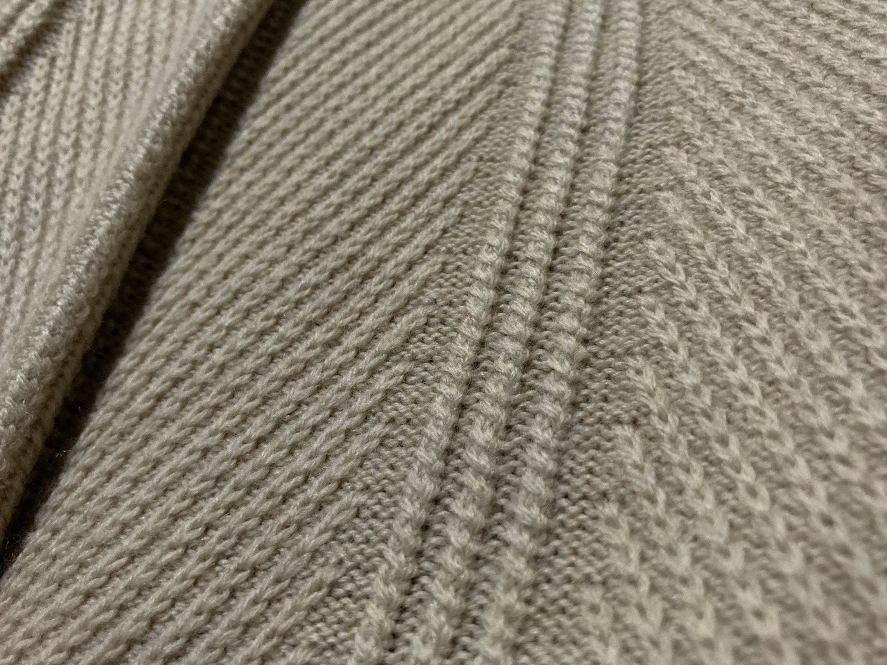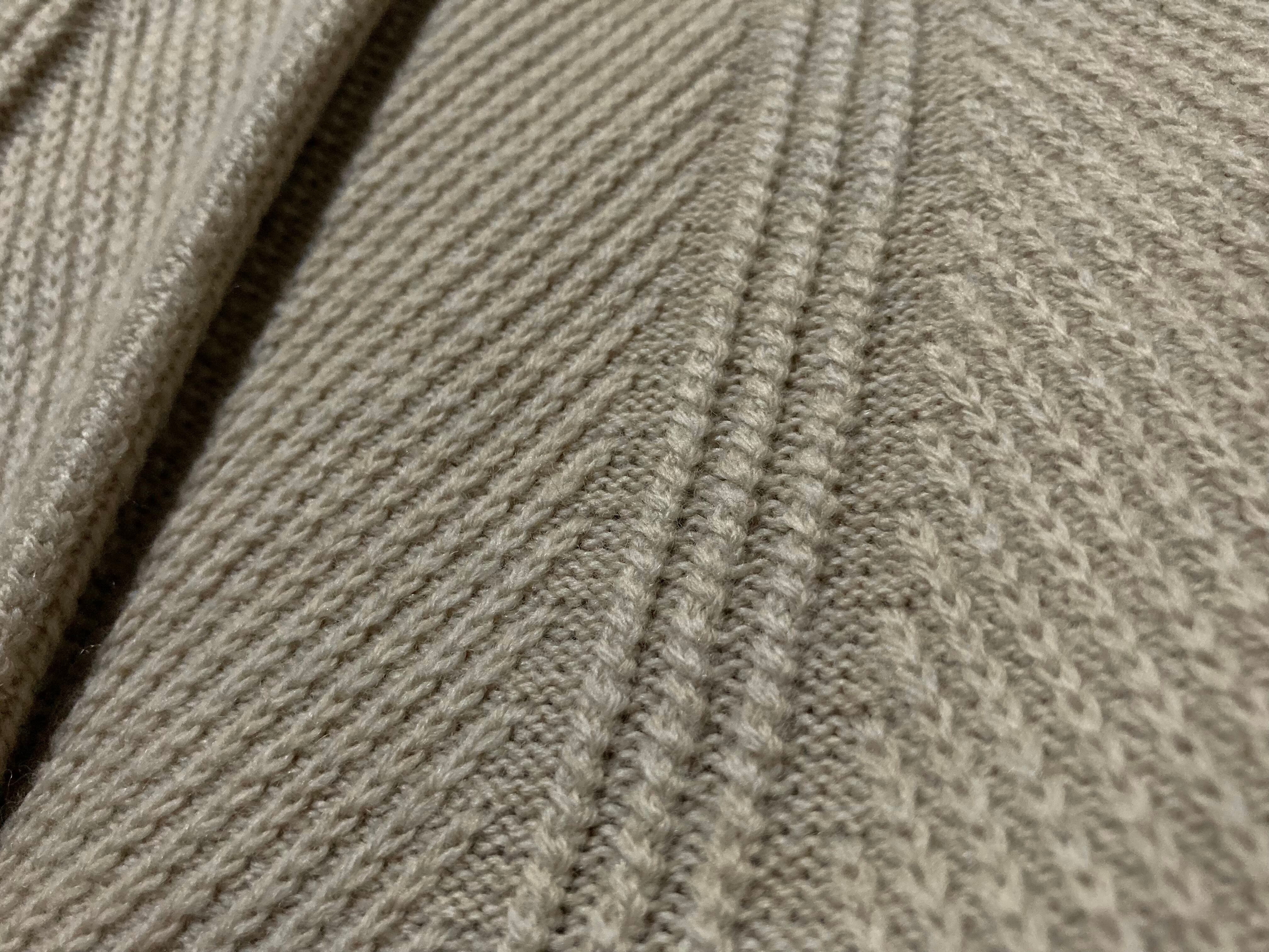 ウールを使用した厚手のニットのファブリックと、3Dニットのように浮き出たストライプ模様がモダンな雰囲気のある佇まい。