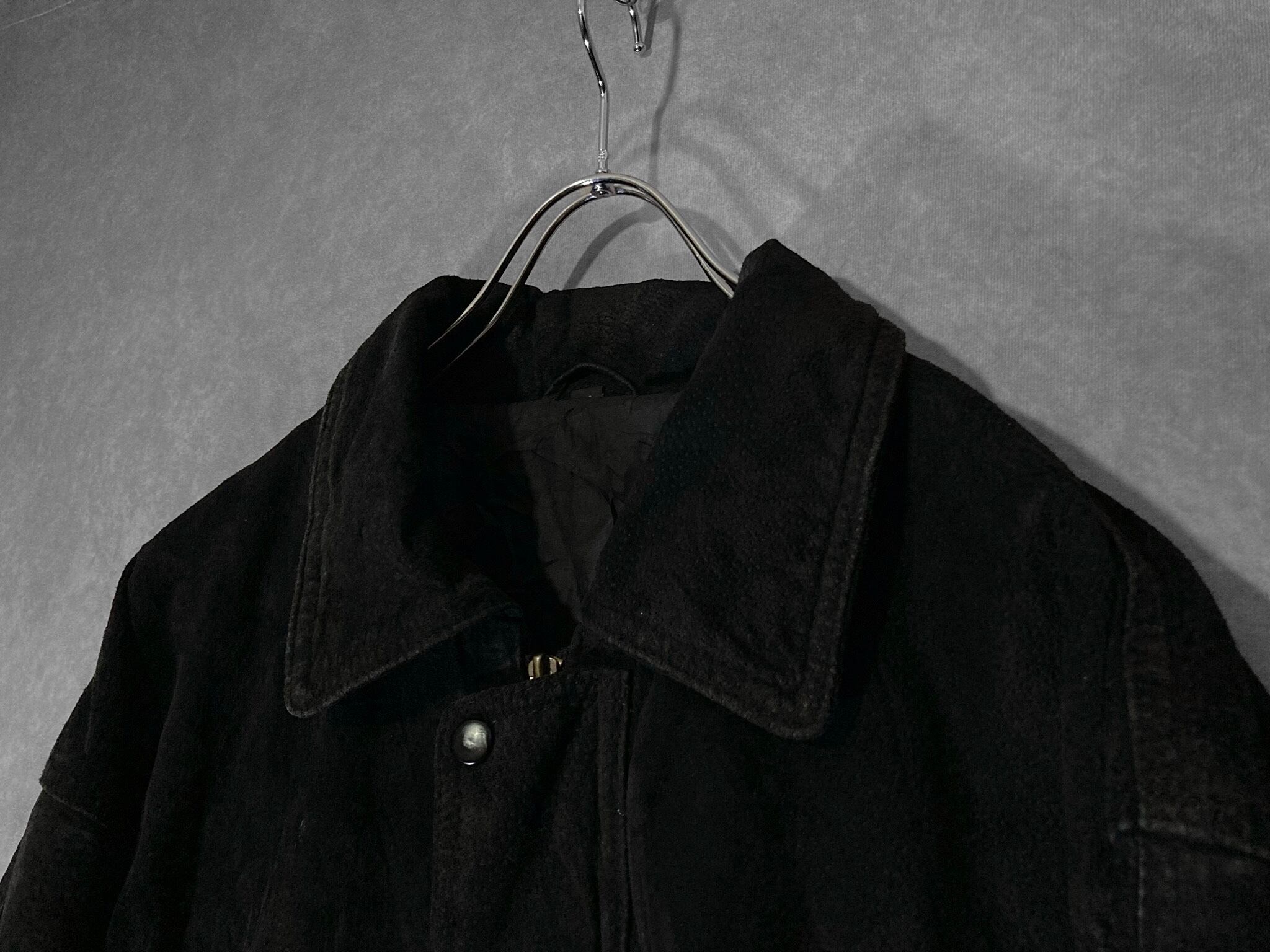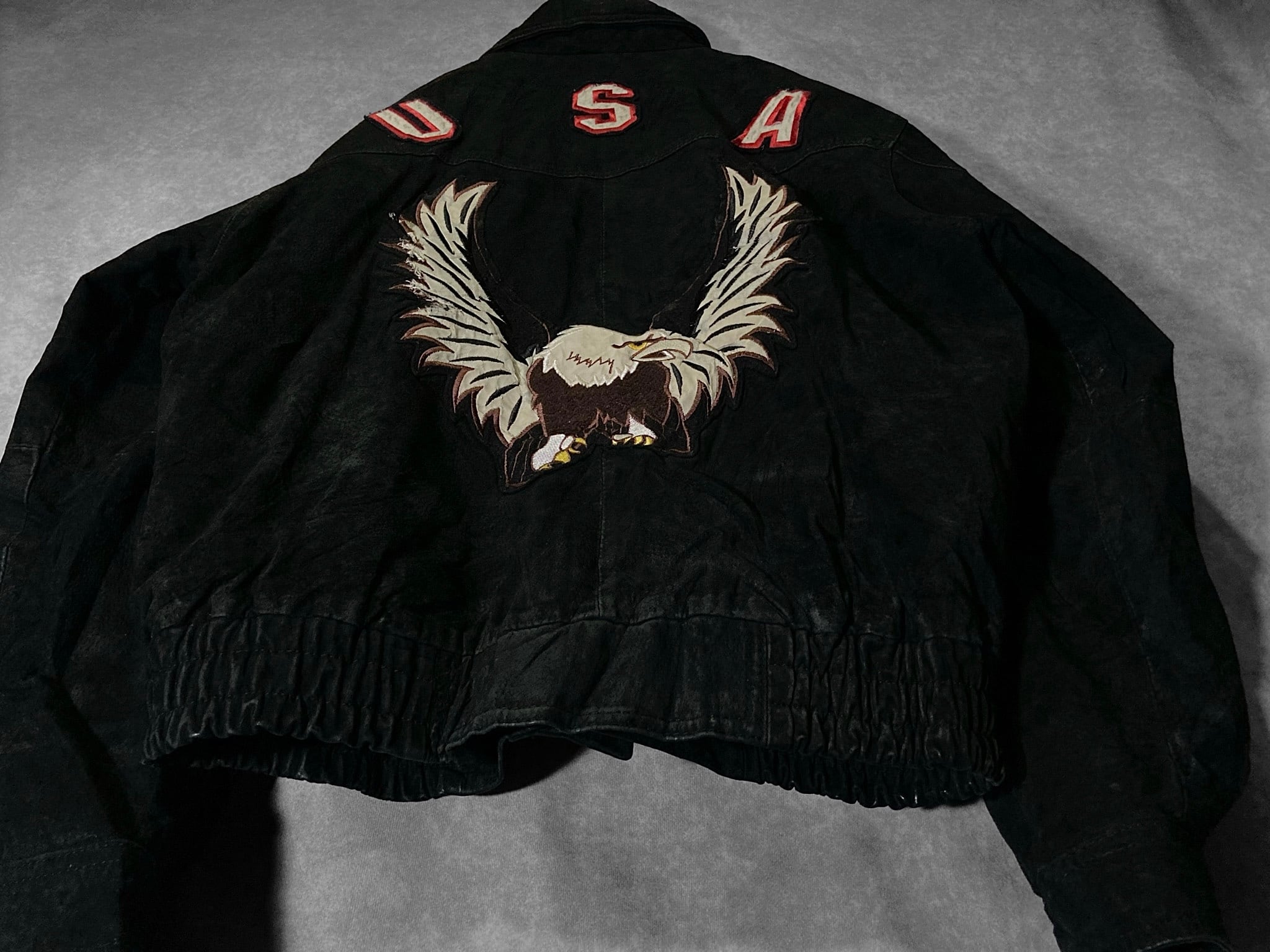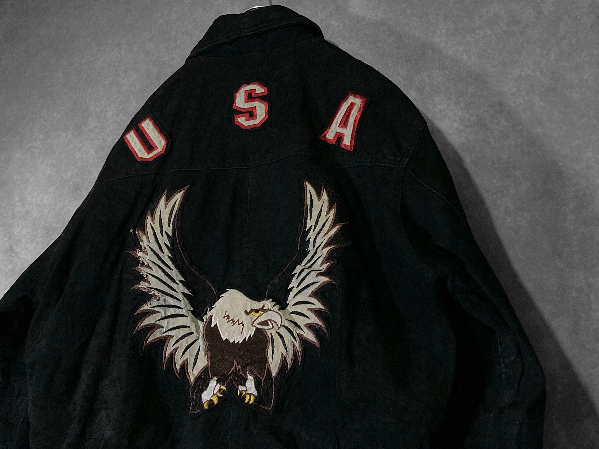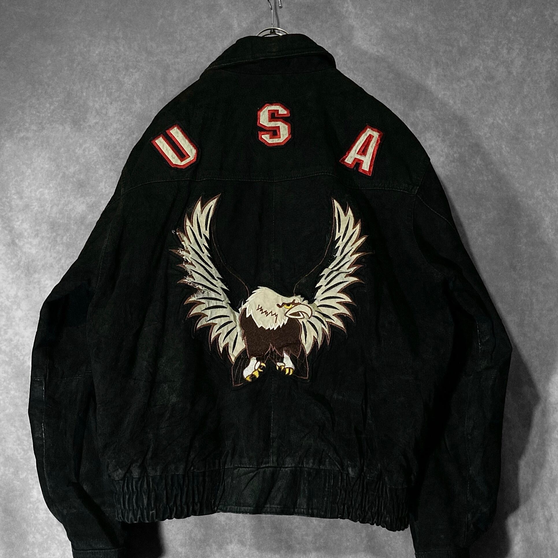 XL 80-90's pig skin leather fabric Falcon and USA logo emboss letter design vintage full-zip jacket