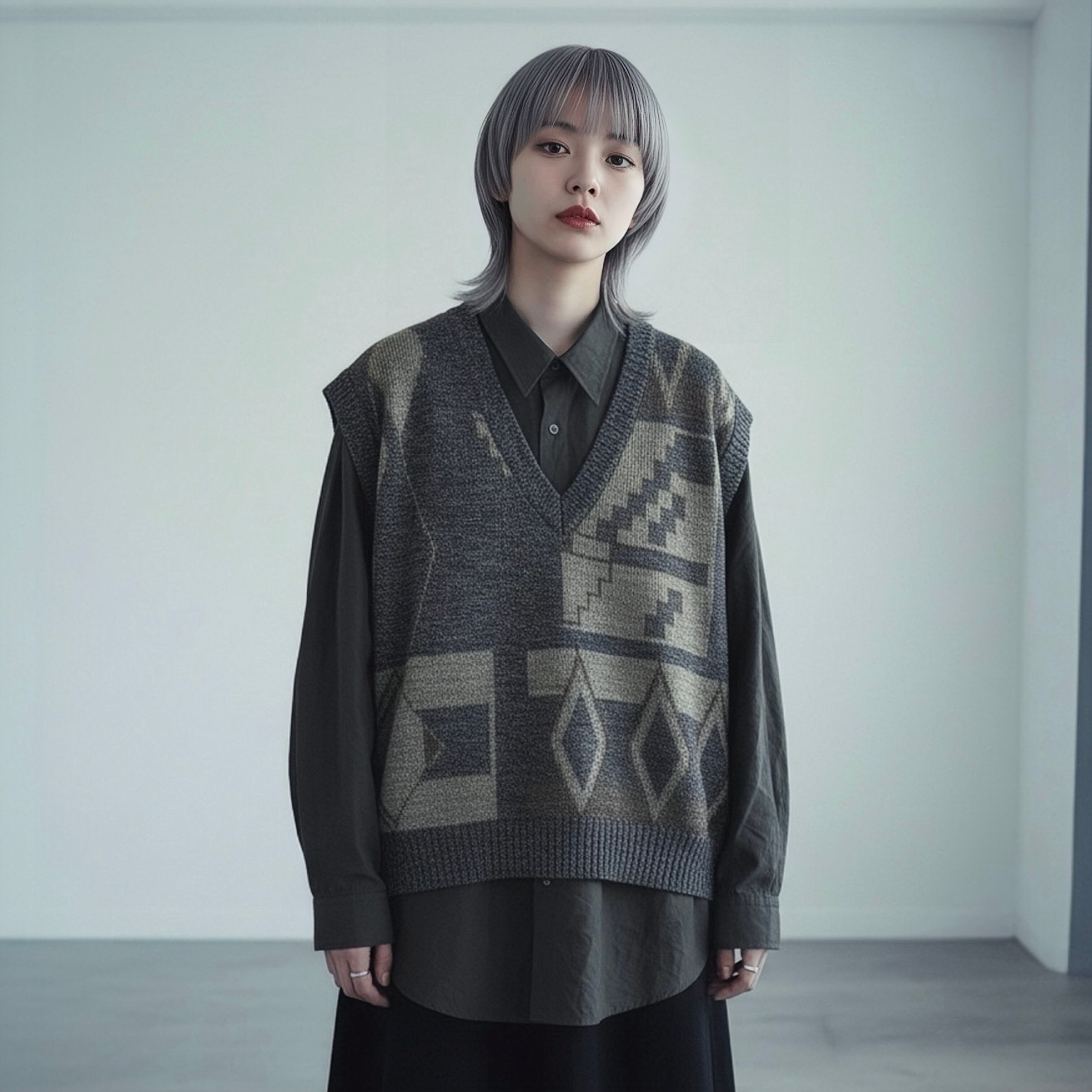 ふんわりモコモコに編まれたローゲージニットにアシンメトリーな幾何学柄がデザインされたニットベスト。