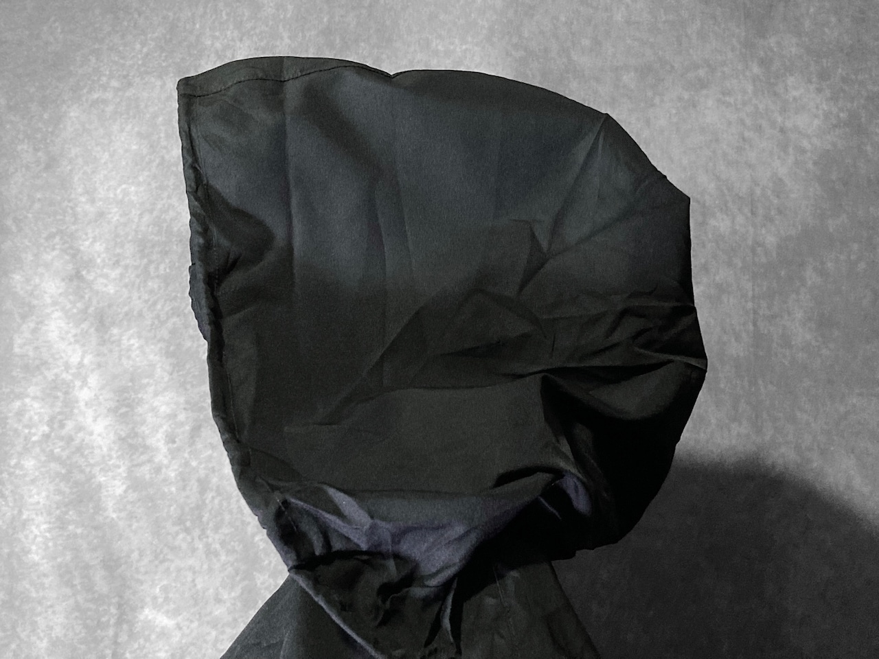 首もとにはジップで出し入れ可能なフードが付いており、ドローコードで調節可能。