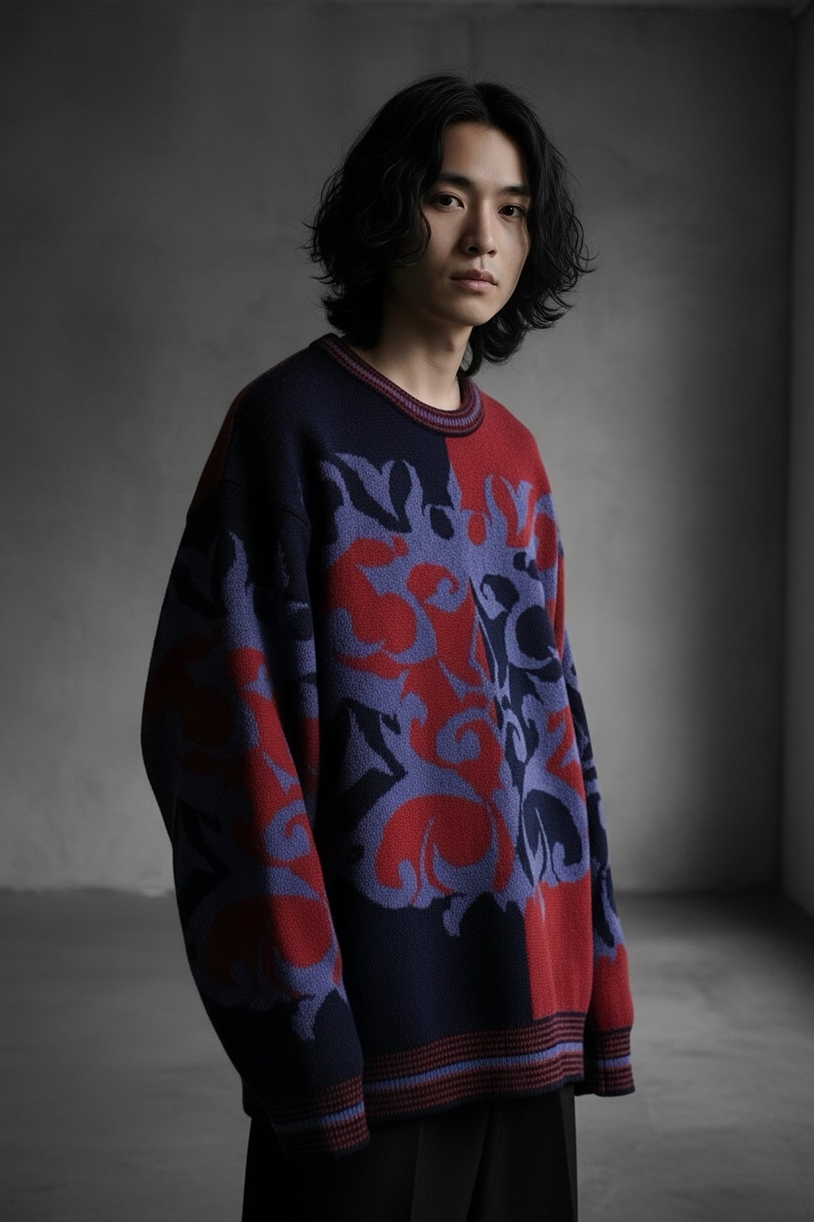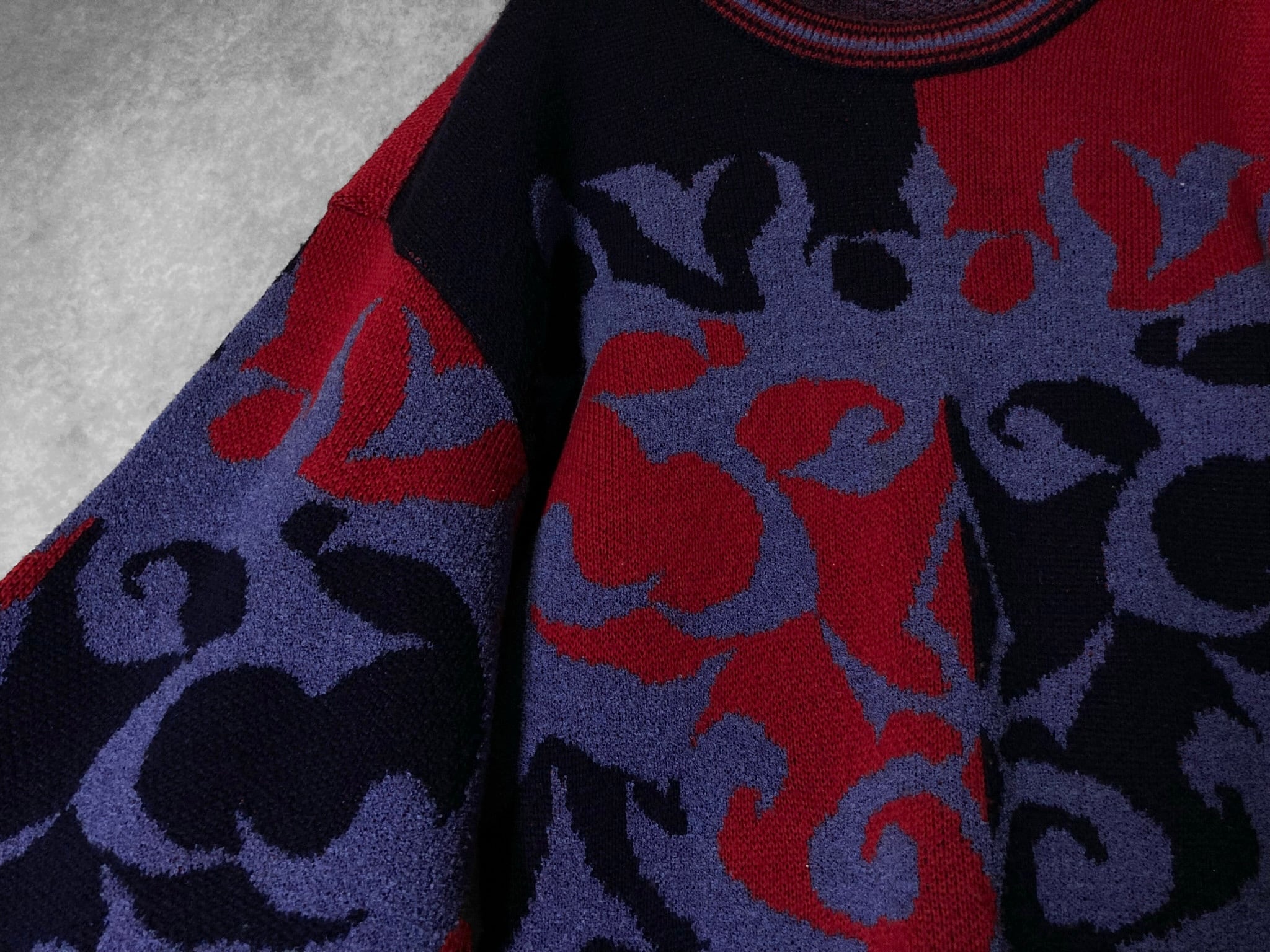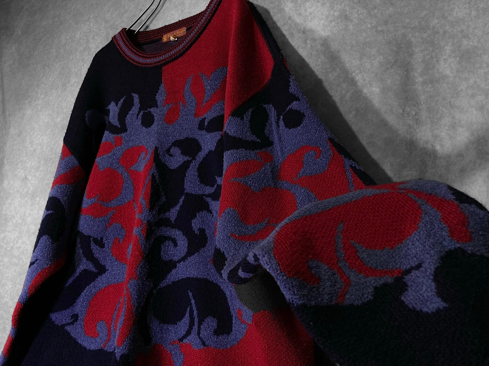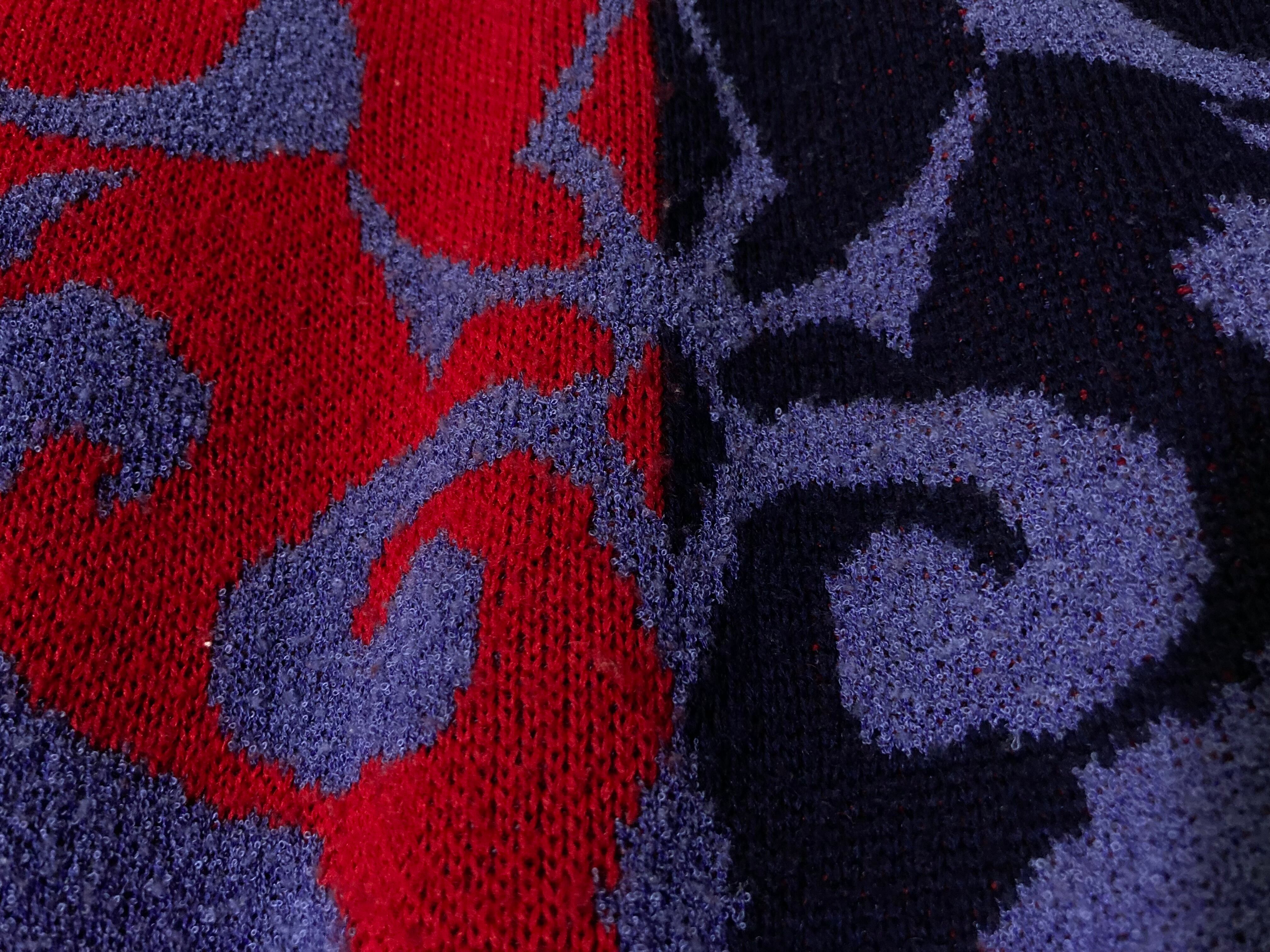 当店で単品や福袋などで毎回ご好評いただいてる厳選したニットコレクションから、ジャパンメイドのメーカーブランド・King & Knights より、鮮やかな赤と紫のコントラストのアート柄が雰囲気ムンムンなスペシャルなニットのご紹介です。