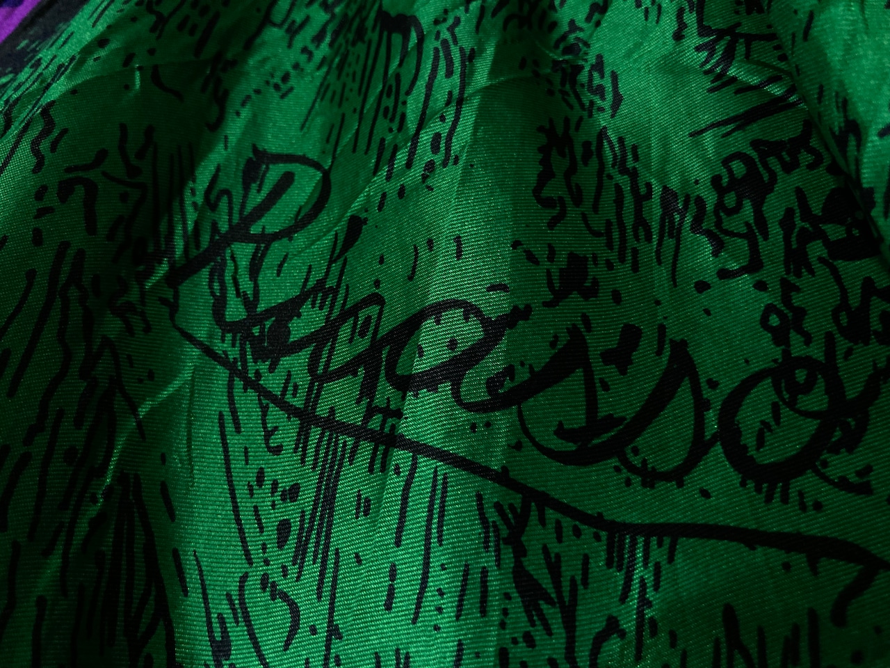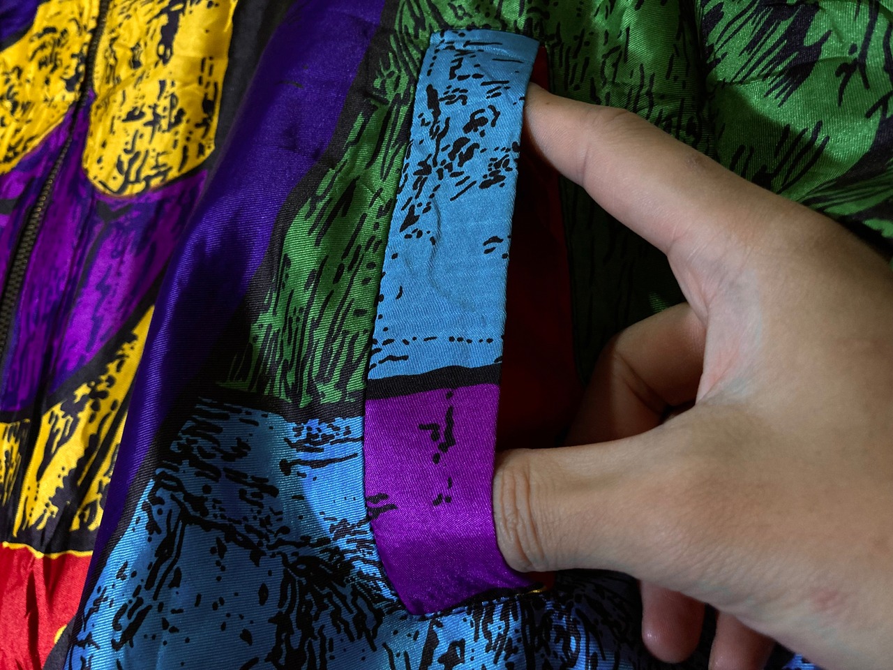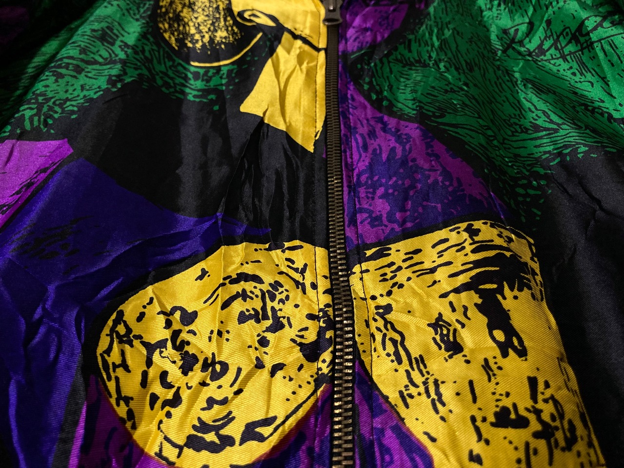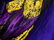 アーティスティックな総柄を際立たせる強い光沢のある生地で存在感があり、部屋に飾っておくだけでインテリアにもなる1着。