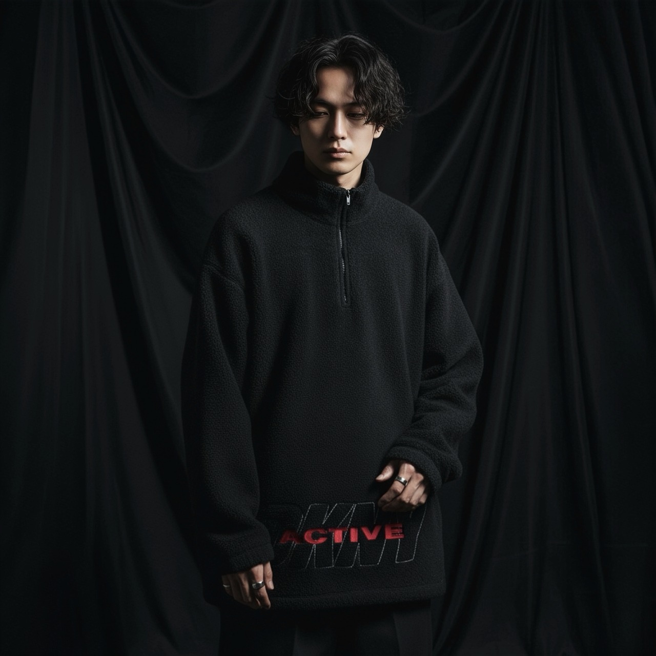 首もとのハーフジップはスポーティーでテックな雰囲気を押し上げ、頭から被りやすい機能性とファッション性の高いディテール。