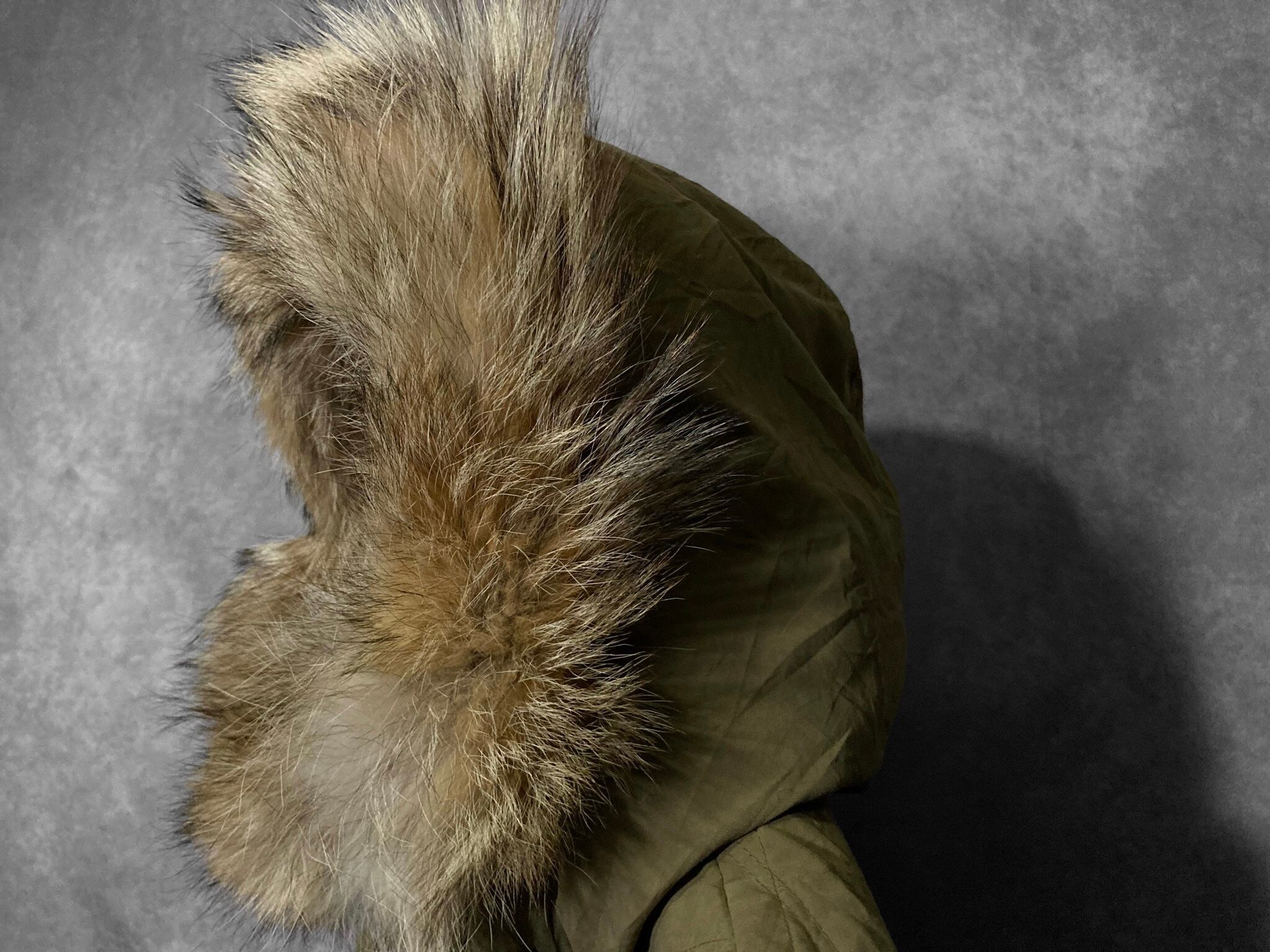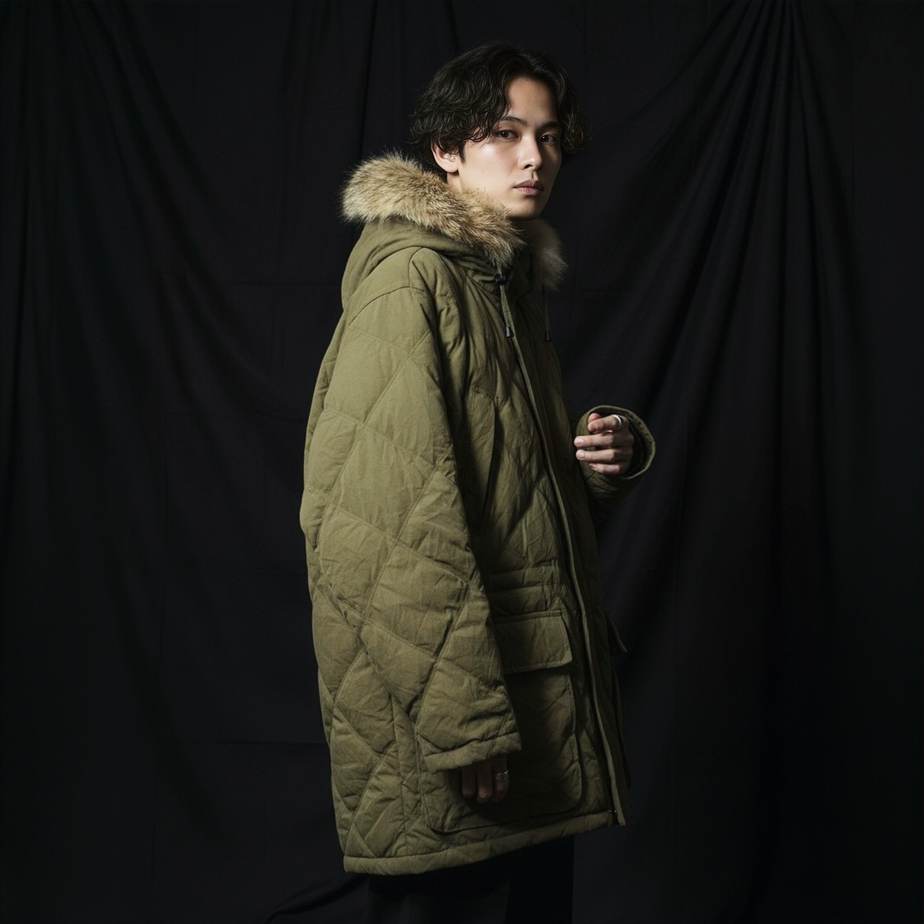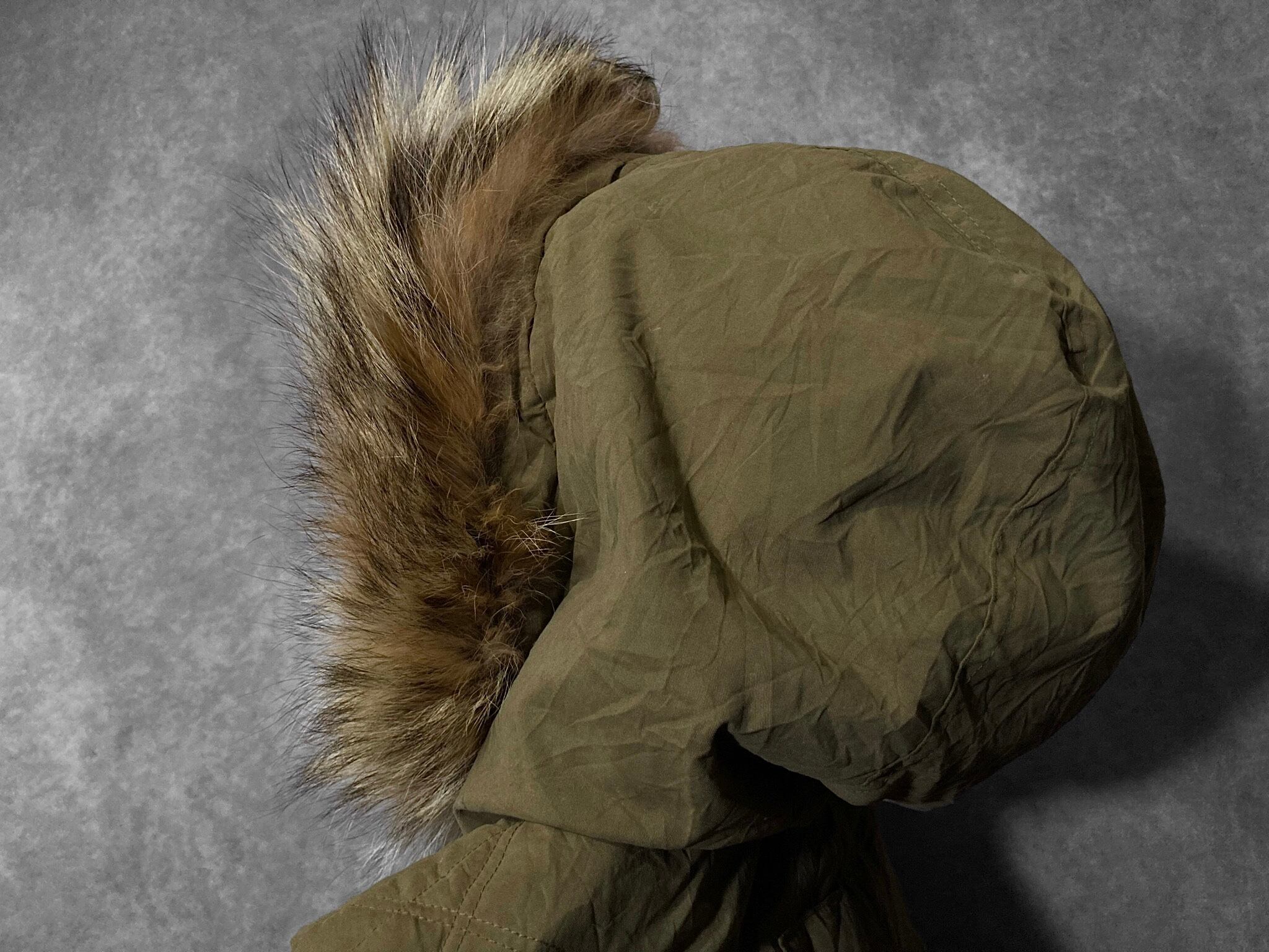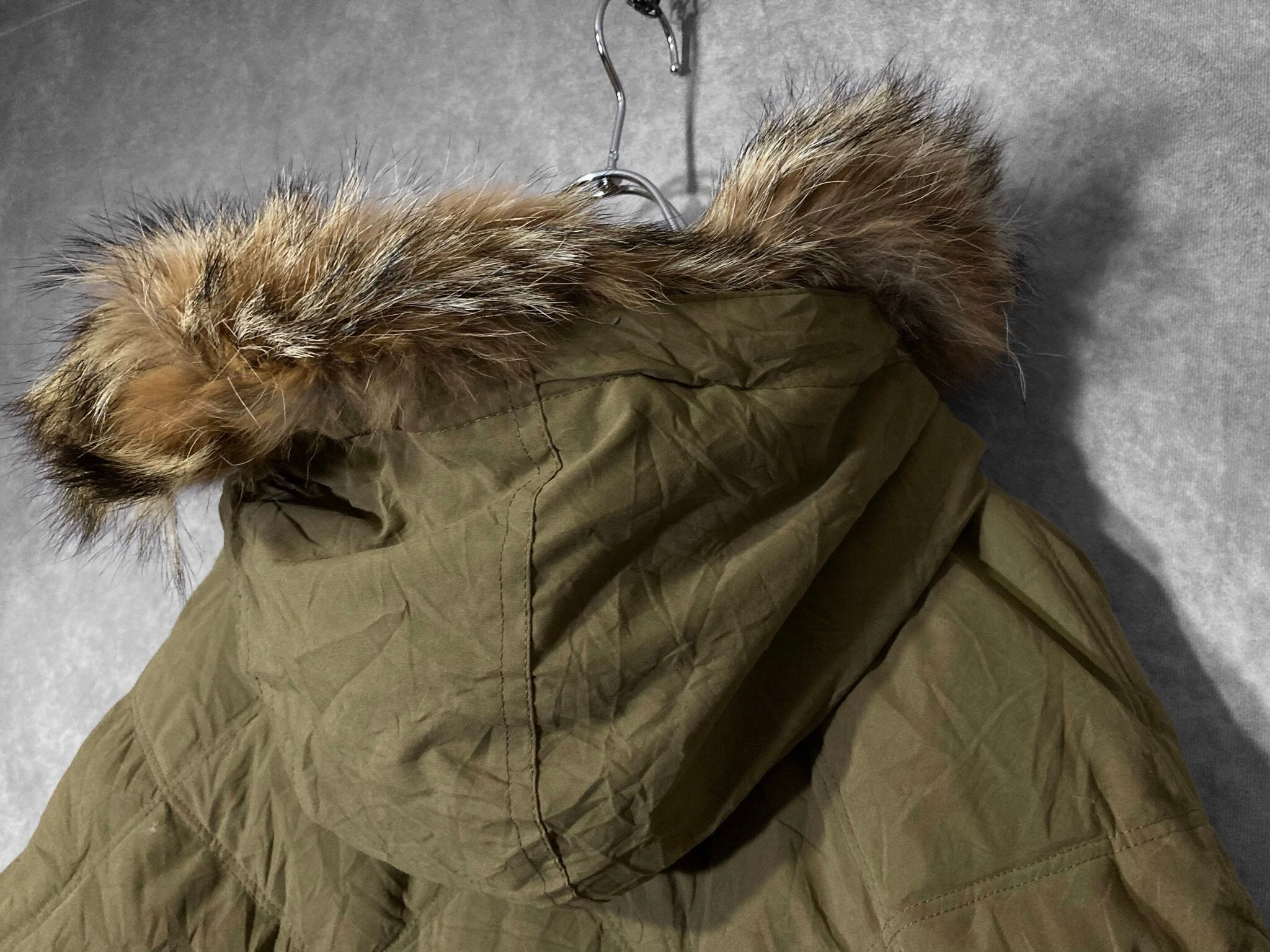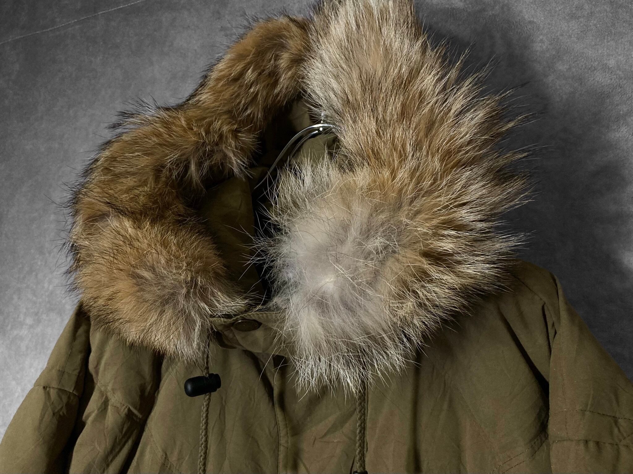 フェイクスウェードのような手触りのいいポリピーチ(ピーチスキン)の生地と高級感のあるフードのファーが特徴的。