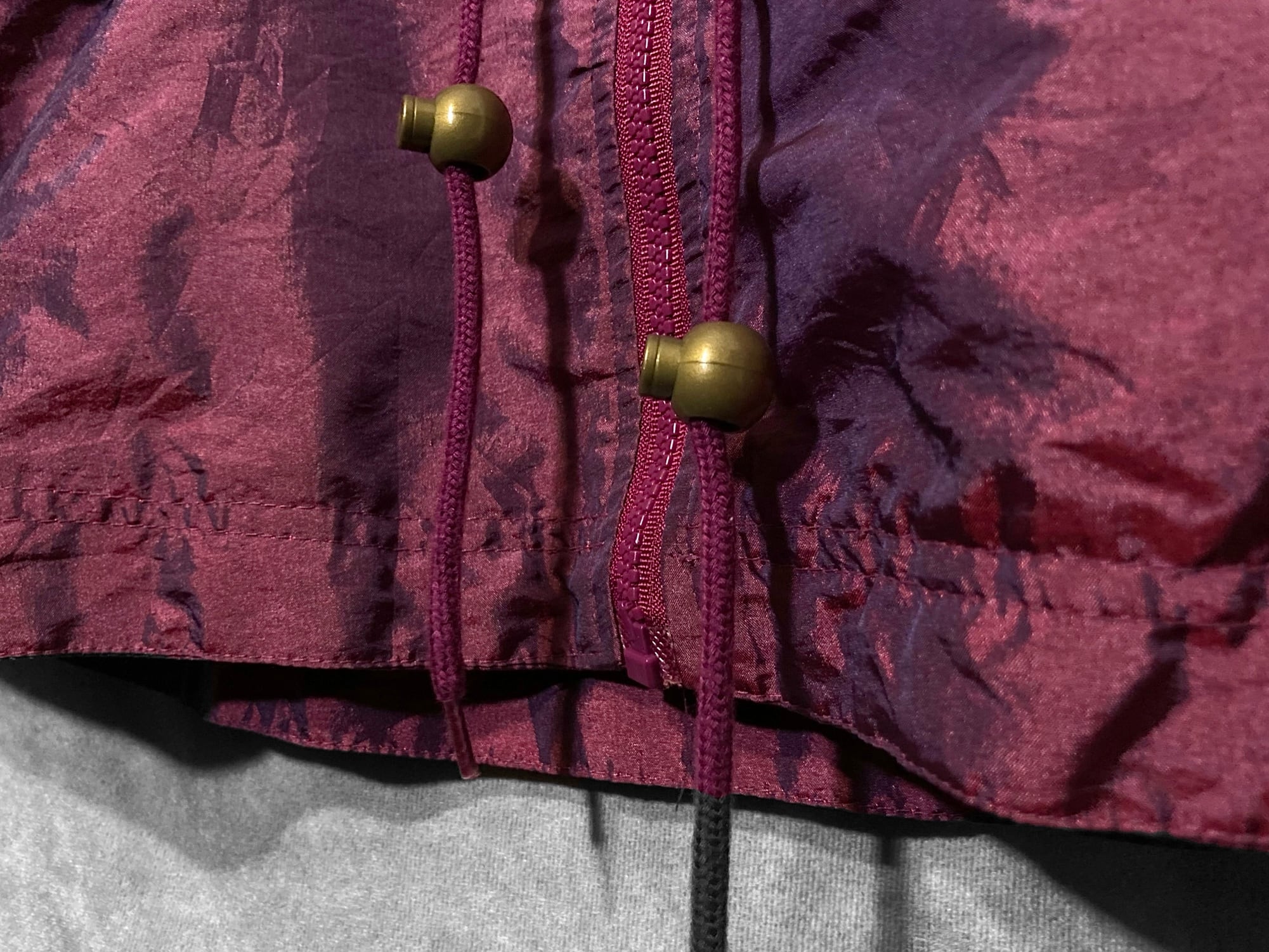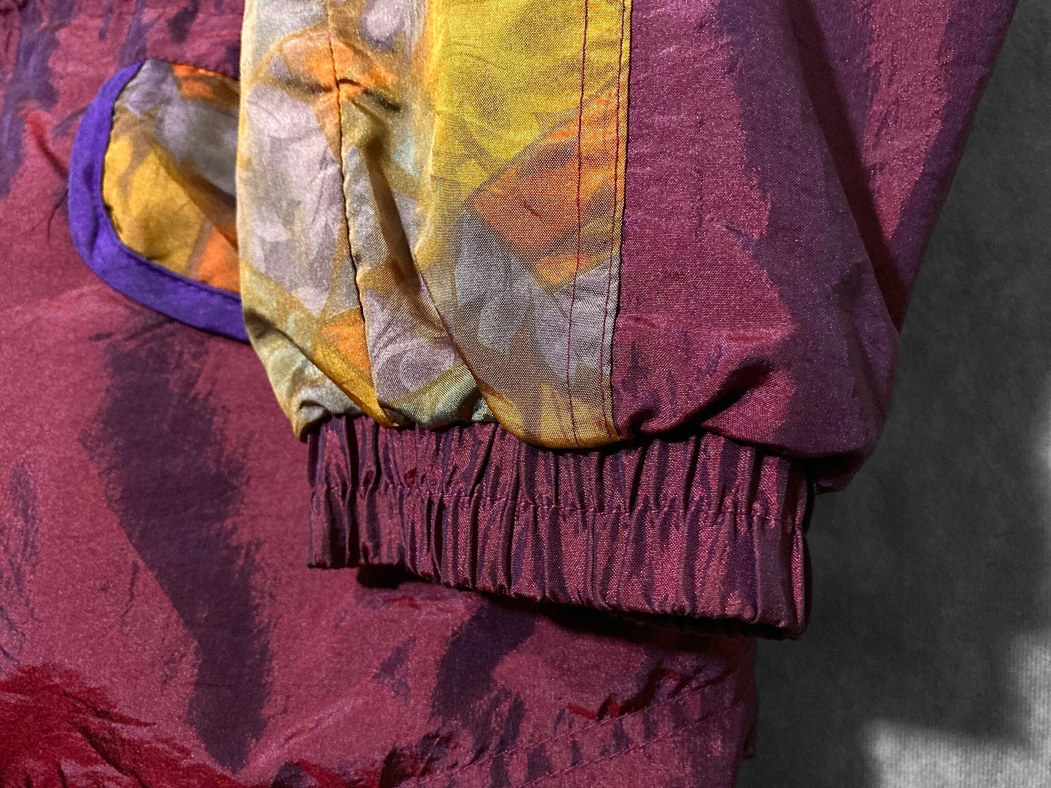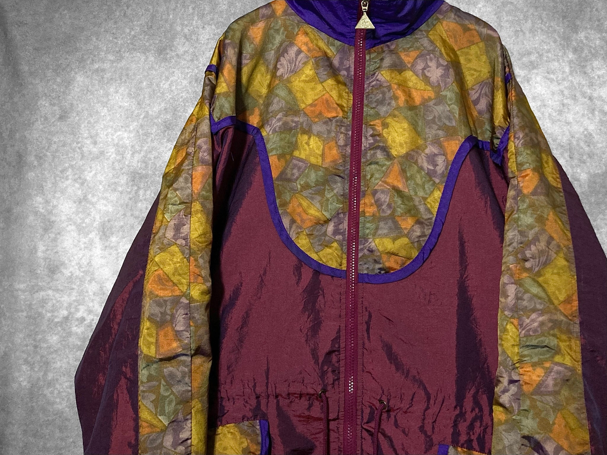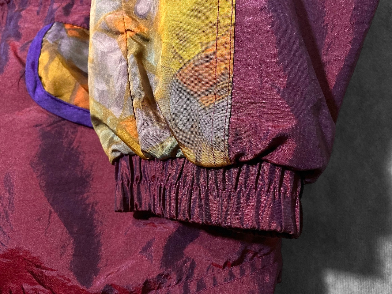 ステンドグラスの向こうに花が見えるような幻想的な総柄の切り替えと妖艶でミステリアスな雰囲気ムンムンなボルドーワインカラーが印象的なナイロンジャケット。