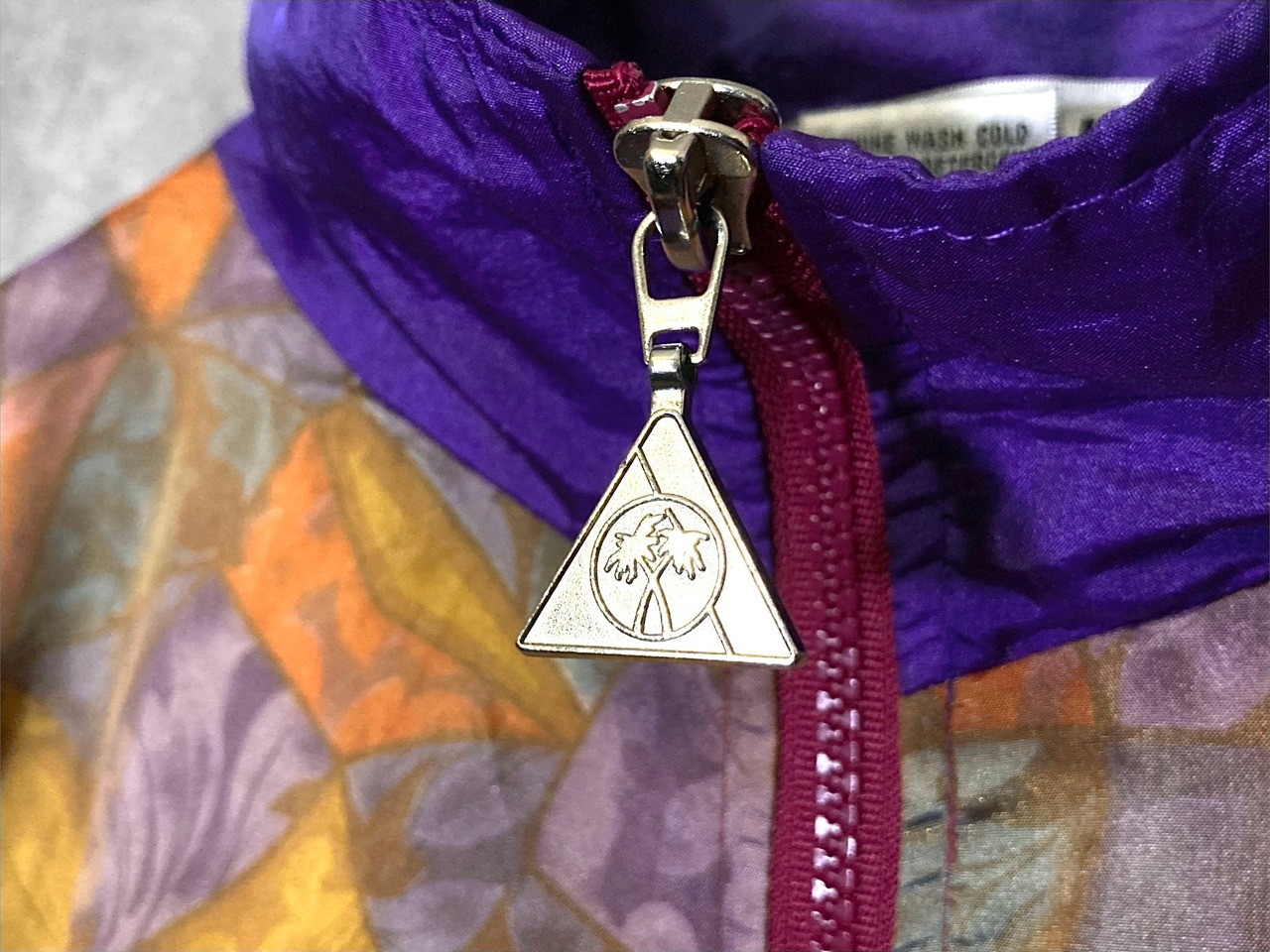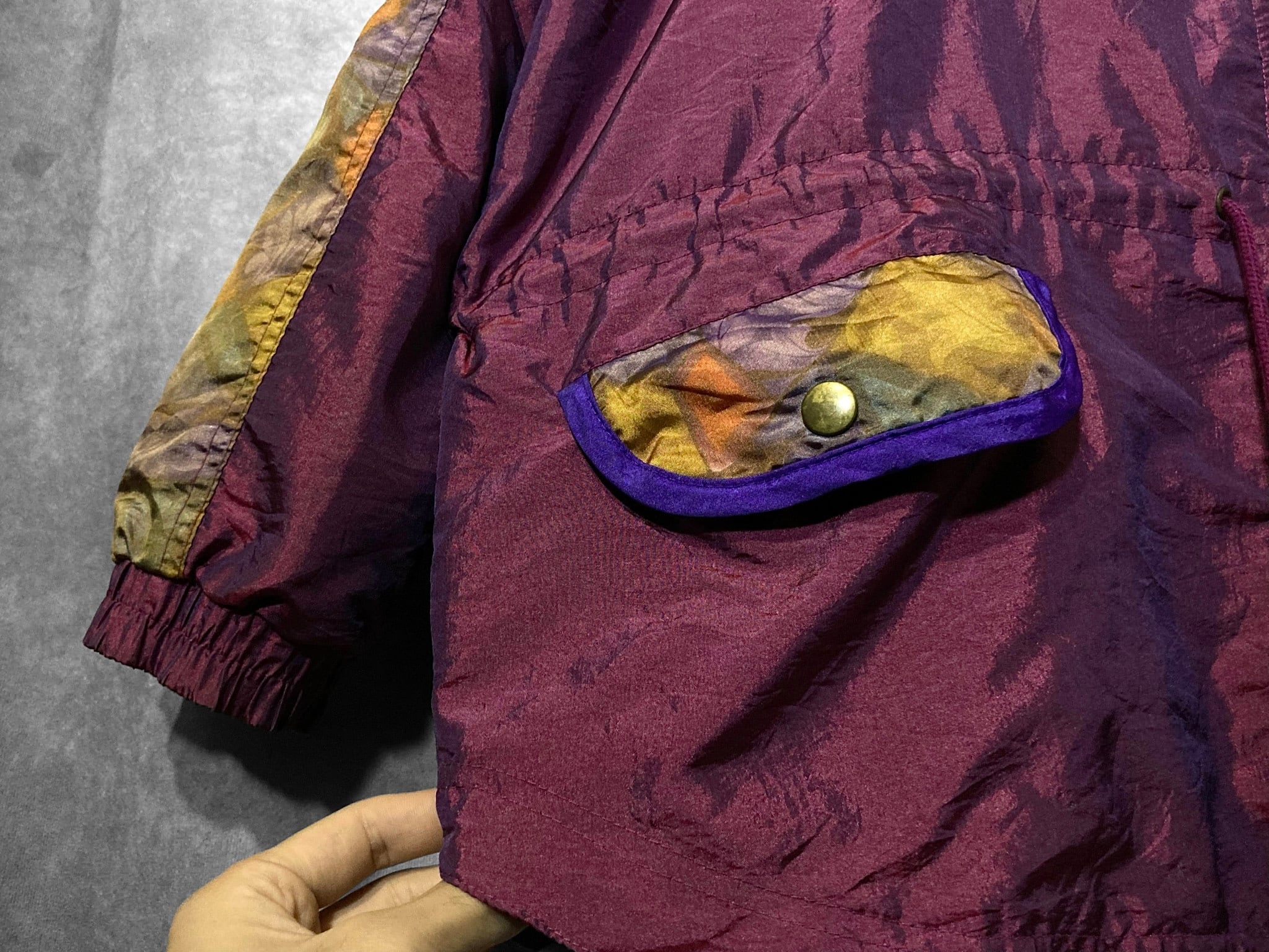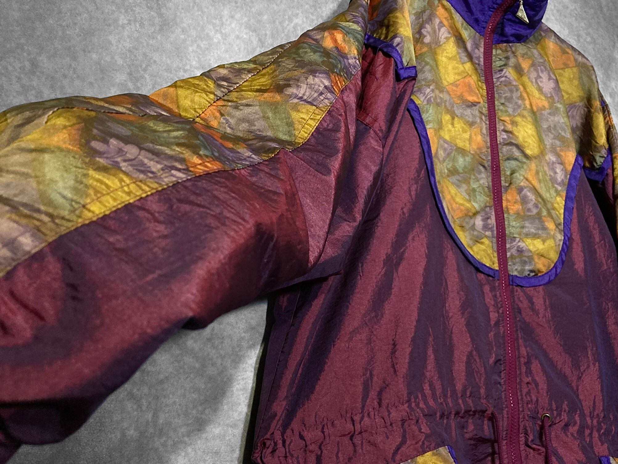 ステンドグラスの向こうに花が見えるような幻想的な総柄の切り替えと妖艶でミステリアスな雰囲気ムンムンなボルドーワインカラーが印象的なナイロンジャケット。