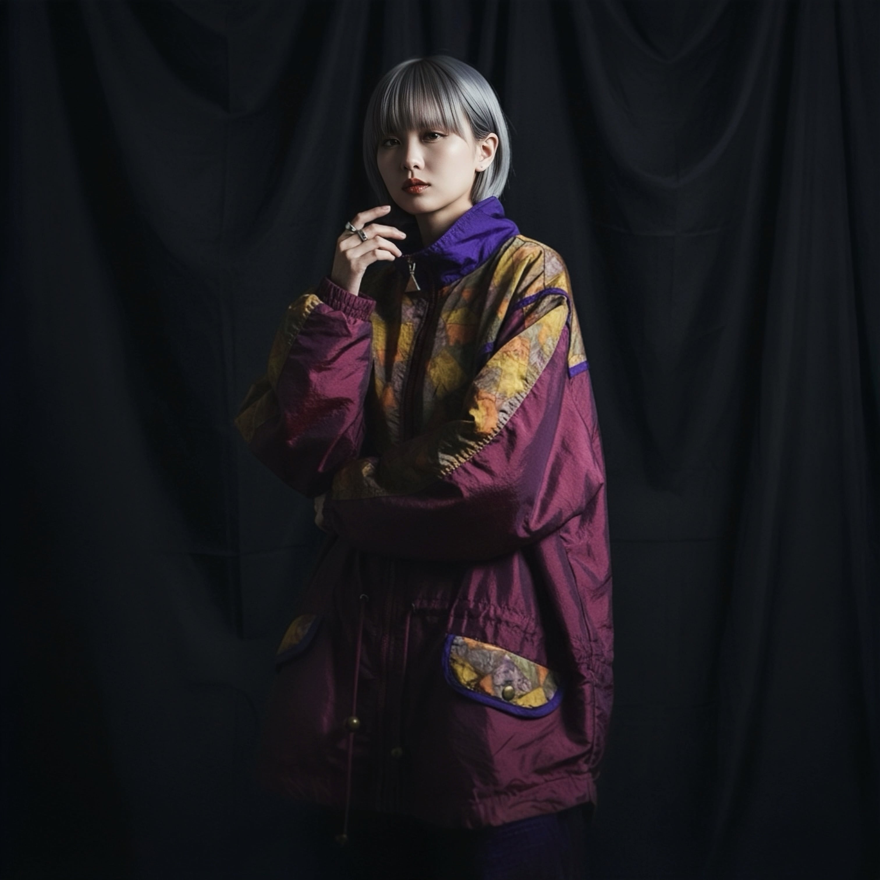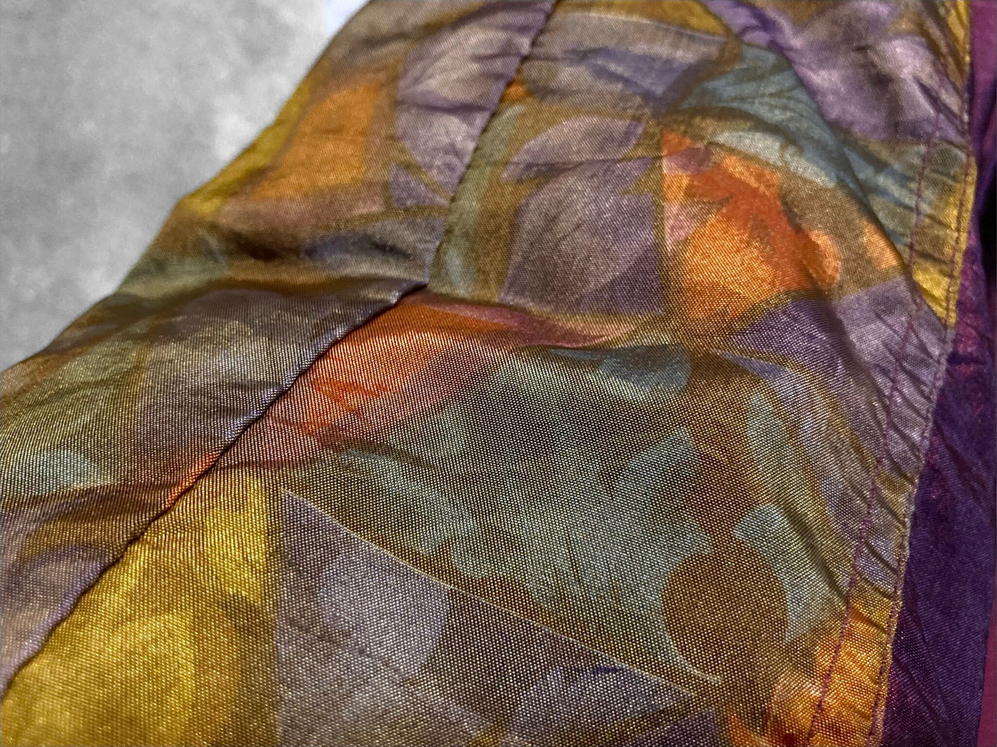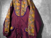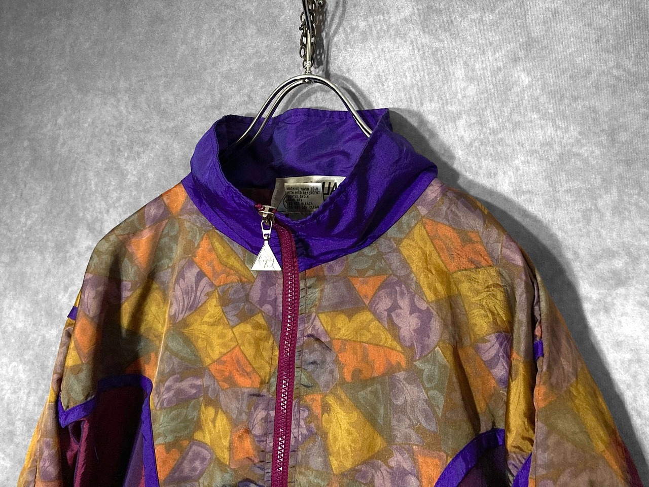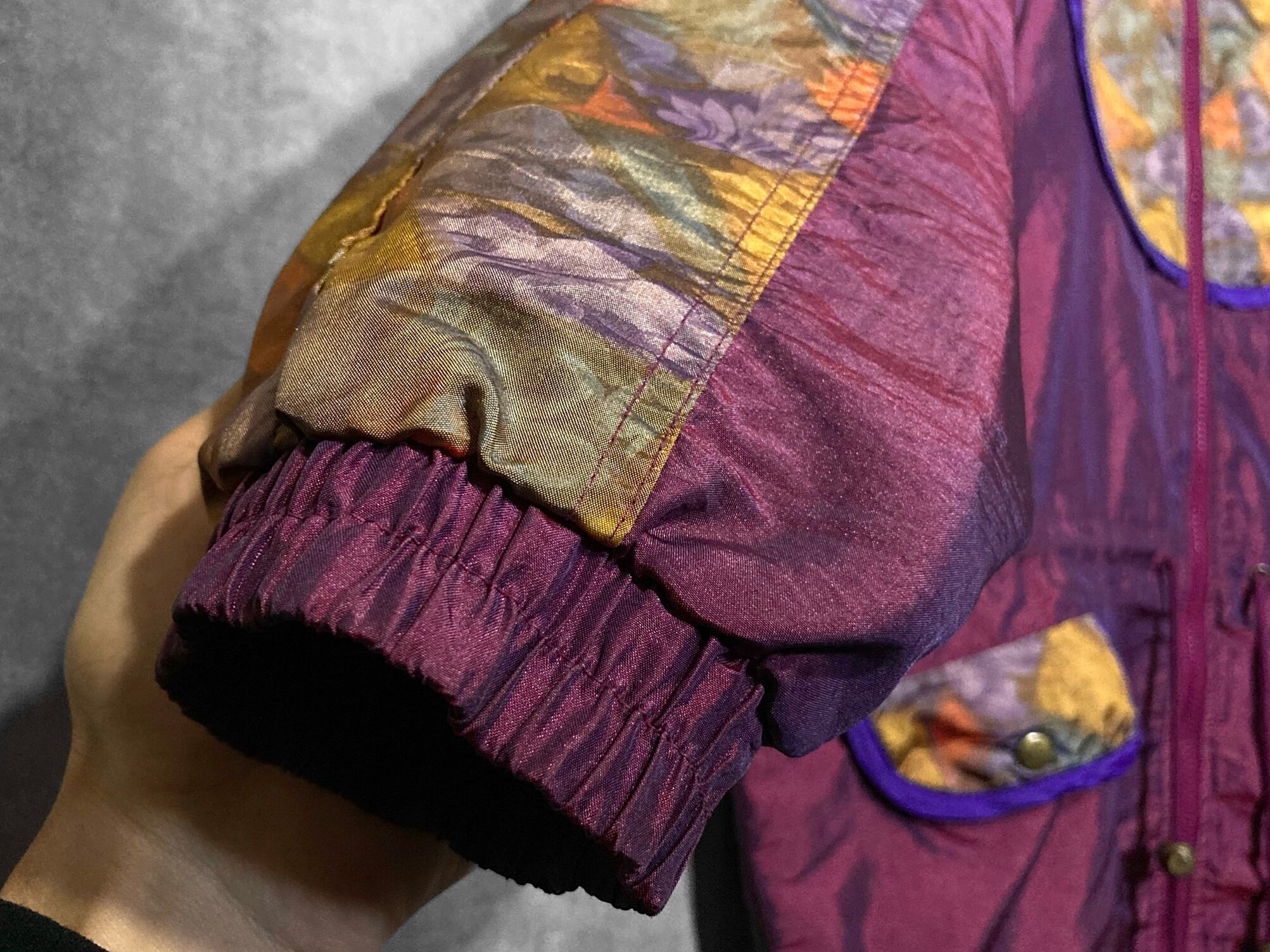 ステンドグラスの向こうに花が見えるような幻想的な総柄の切り替えと妖艶でミステリアスな雰囲気ムンムンなボルドーワインカラーが印象的なナイロンジャケット。