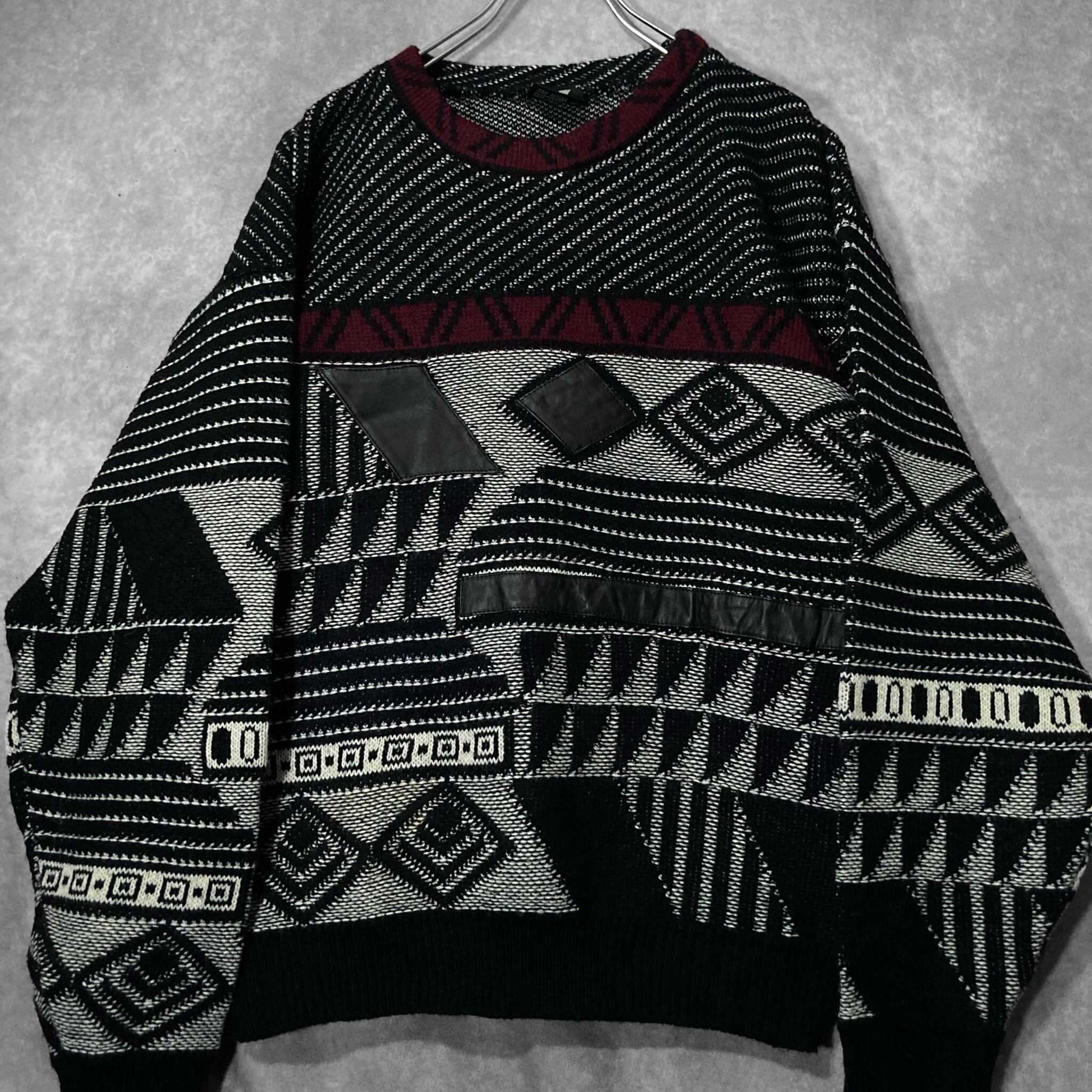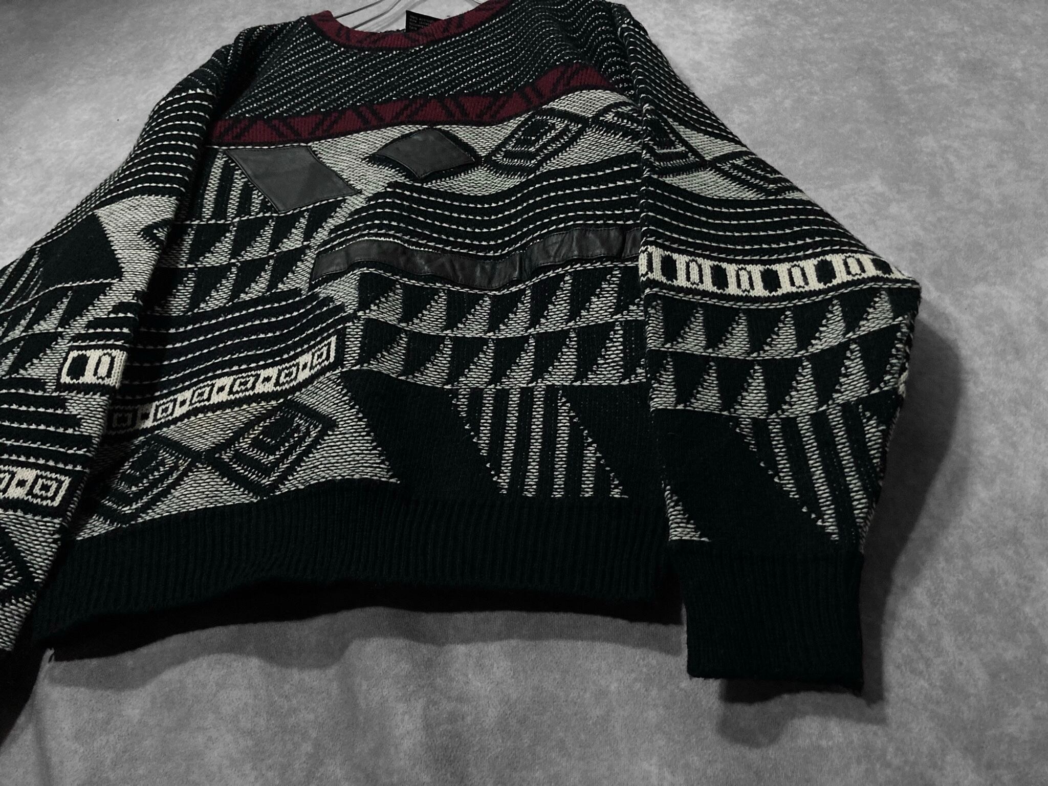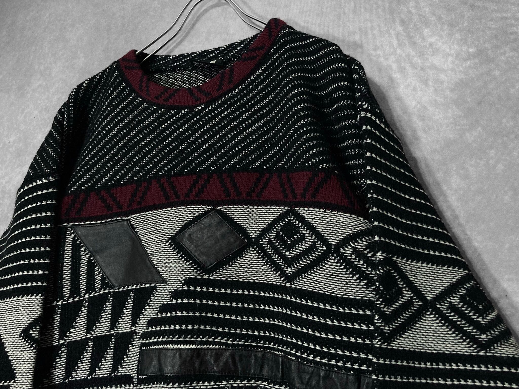 made in Korea, X STAY Leather patchwork and All-over print pattern design knit sweater