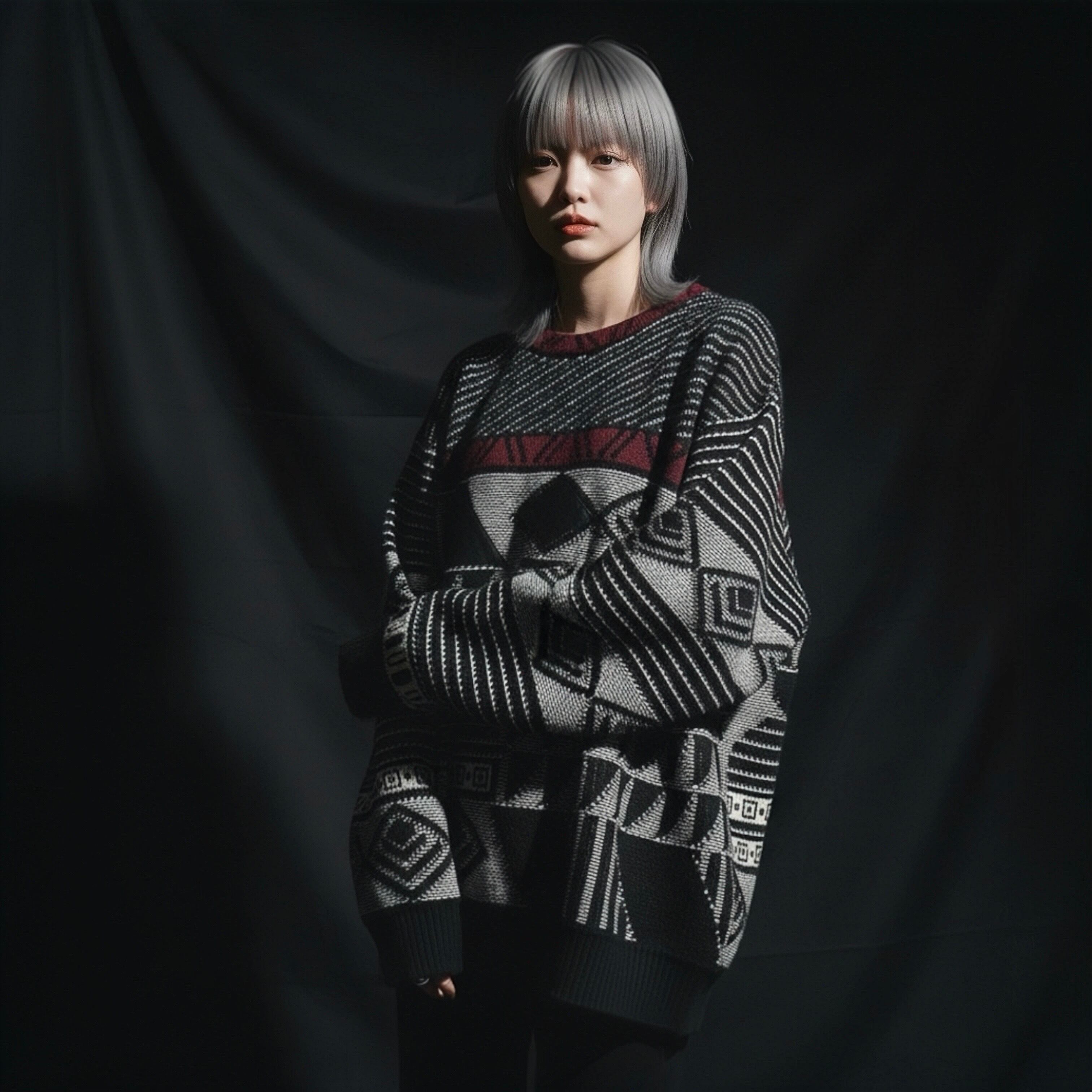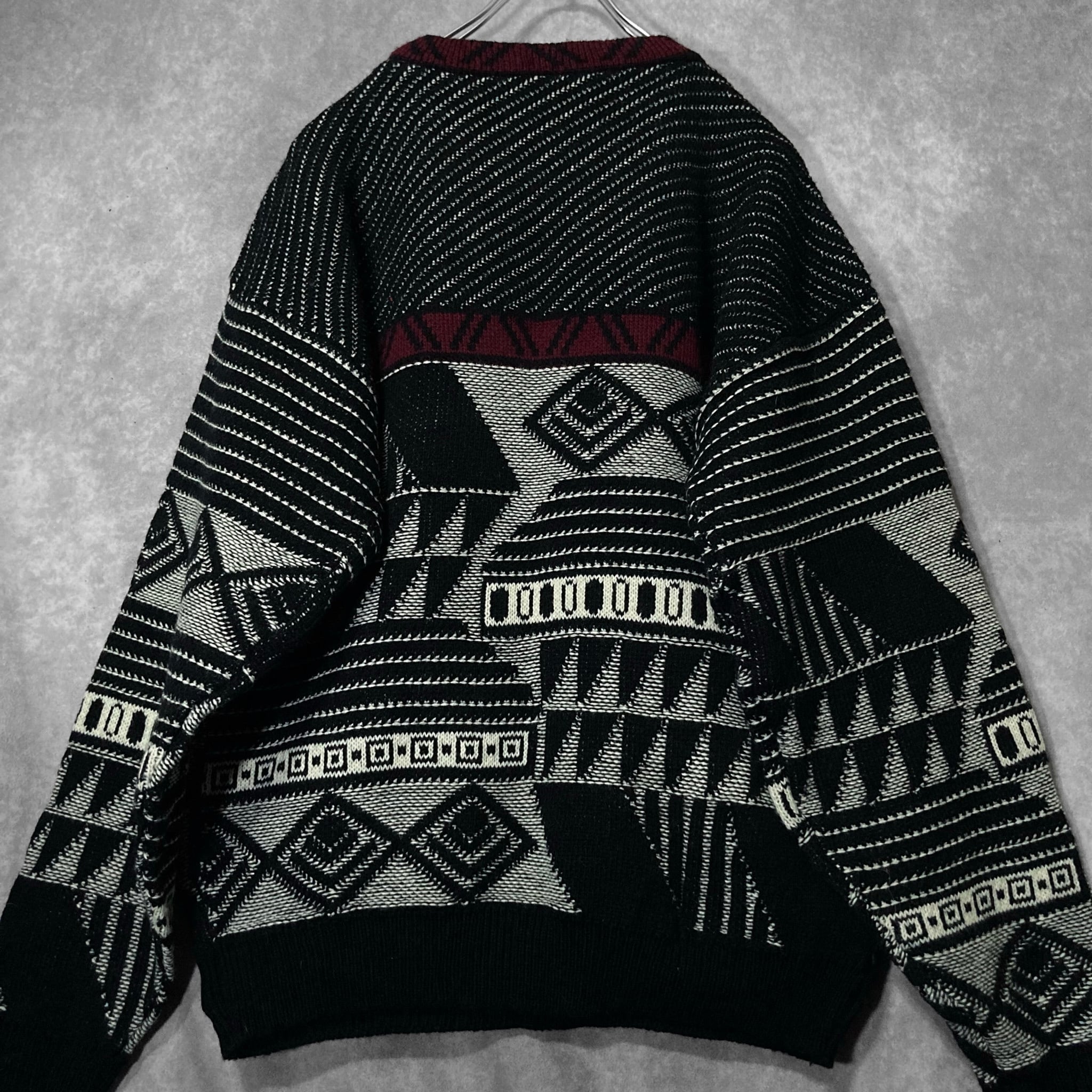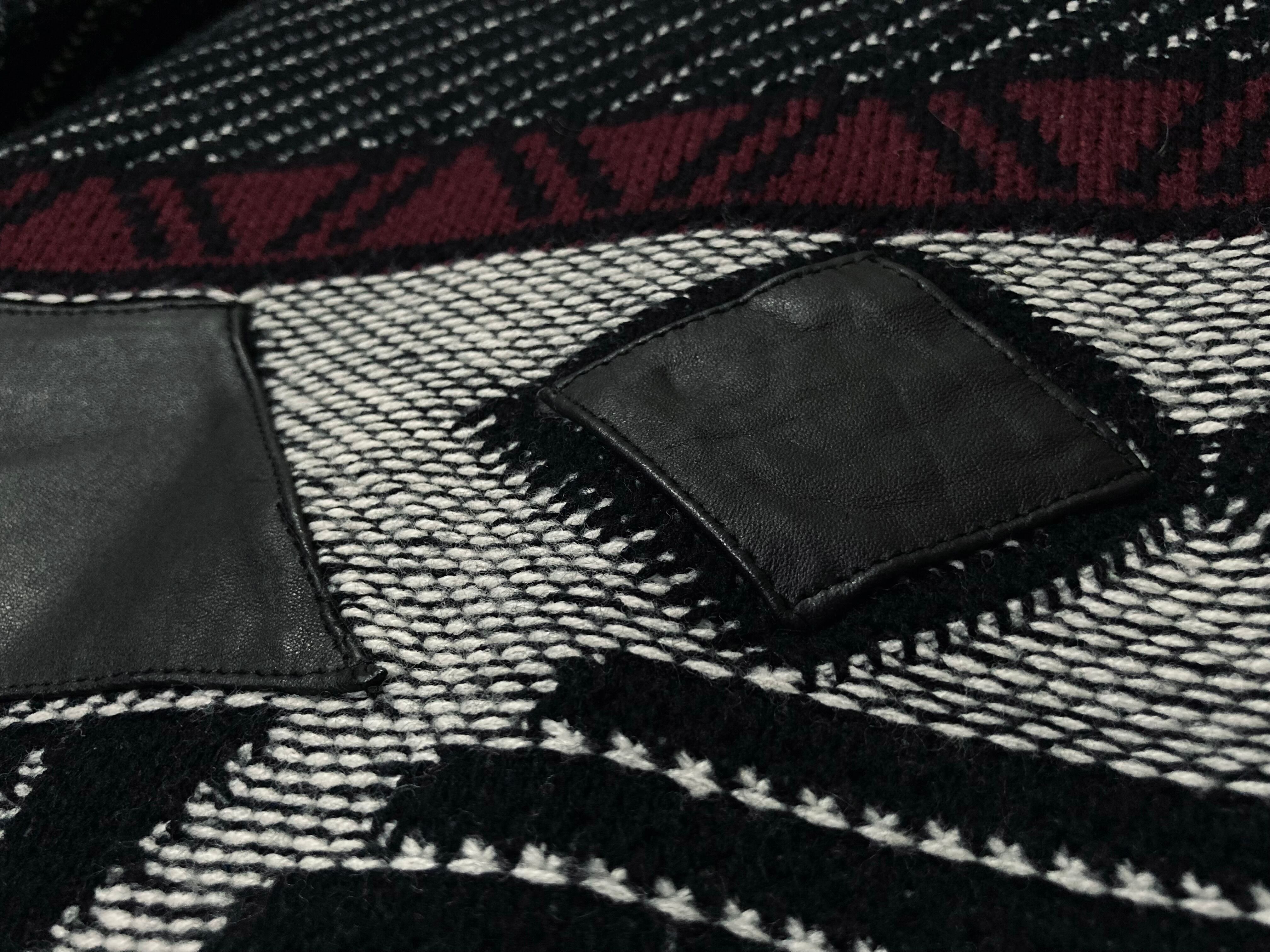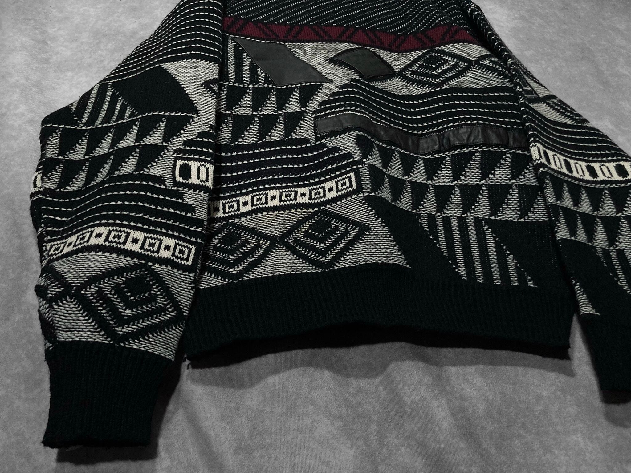 made in Korea, X STAY Leather patchwork and All-over print pattern design knit sweater