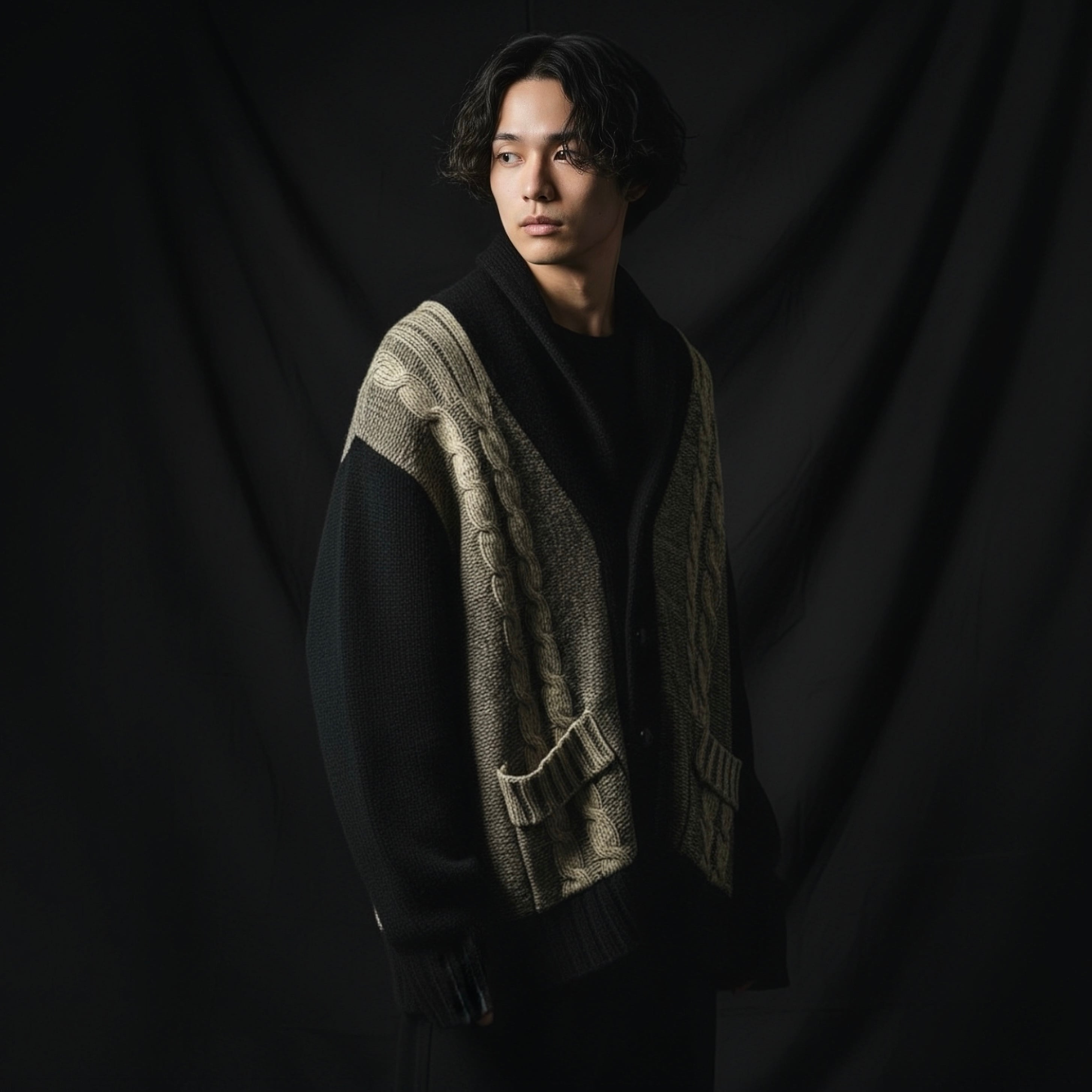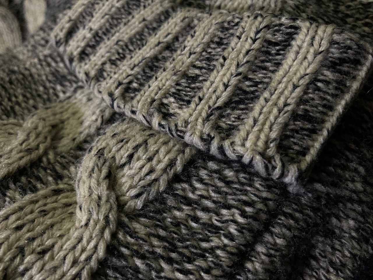 暖かみを生み出すウールにナイロンを混紡したニット生地を採用。ローゲージでざっくり編まれたケーブル編みの編み目模様のフロントの切り替えデザインが印象的。