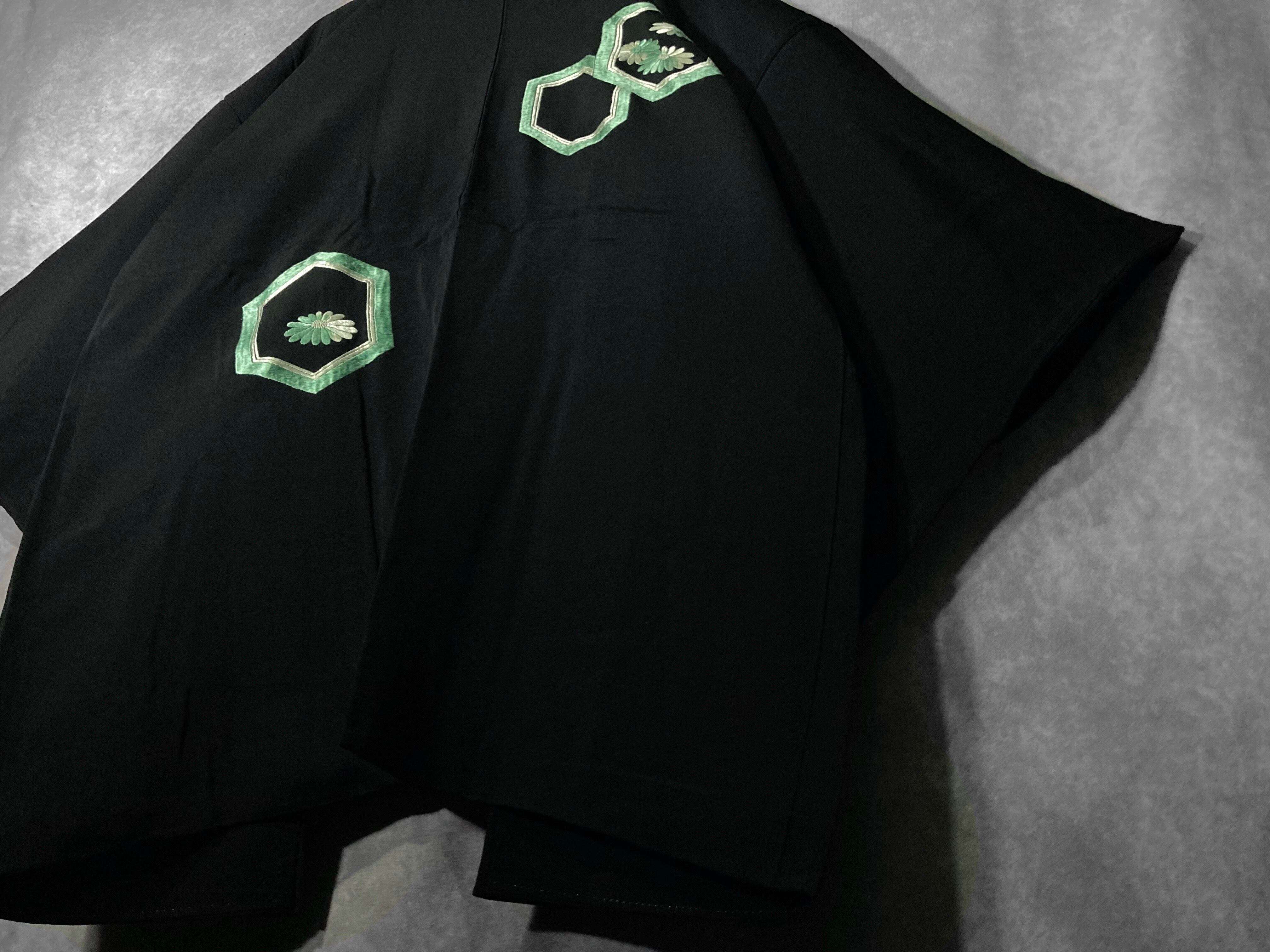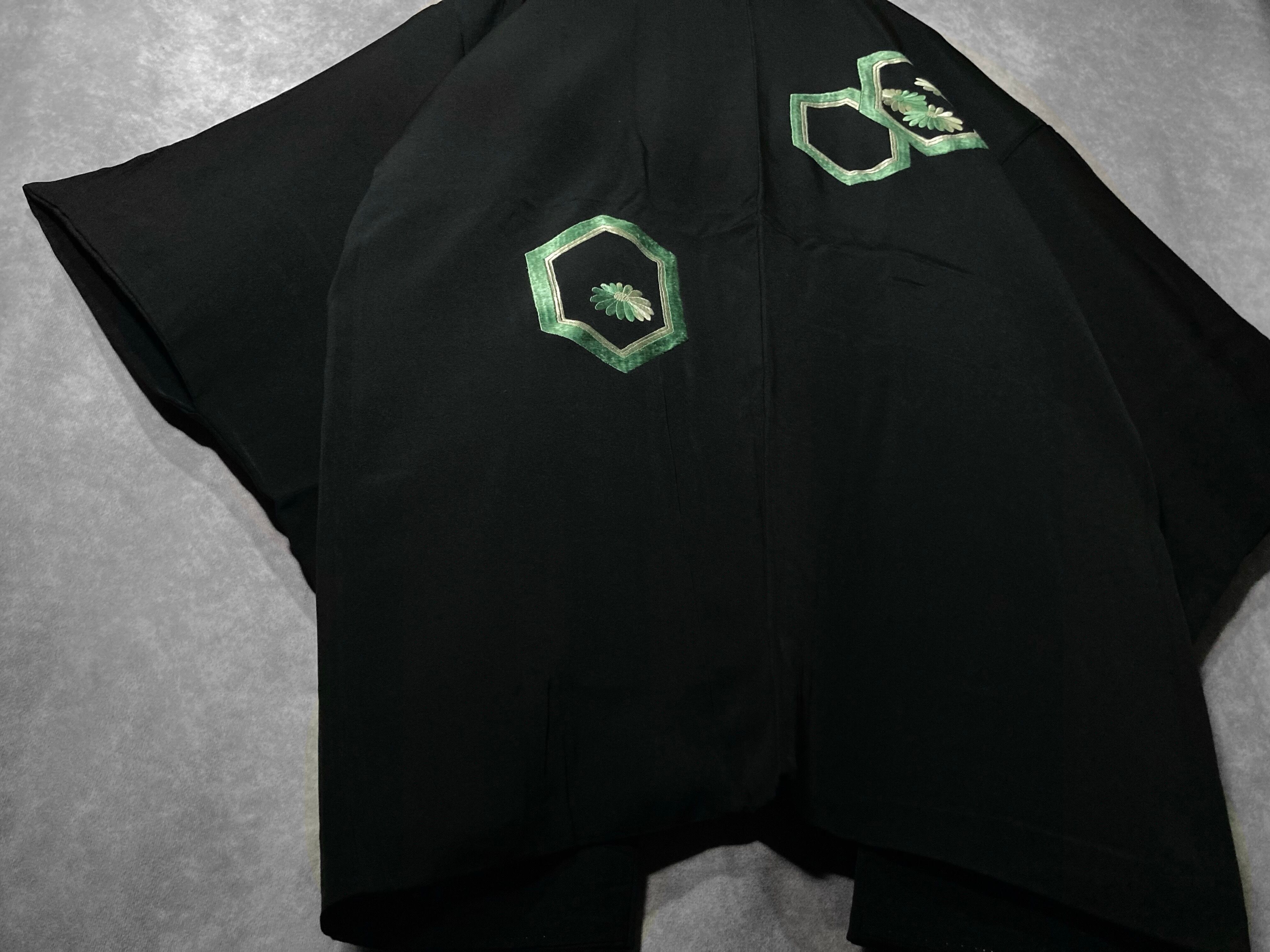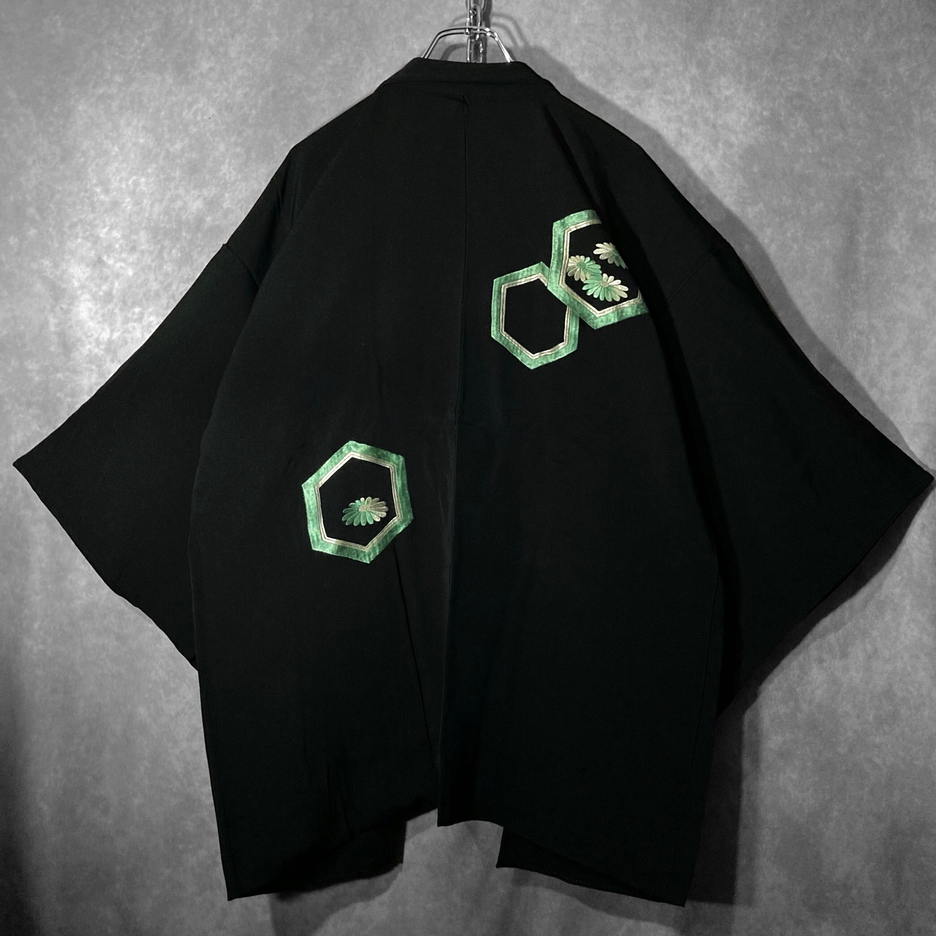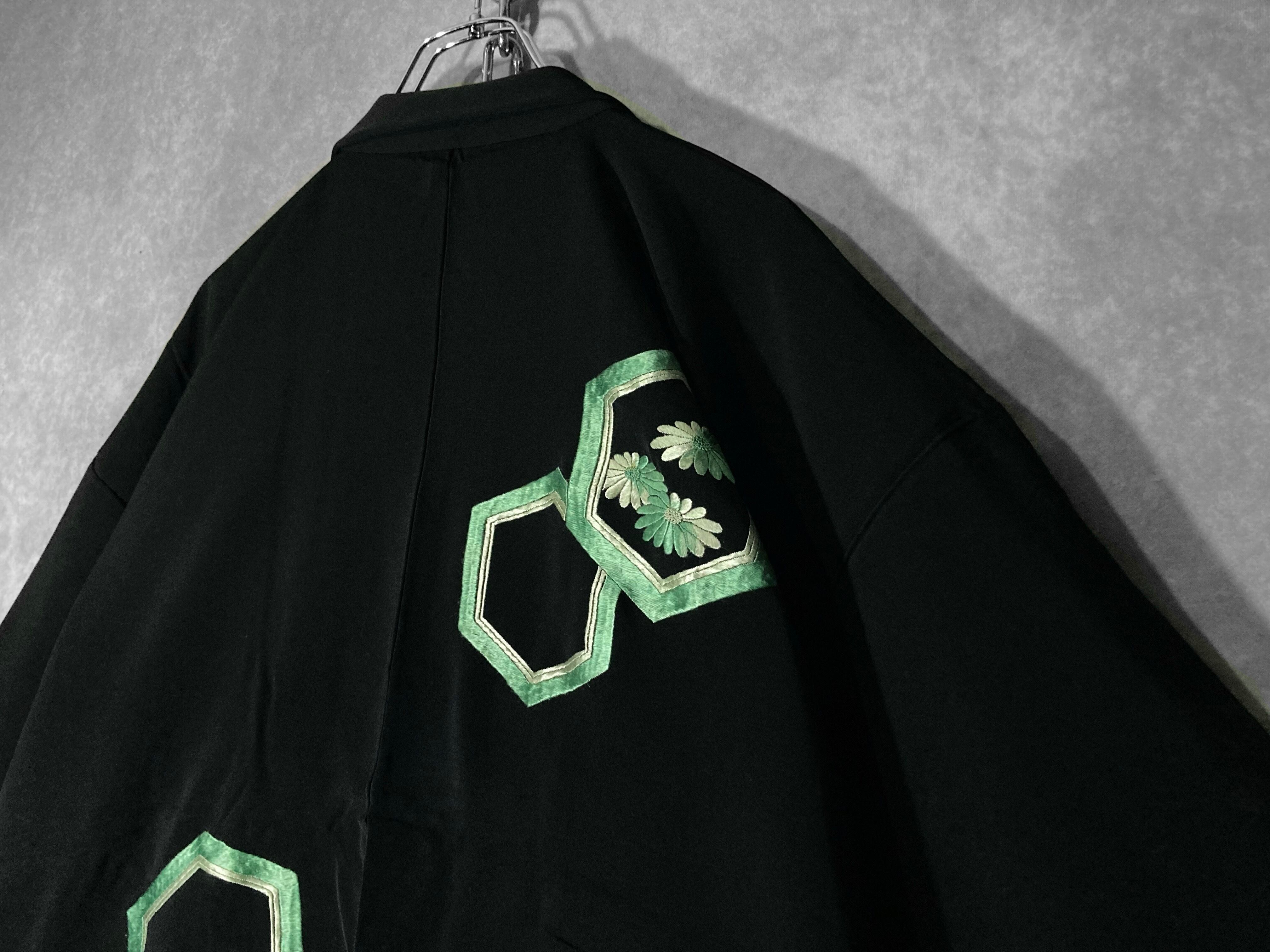 【kasume】黒羽織 - 翡翠亀甲 - Jade-green tortoiseshell pattern embroidery design Vintage Made in Japan Black haori
