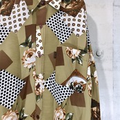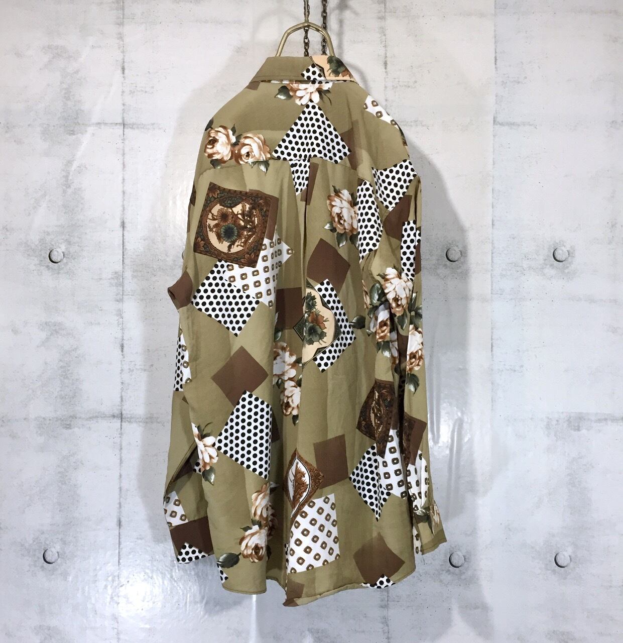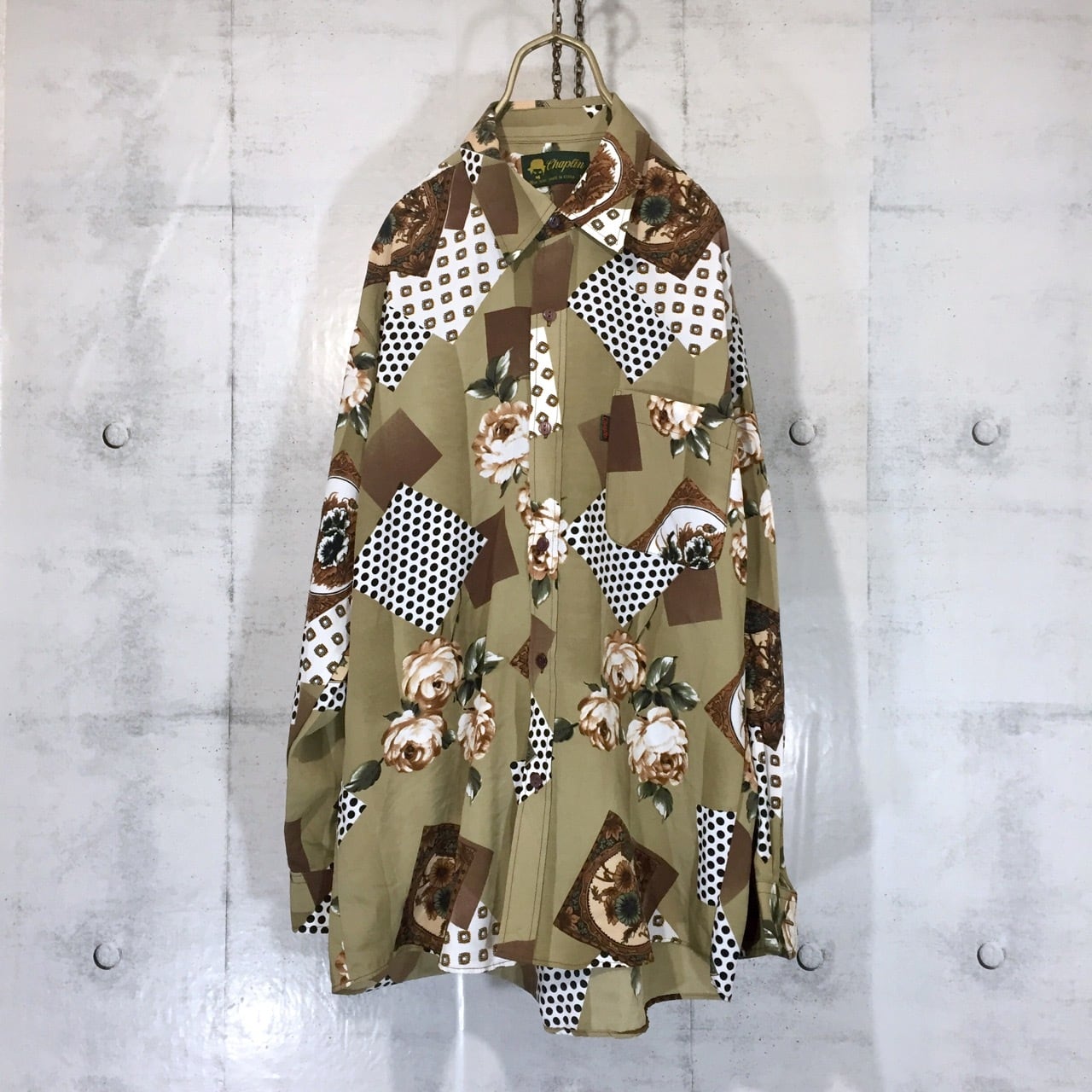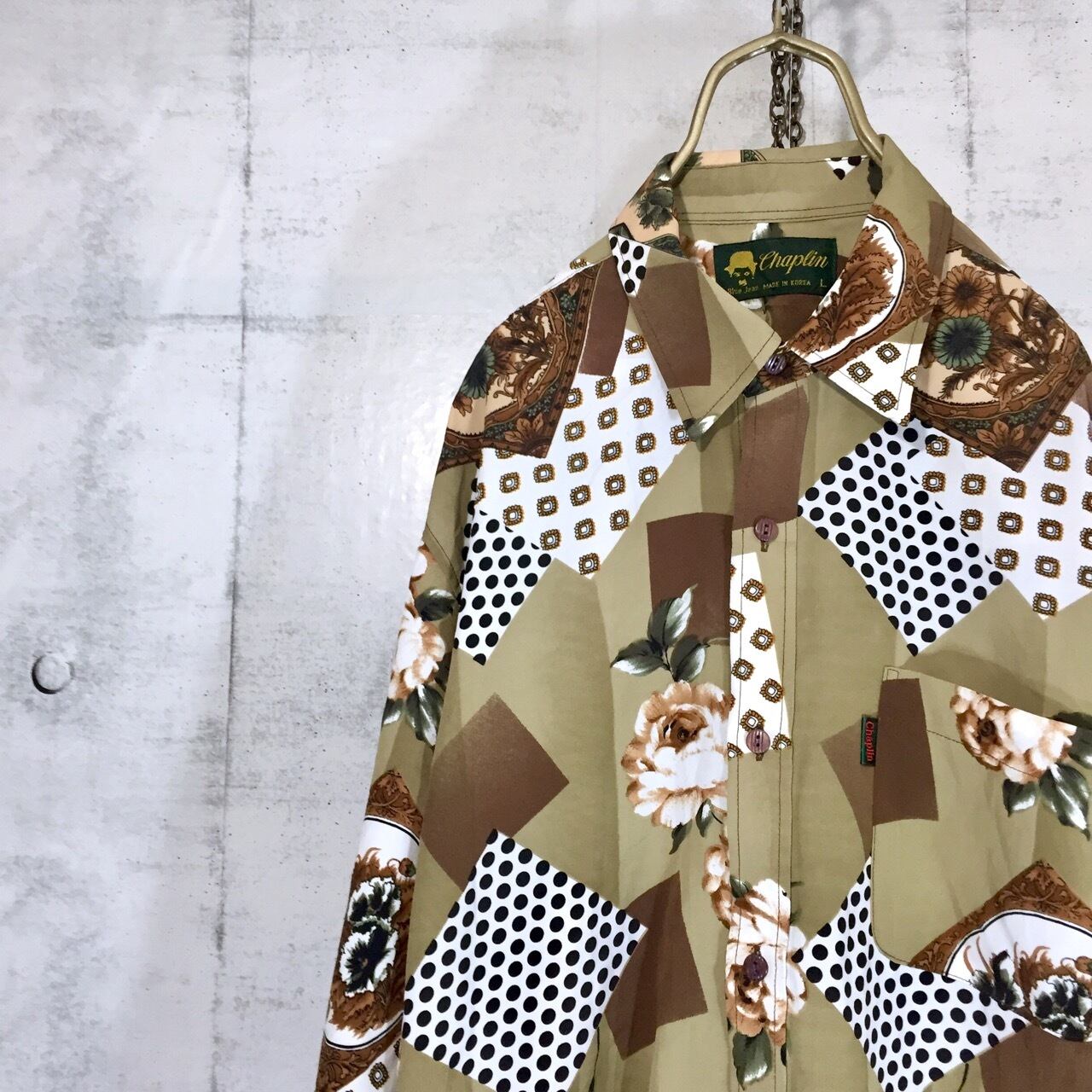 茶系 花柄 クレイジーパターン 総柄シャツ