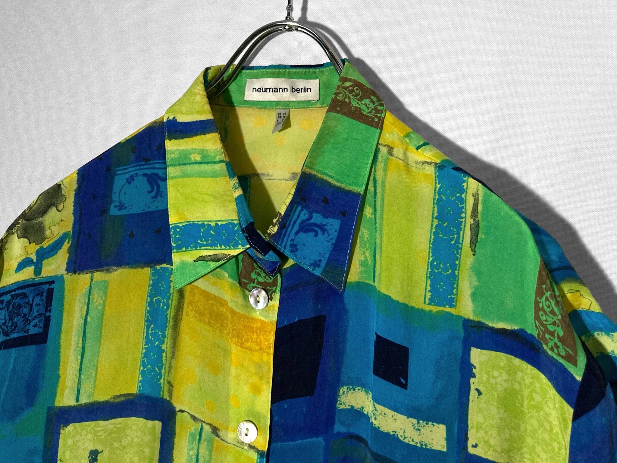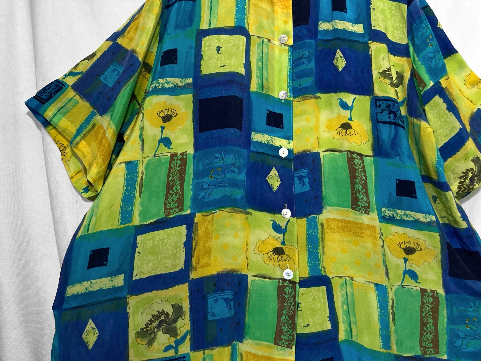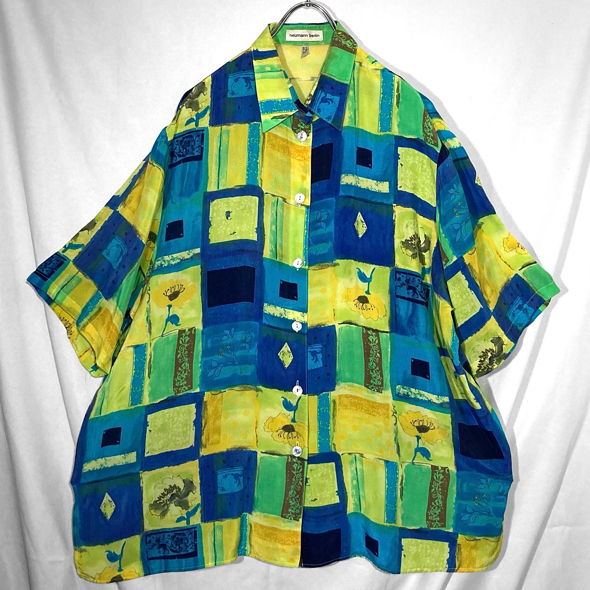 滲む青と花 - Blurred blue and flowers pattern all over design Over-silhouette H/S shirt