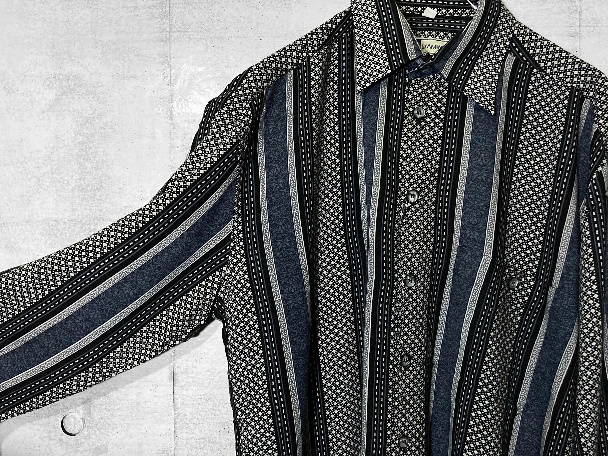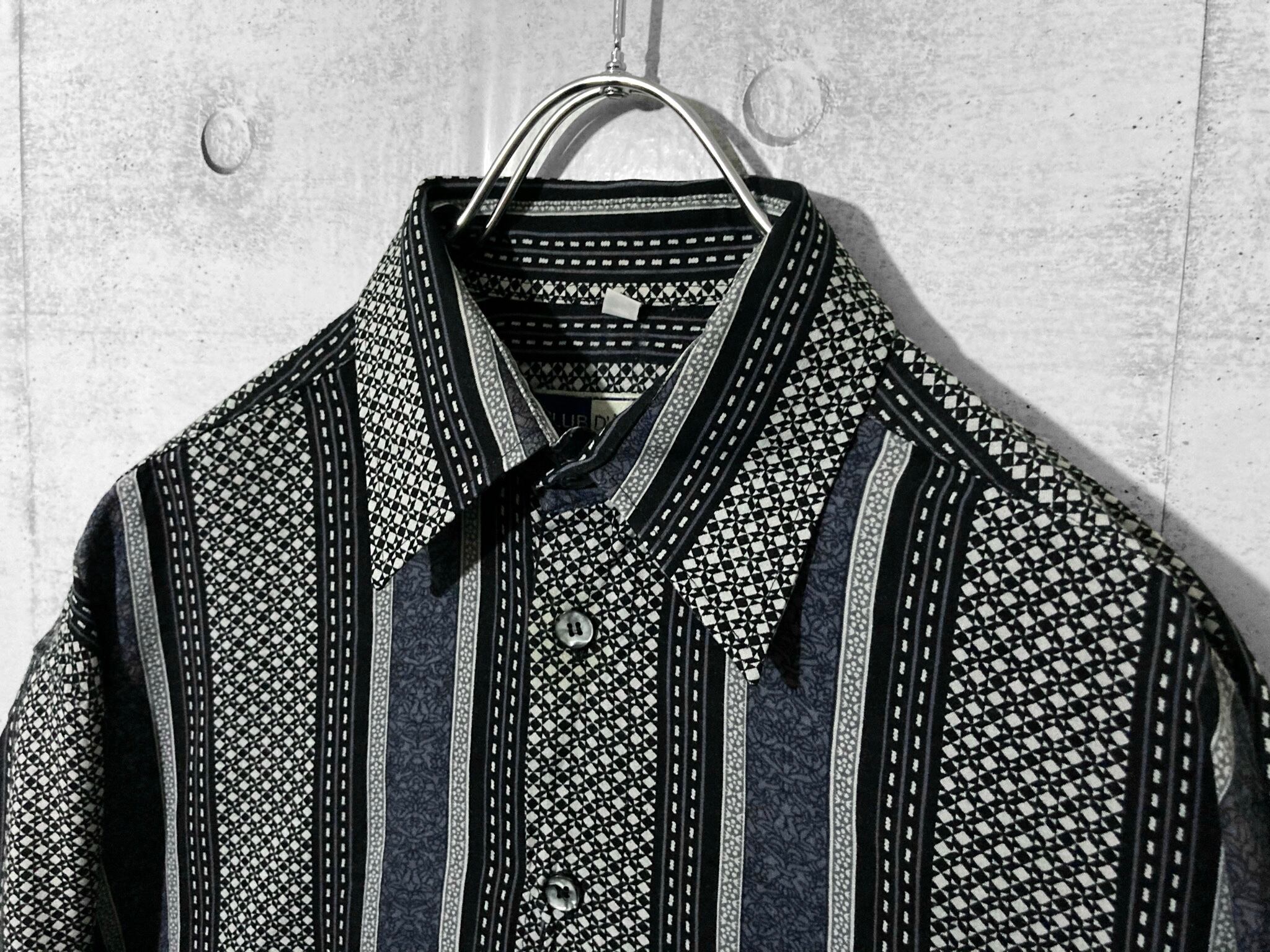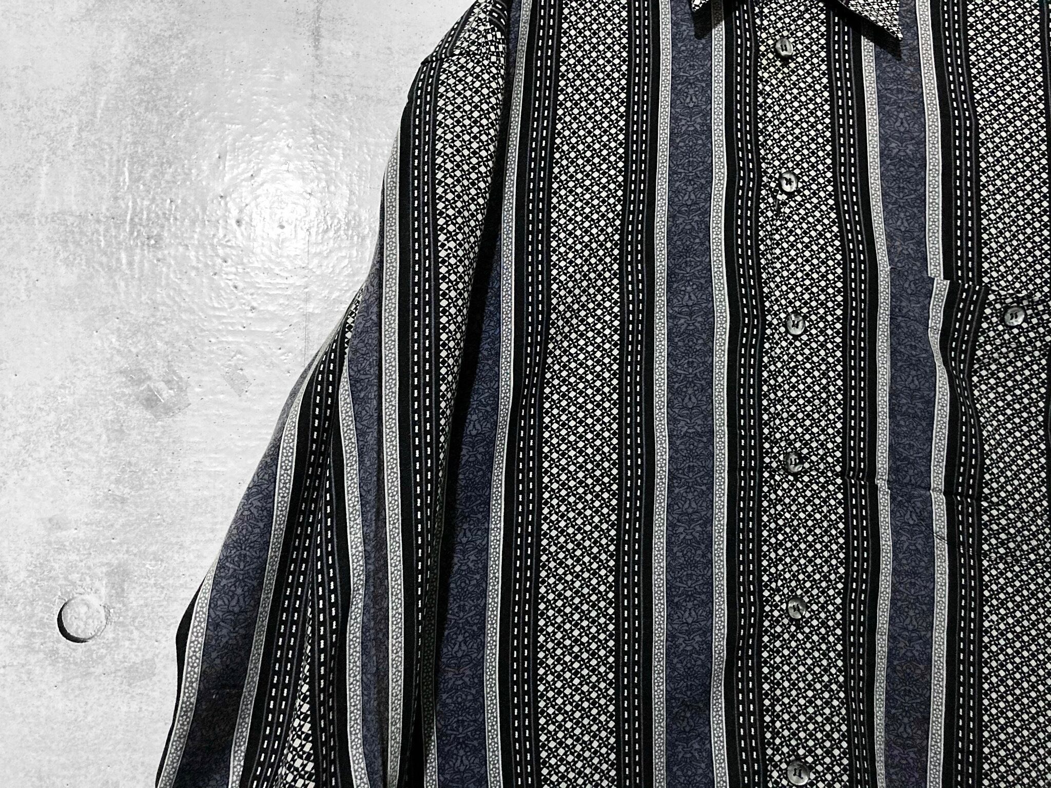 モノトーンな雰囲気がカッコいい幾何学×ストライプの総柄シャツ。