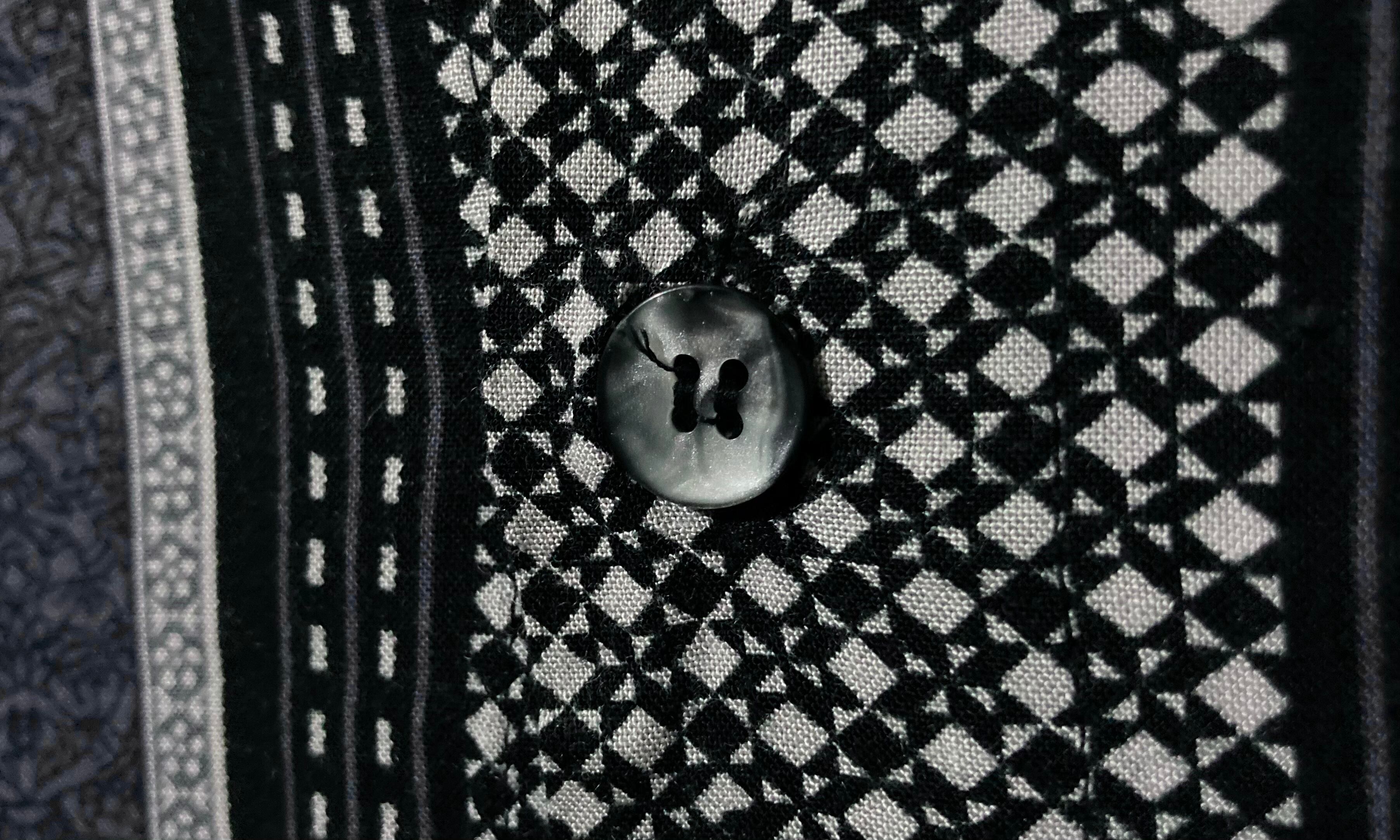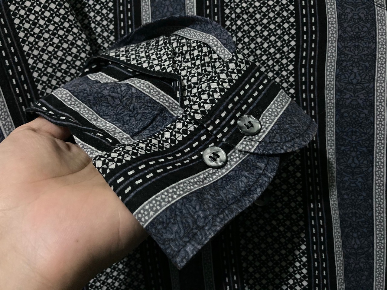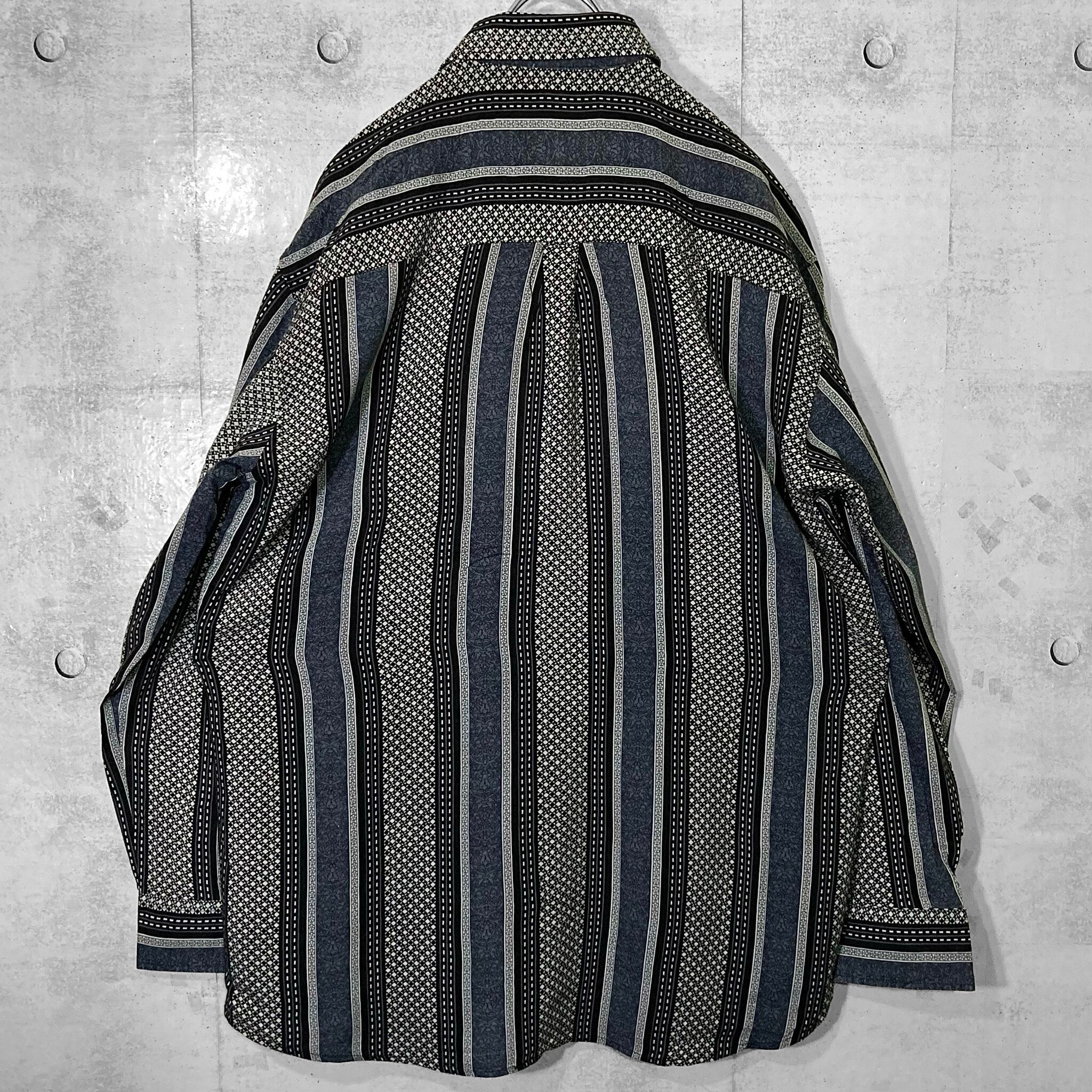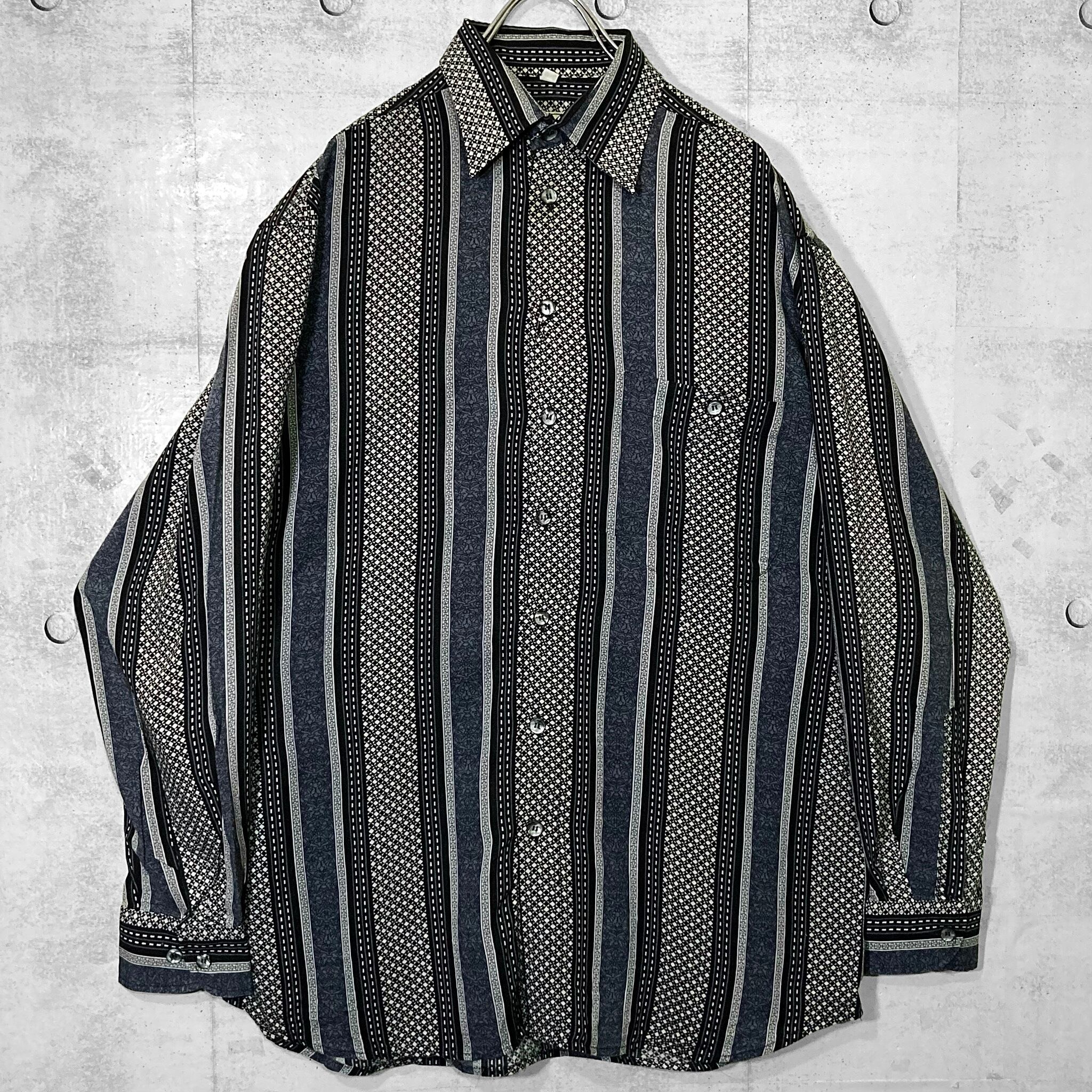 モノトーンな雰囲気がカッコいい幾何学×ストライプの総柄シャツ。