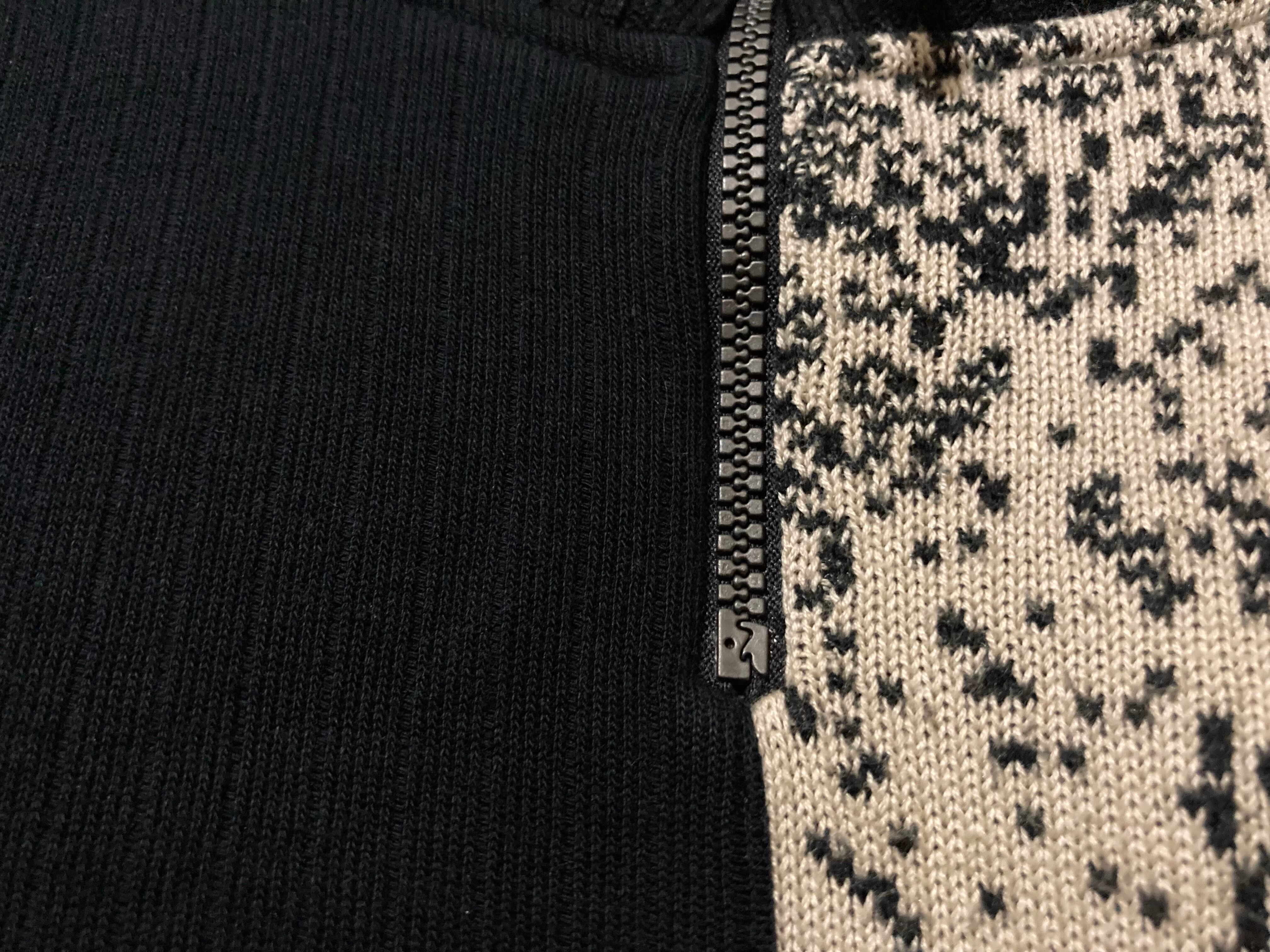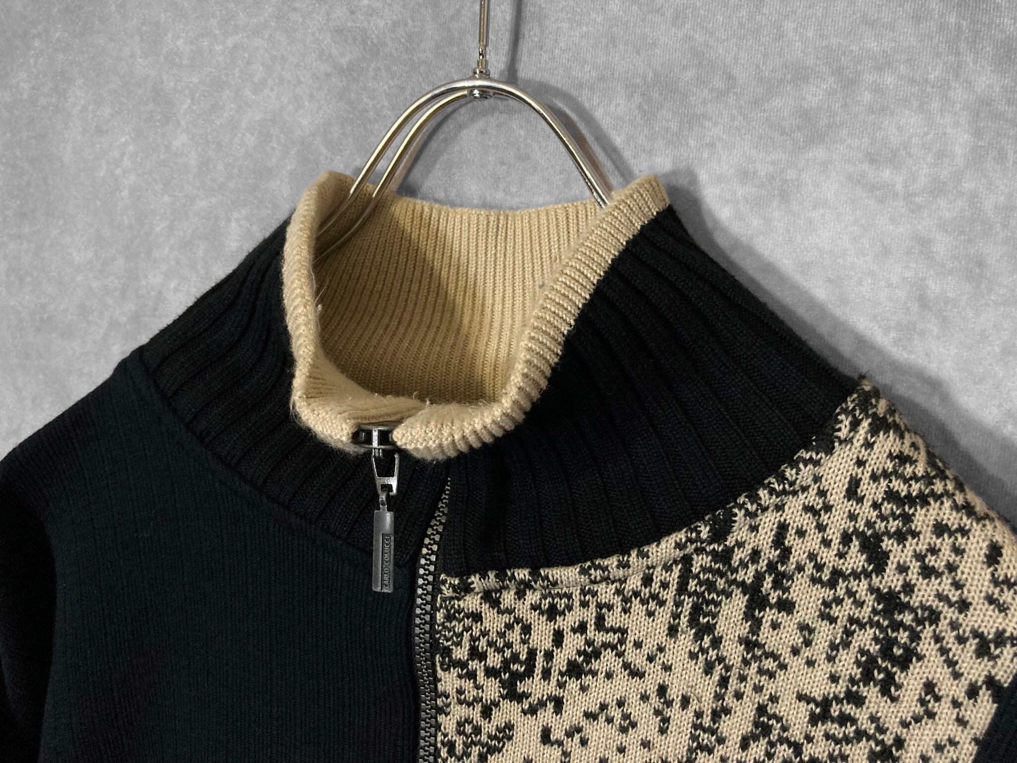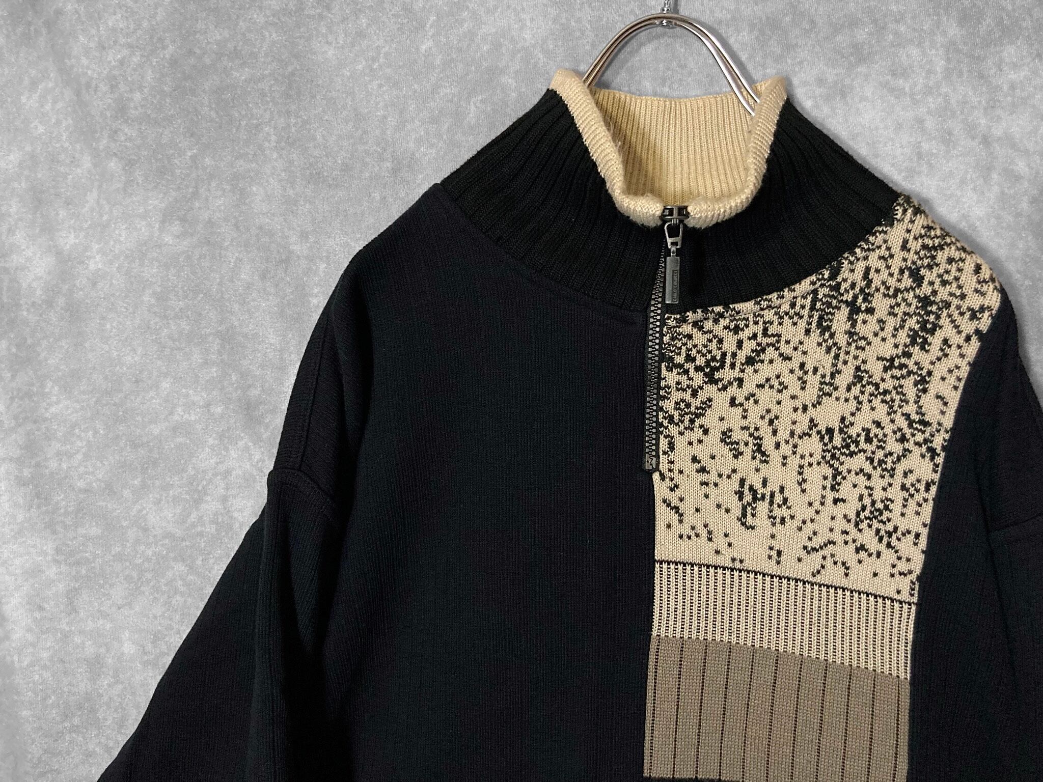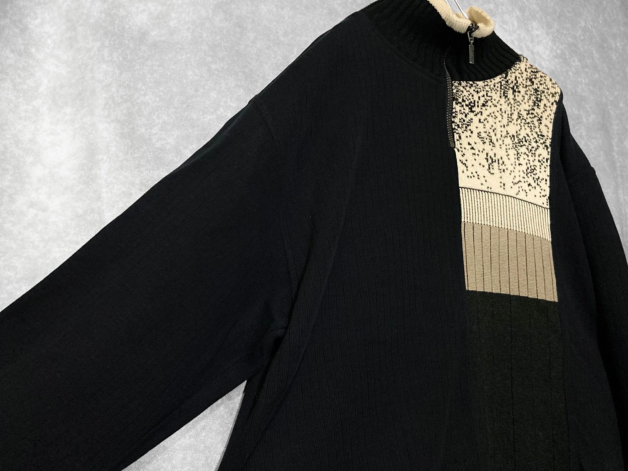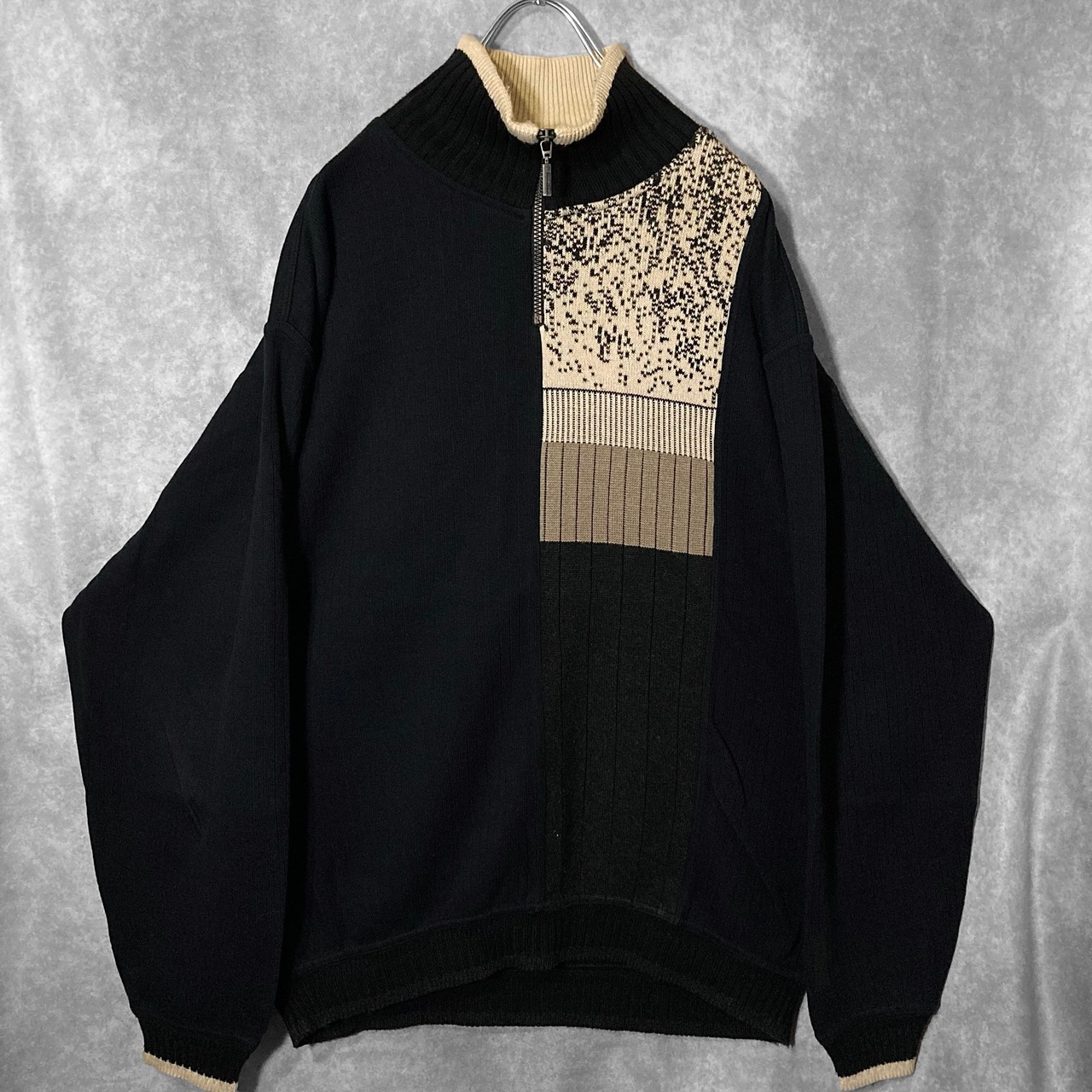 XL size Different material knitting Black × Beige color pattern design Switch Half-zip knit