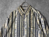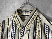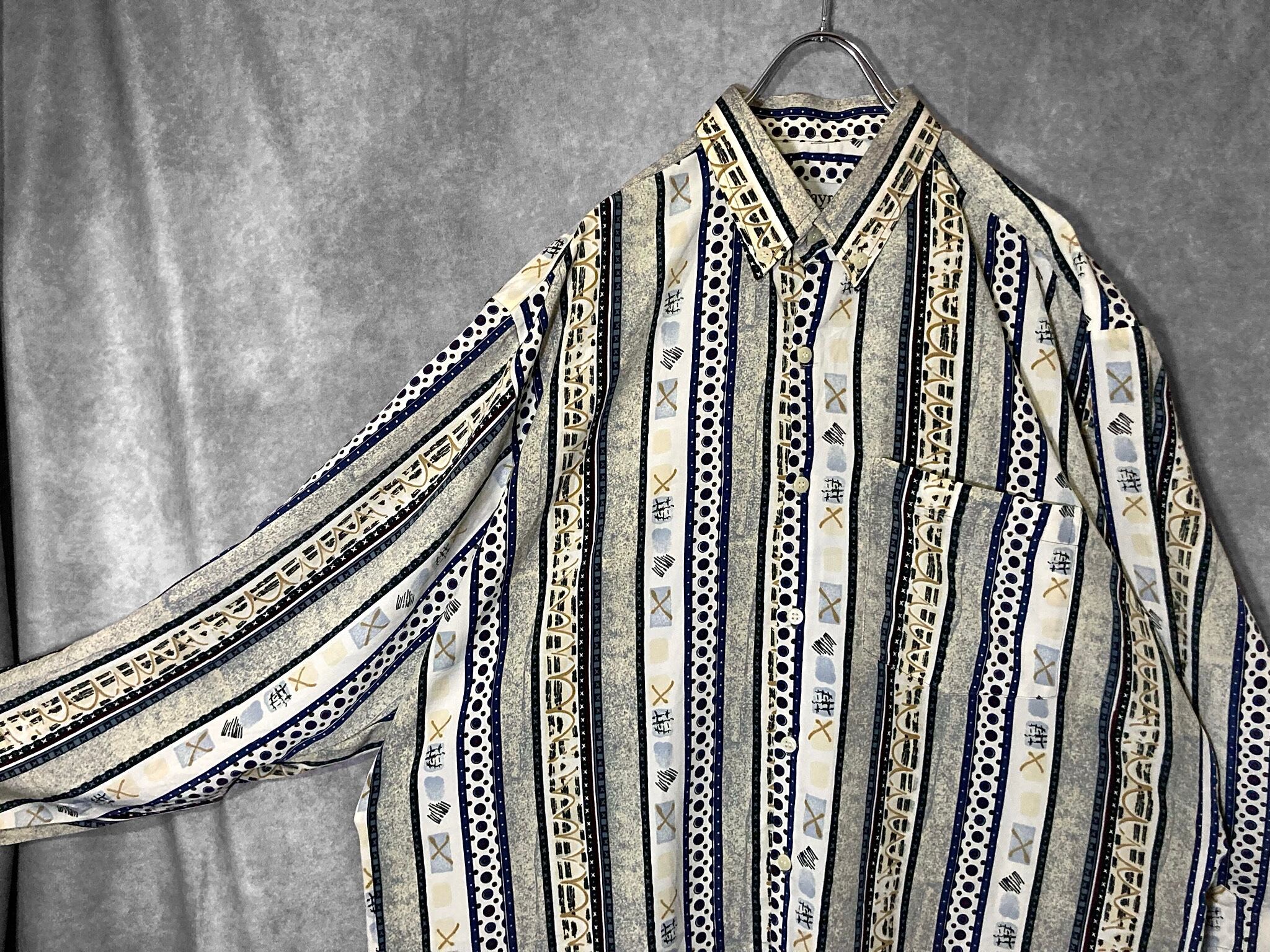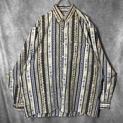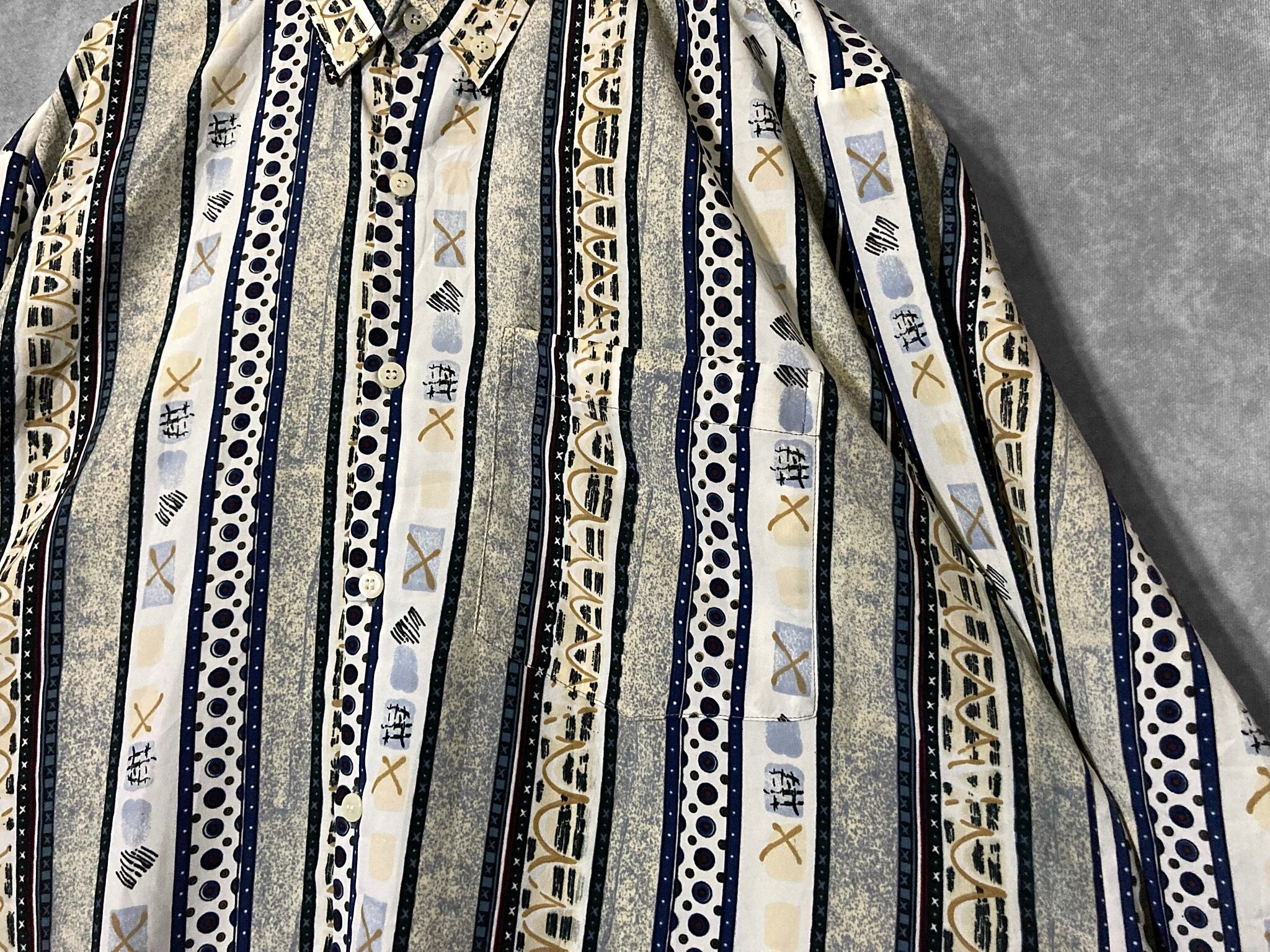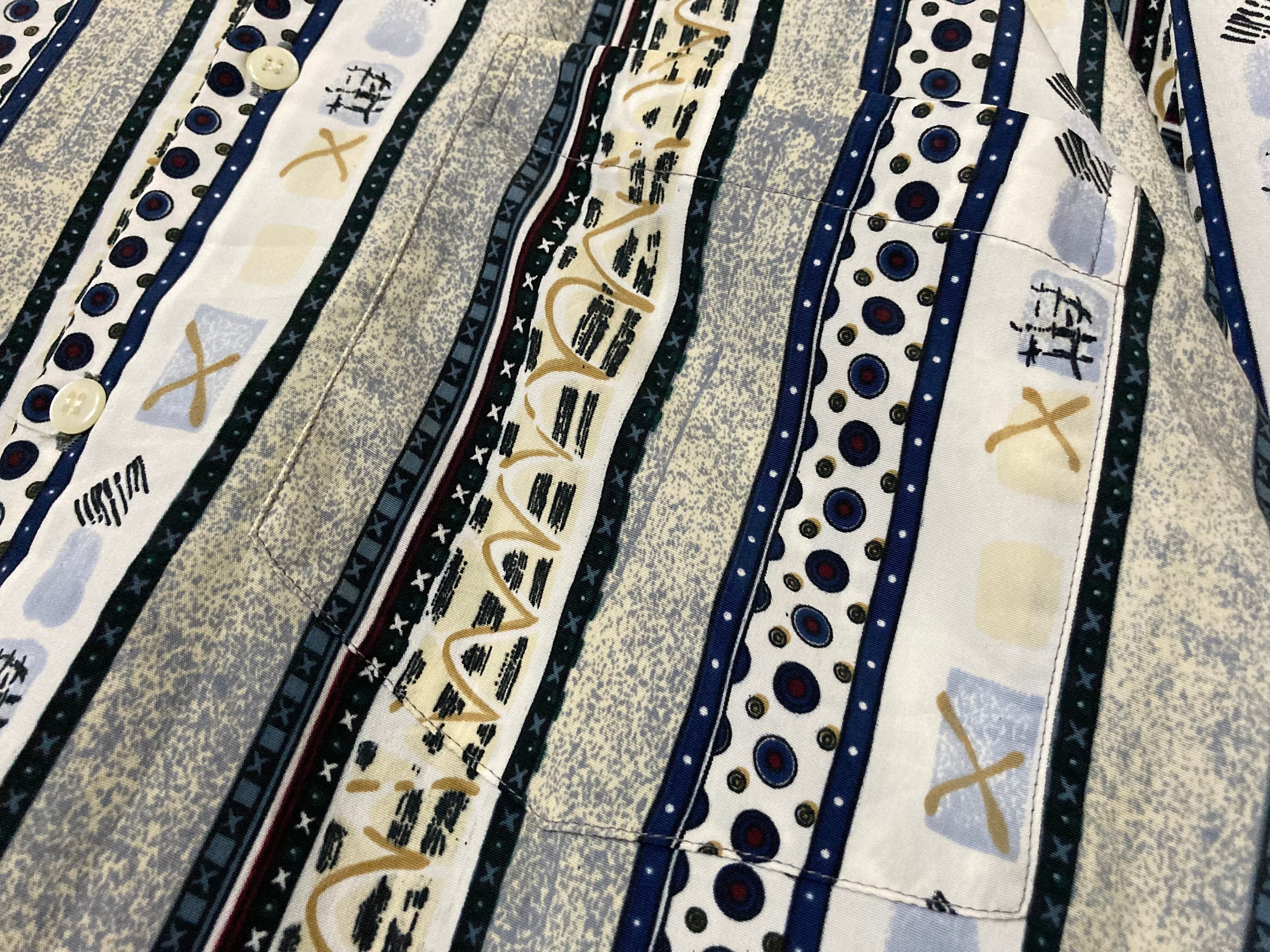 ストライプと間に幾何学アートがデザインされた珍しいホワイトベースのアートデザインシャツ。