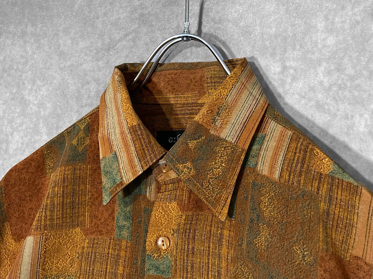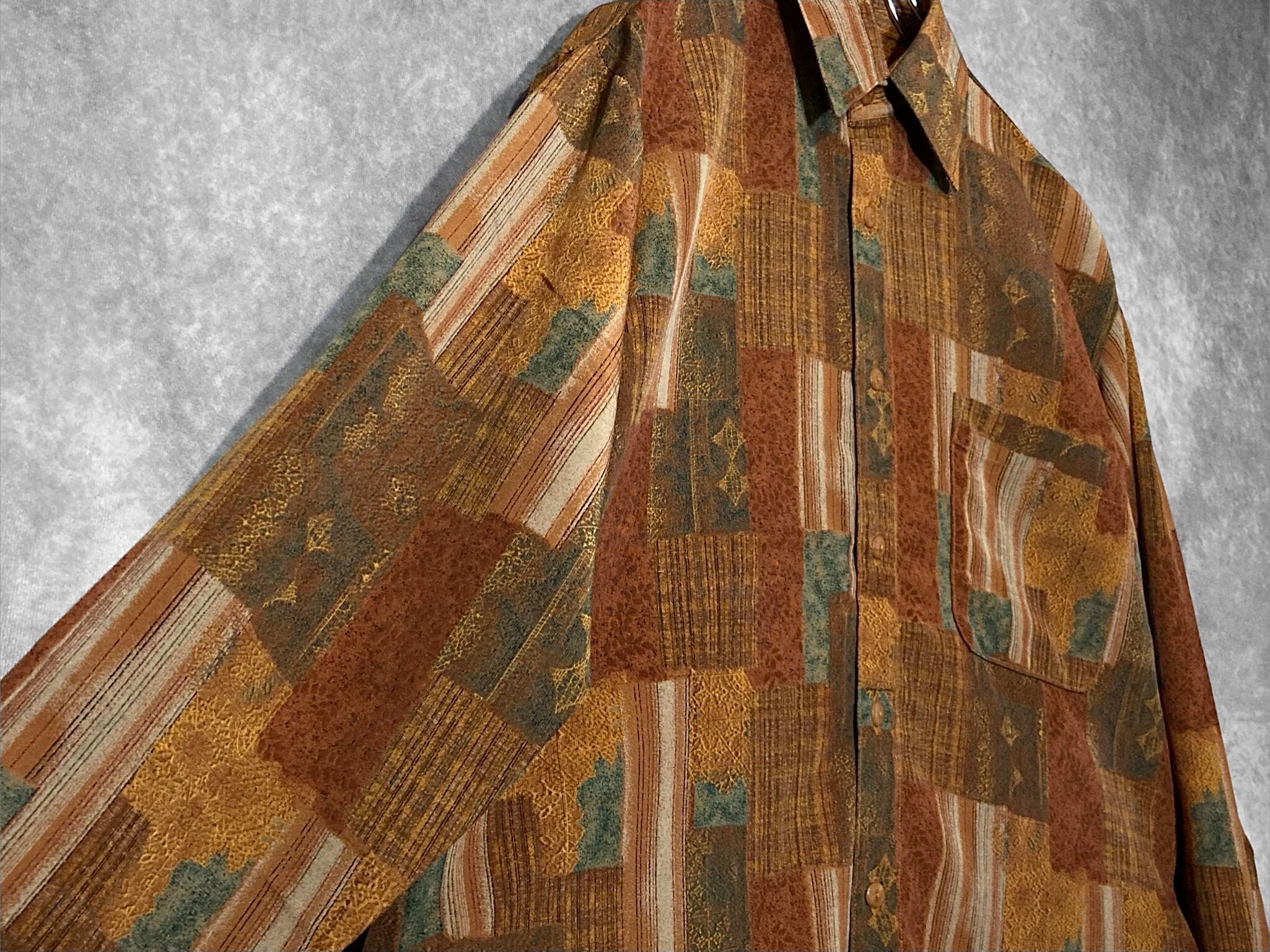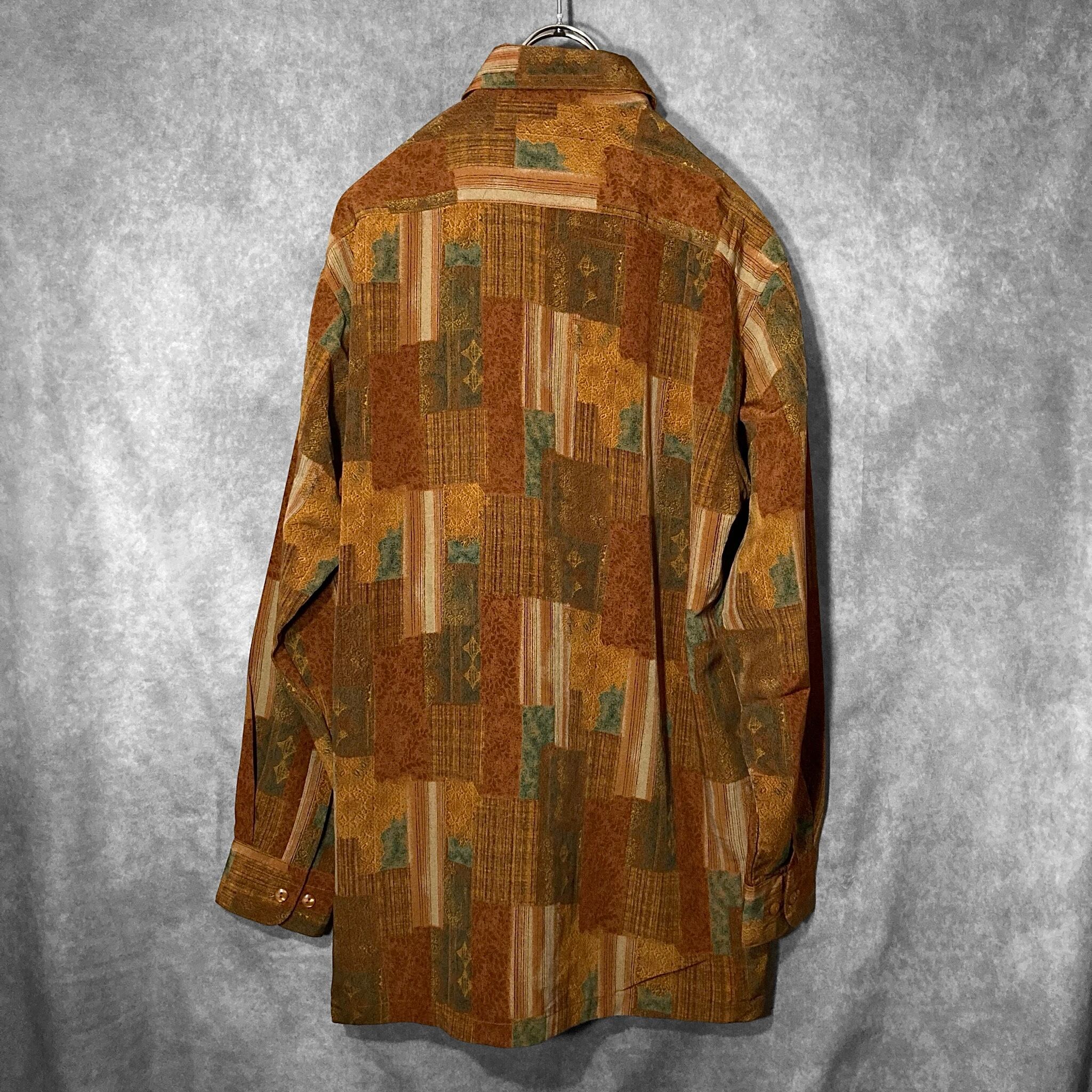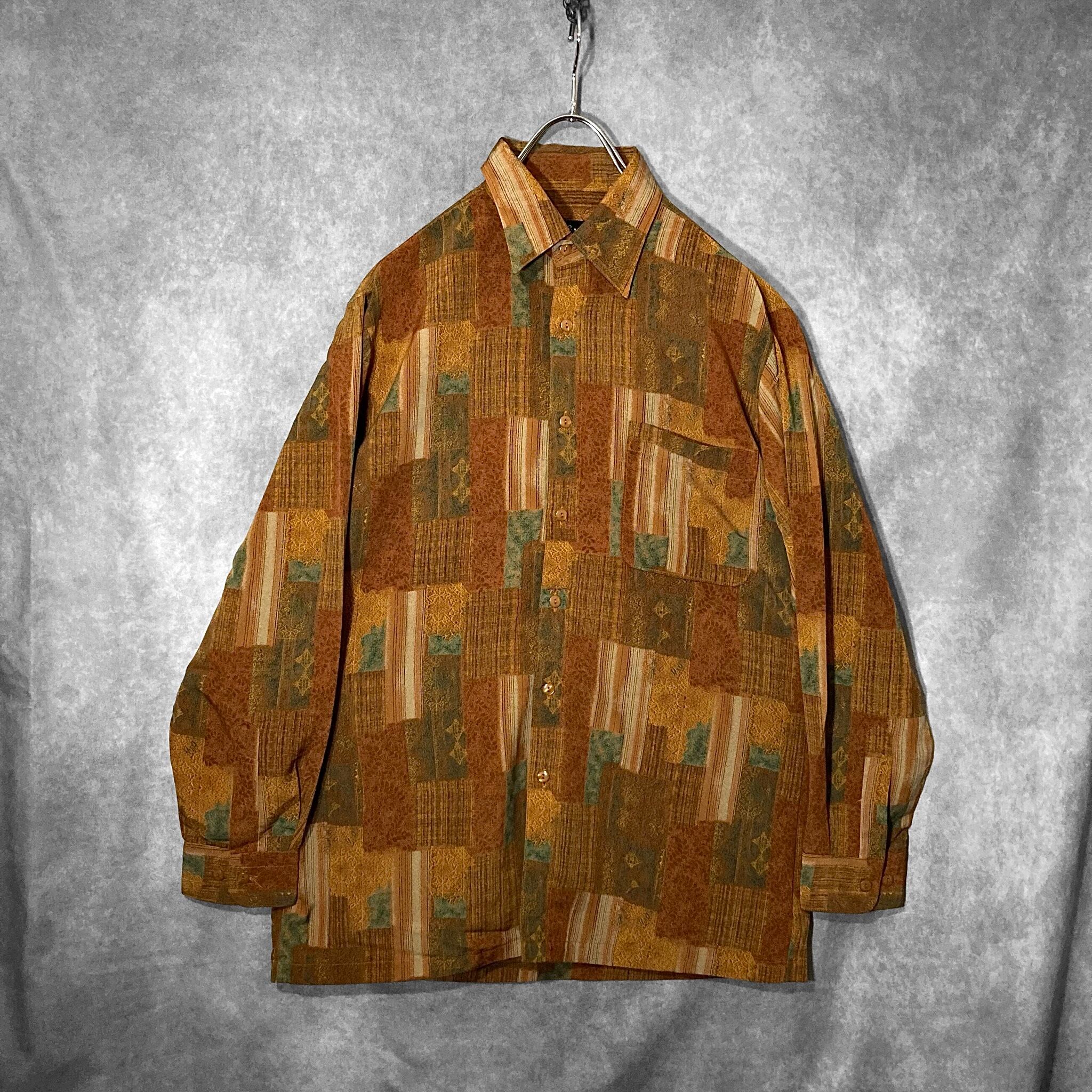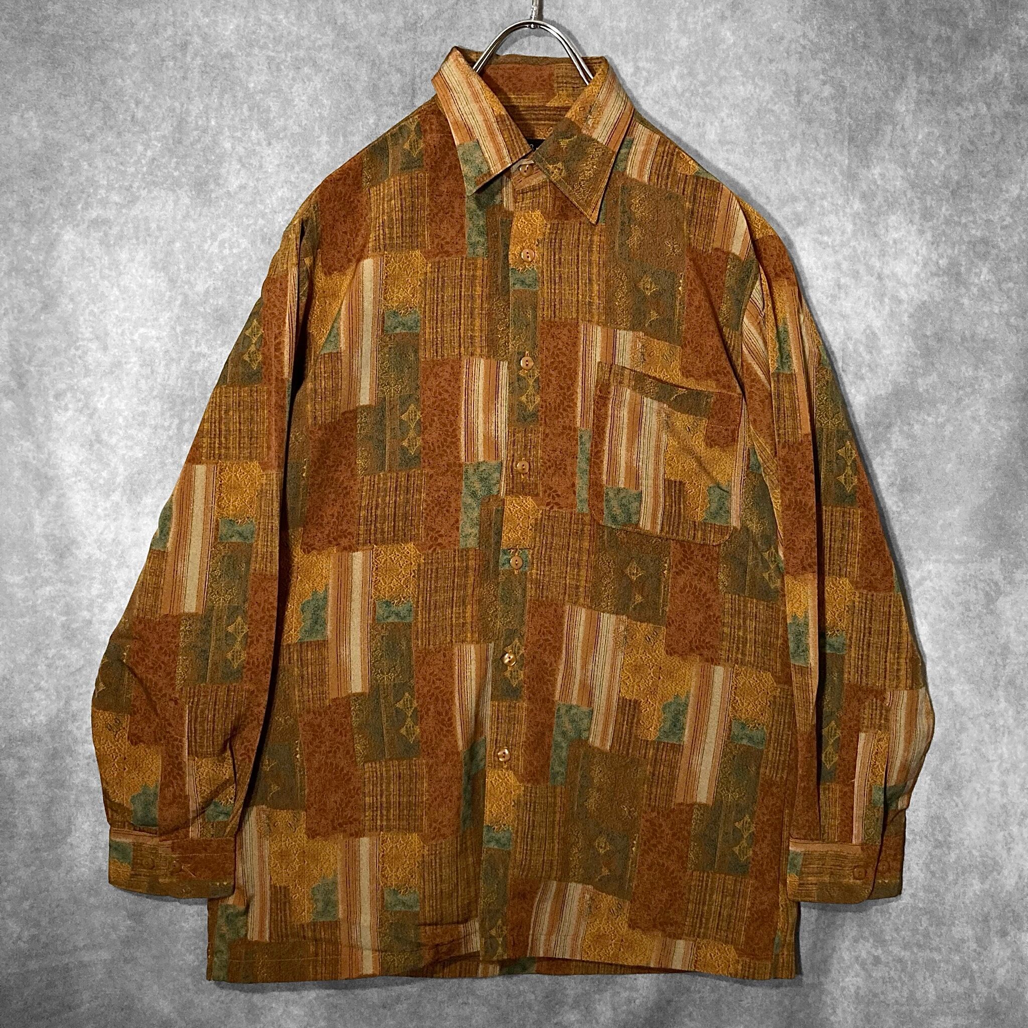 どことなく和の雰囲気を感じるパッチワークのようなアーティスティックなデザインの総柄シャツ。