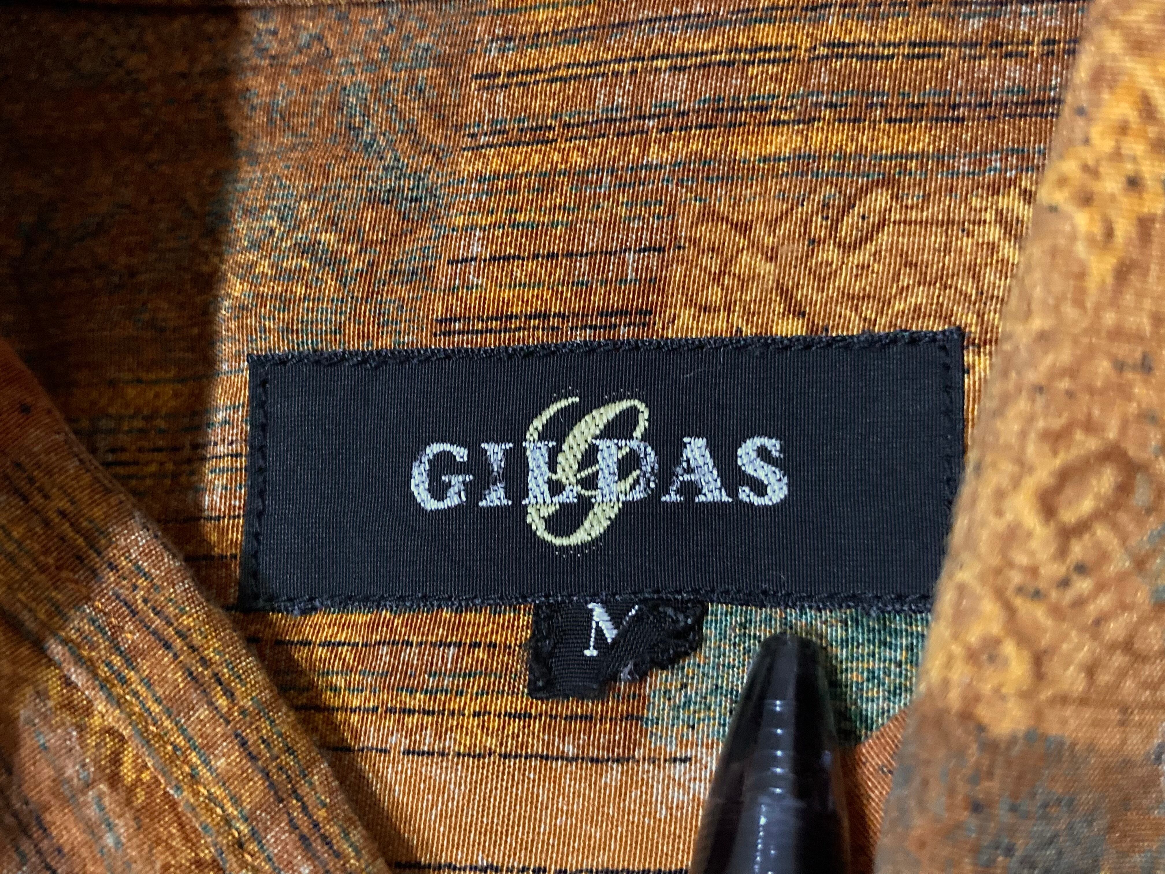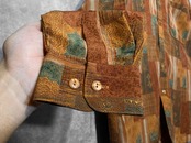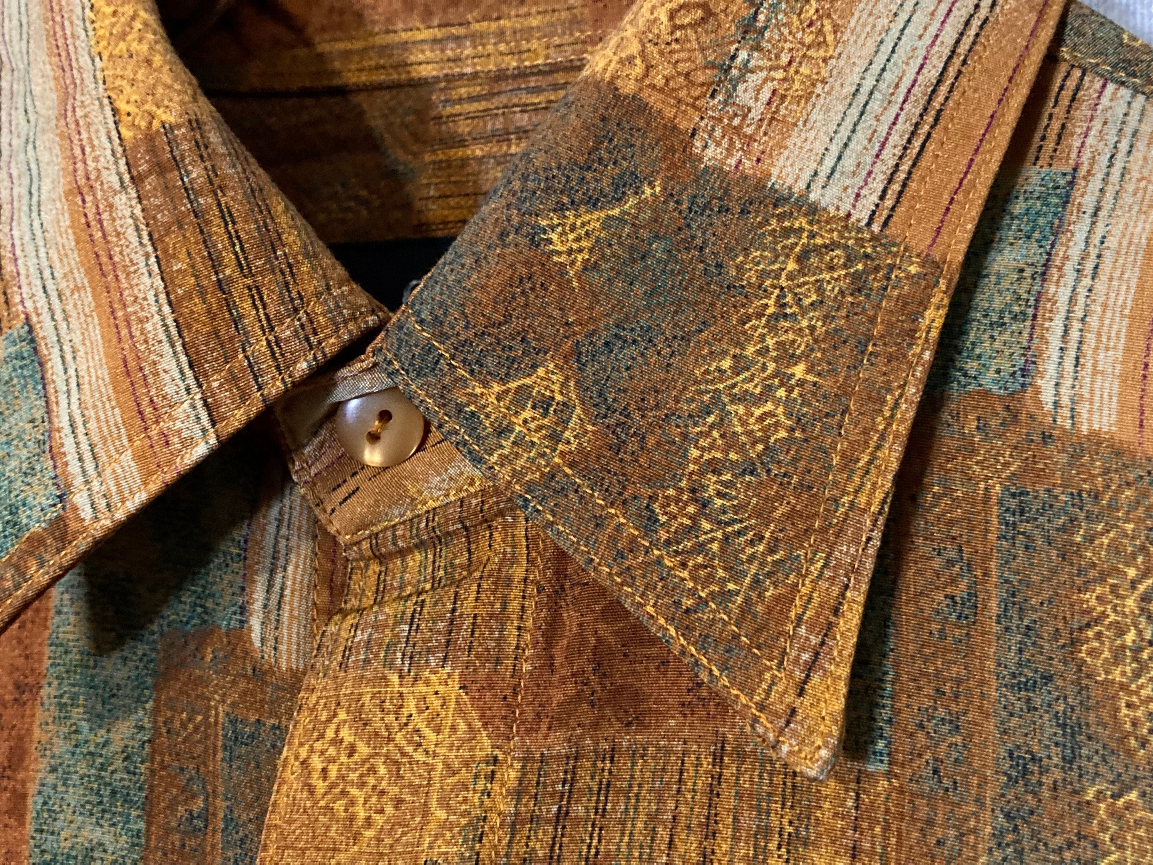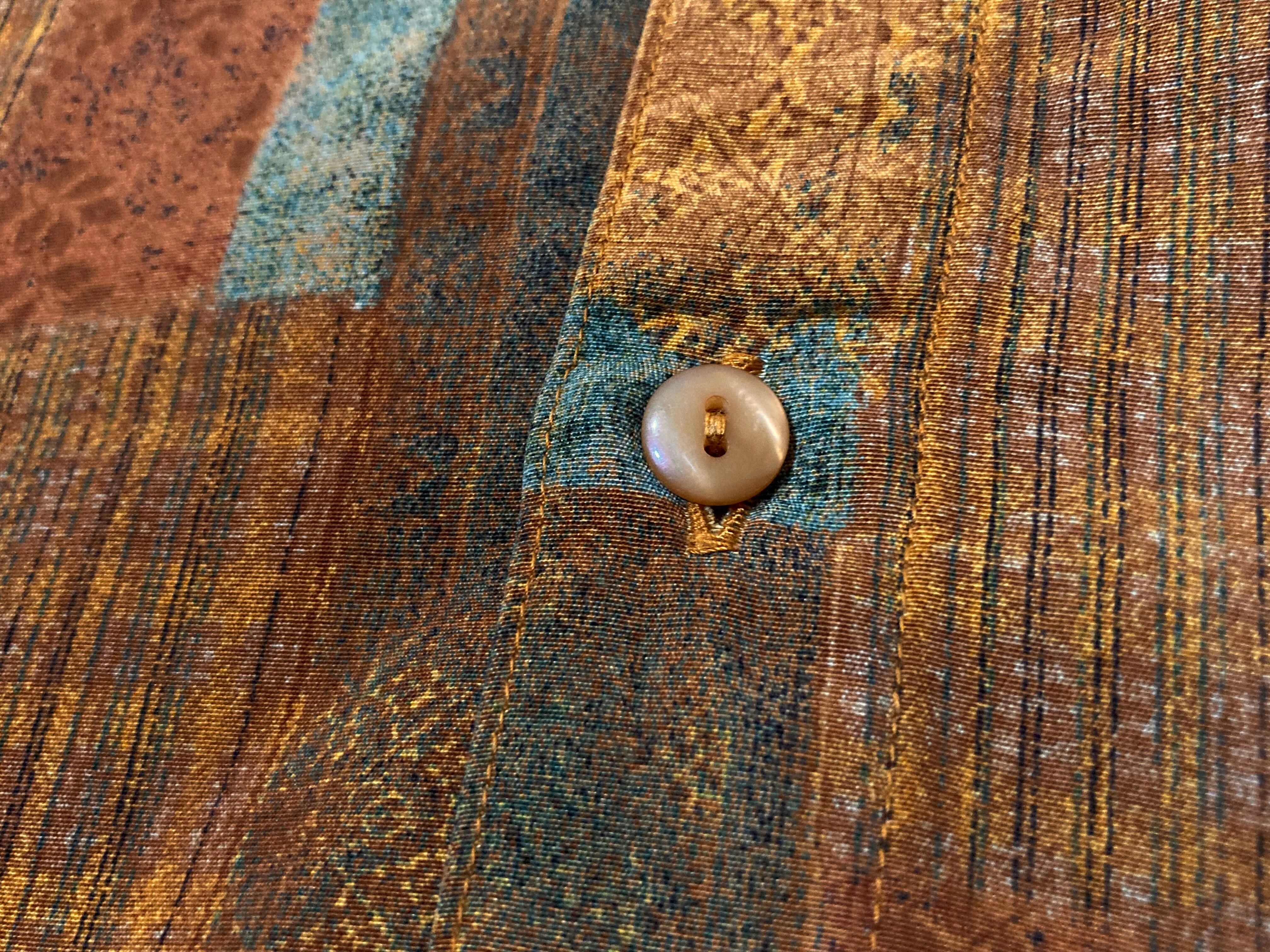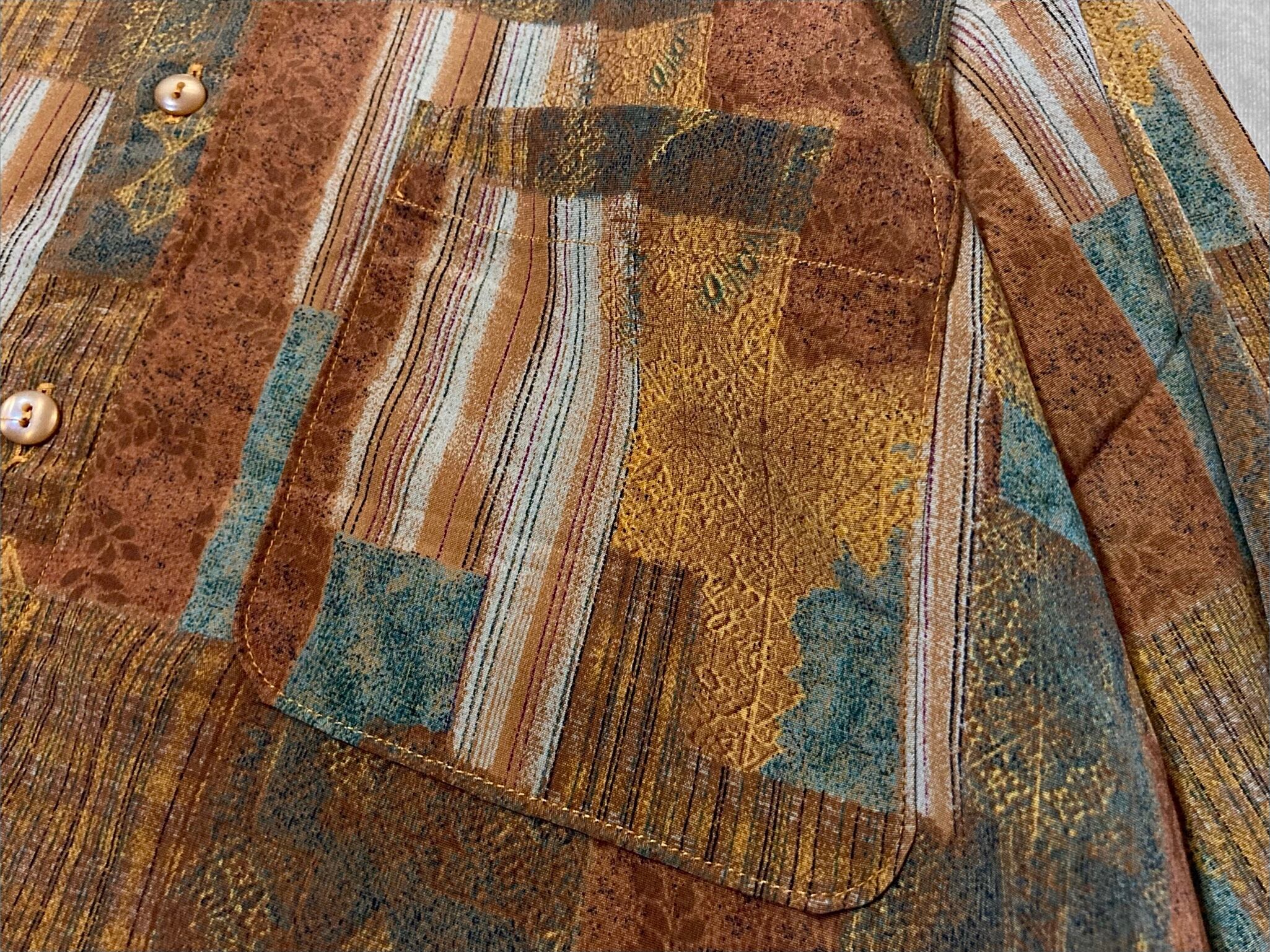 どことなく和の雰囲気を感じるパッチワークのようなアーティスティックなデザインの総柄シャツ。