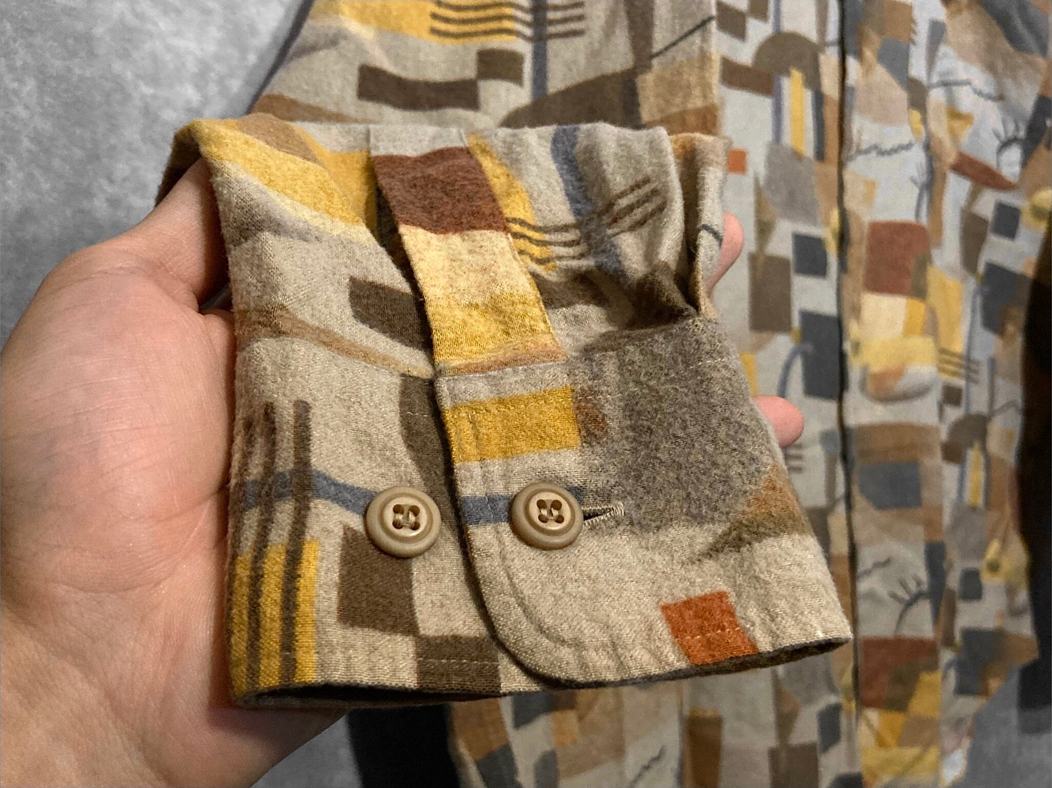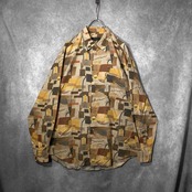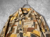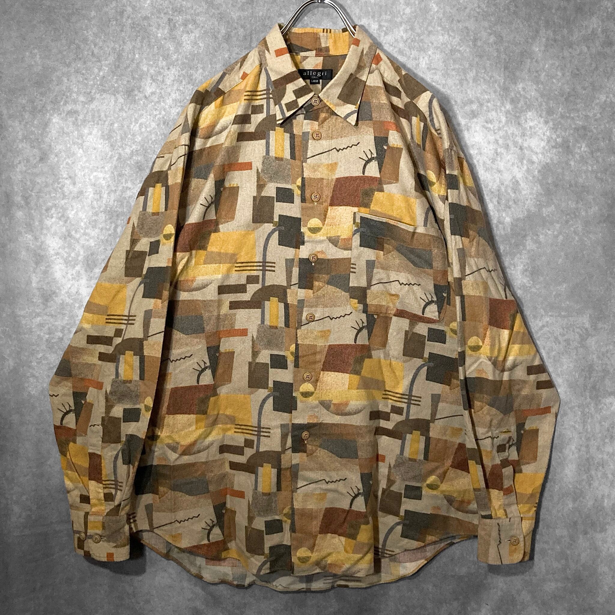 絵本の中のファンタジックな世界観のような抽象画アートの総柄シャツ。
