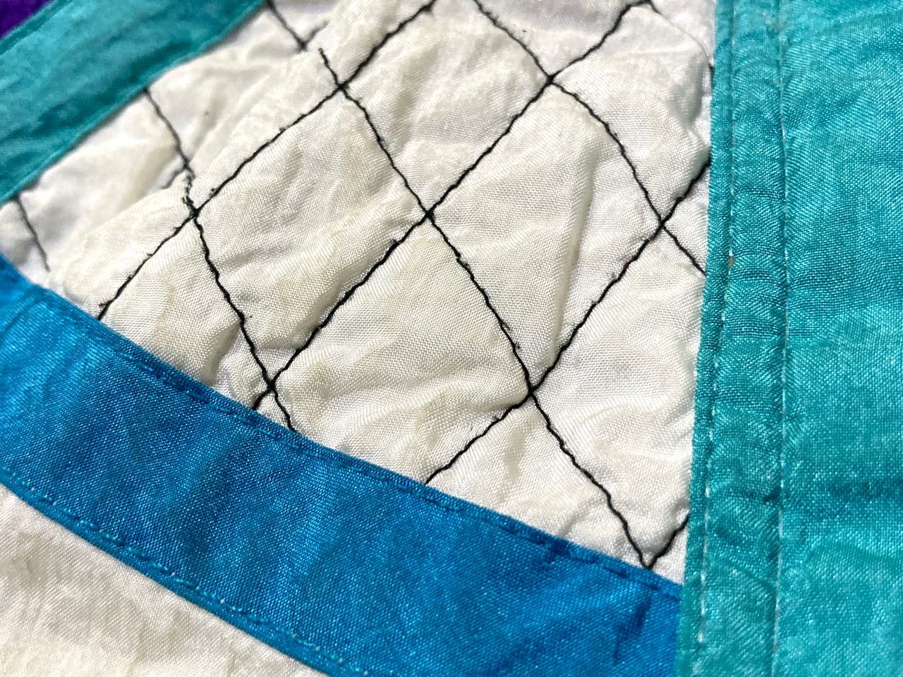 パープル、ターコイズブルー、ピーコックブルー、ベージュを組み合わせているのになぜか調和しているユニークなデザイン。