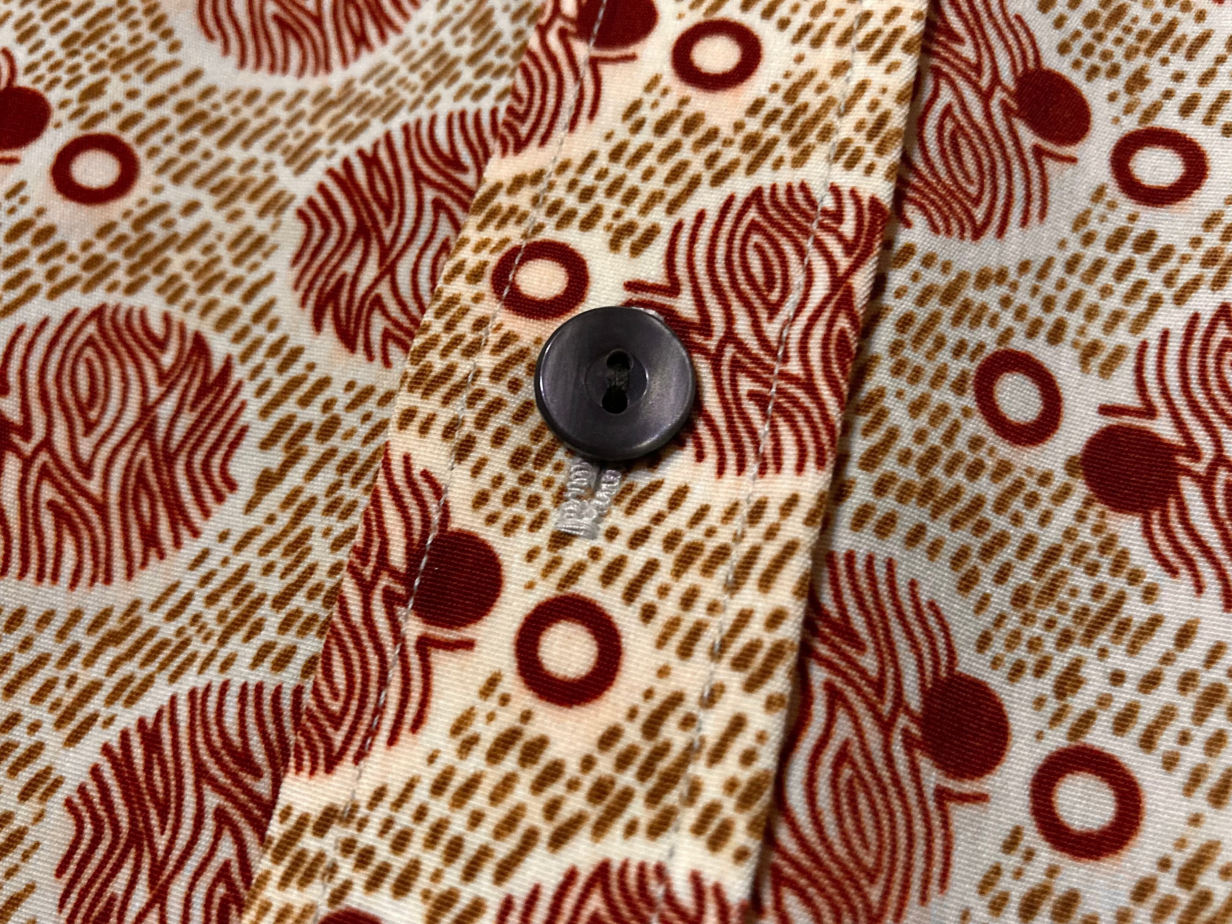細かいタッチによるアーティスティックな総柄デザインのノーカラーシャツ。