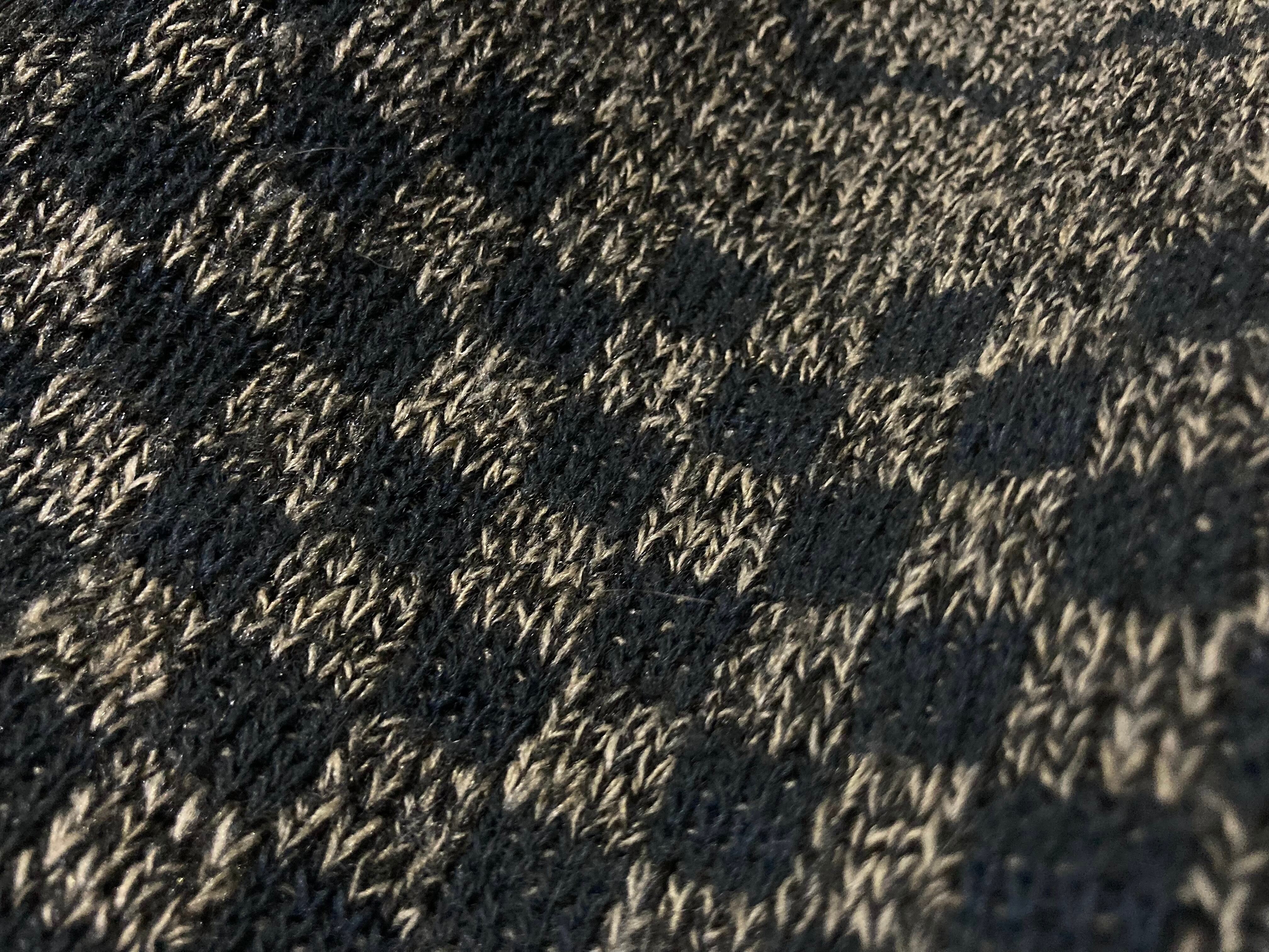 フロントがストライプ、バックはスクエアを基調としたパターンになっており、前と後ろで見え方が違うのが面白い1着です〜
