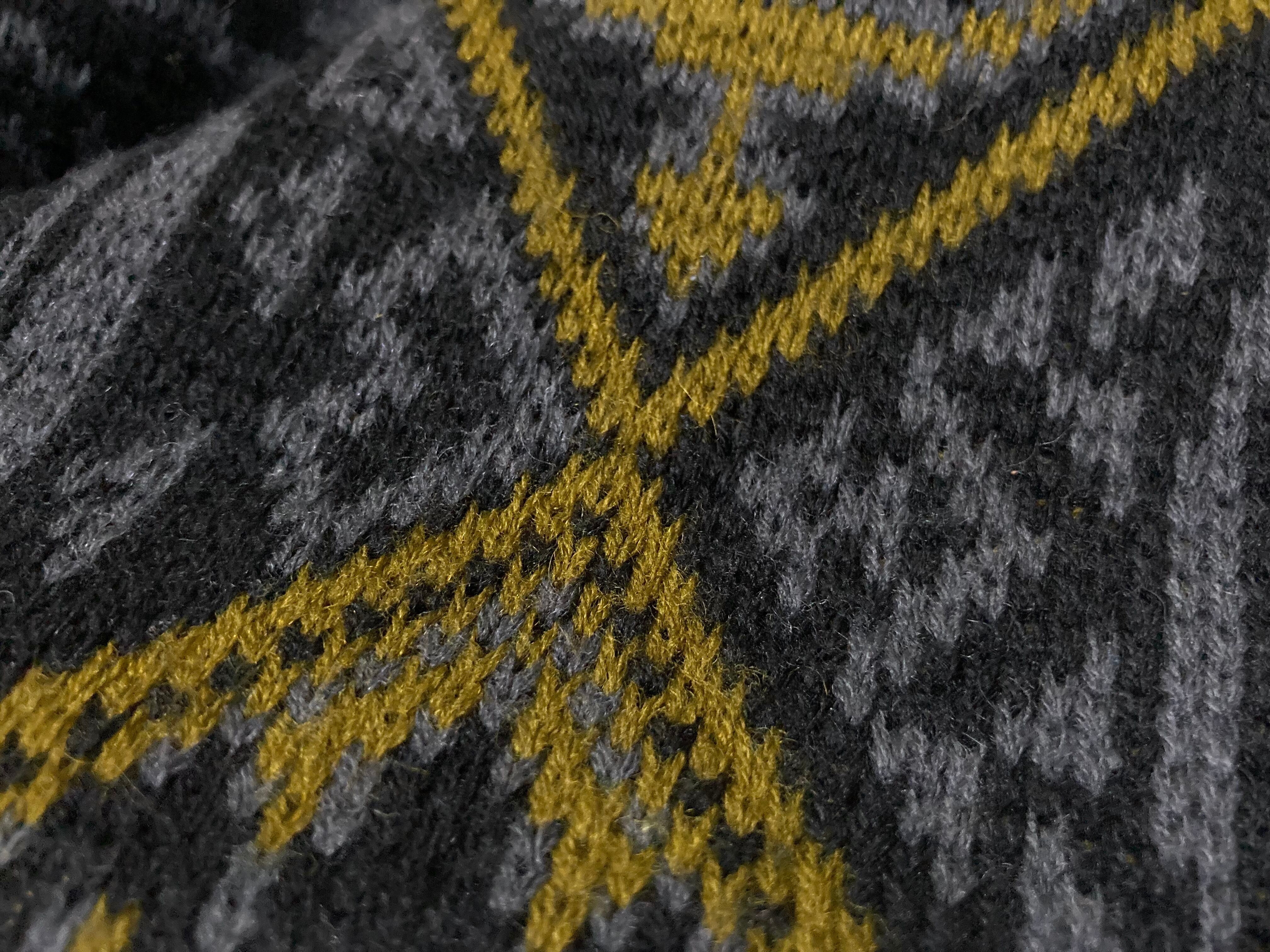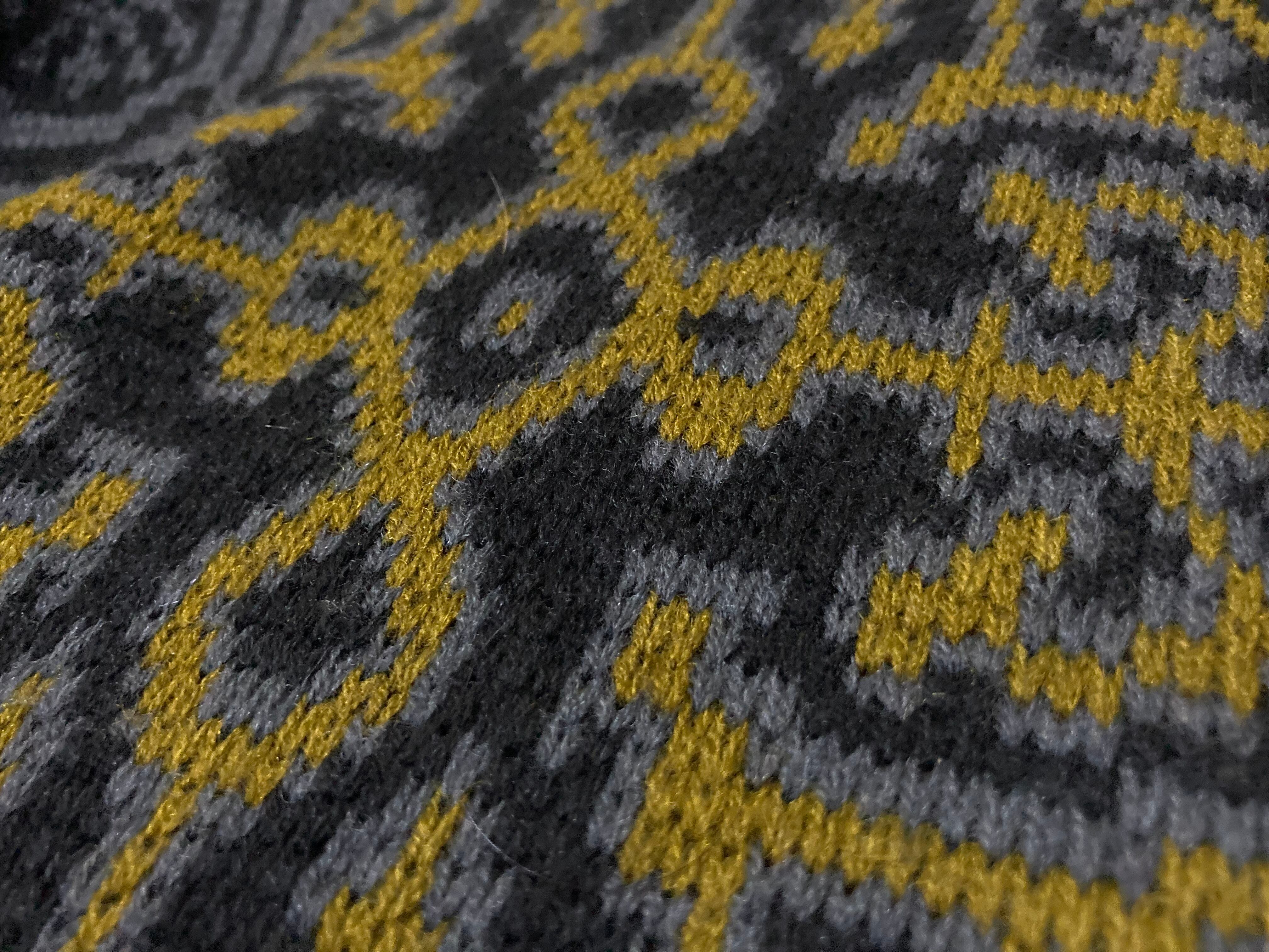 ほんのりブルー色が混ざったような仄暗いダークグレーとダークイエローの珍しい配色のデザイン。
