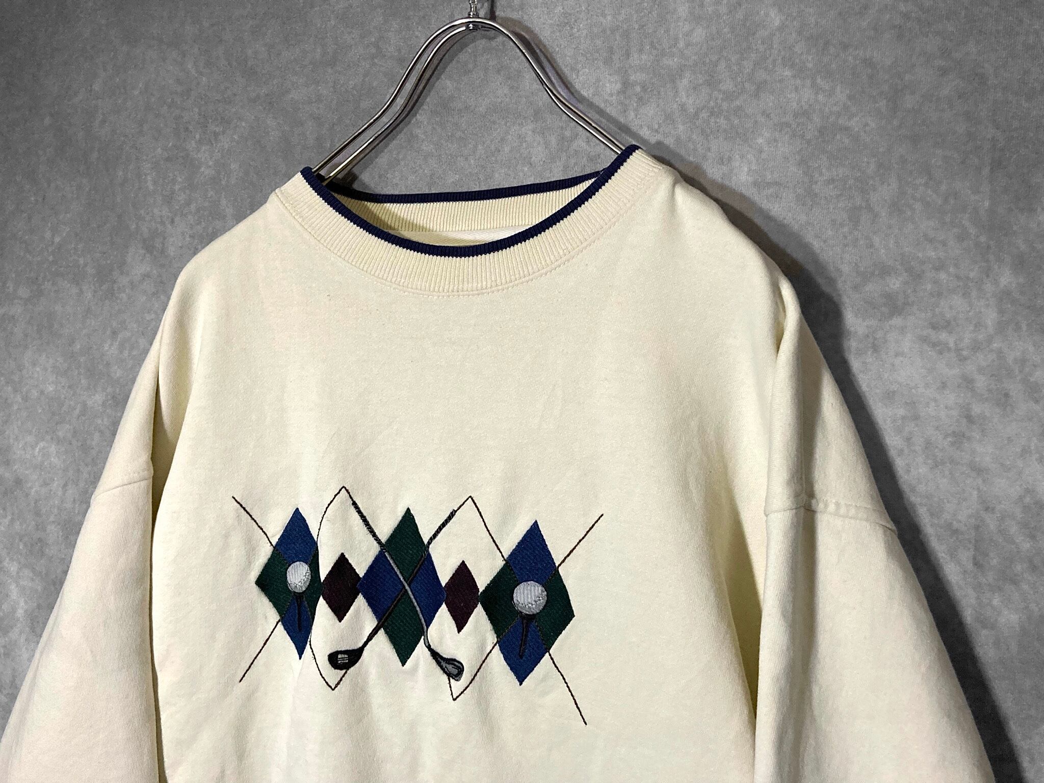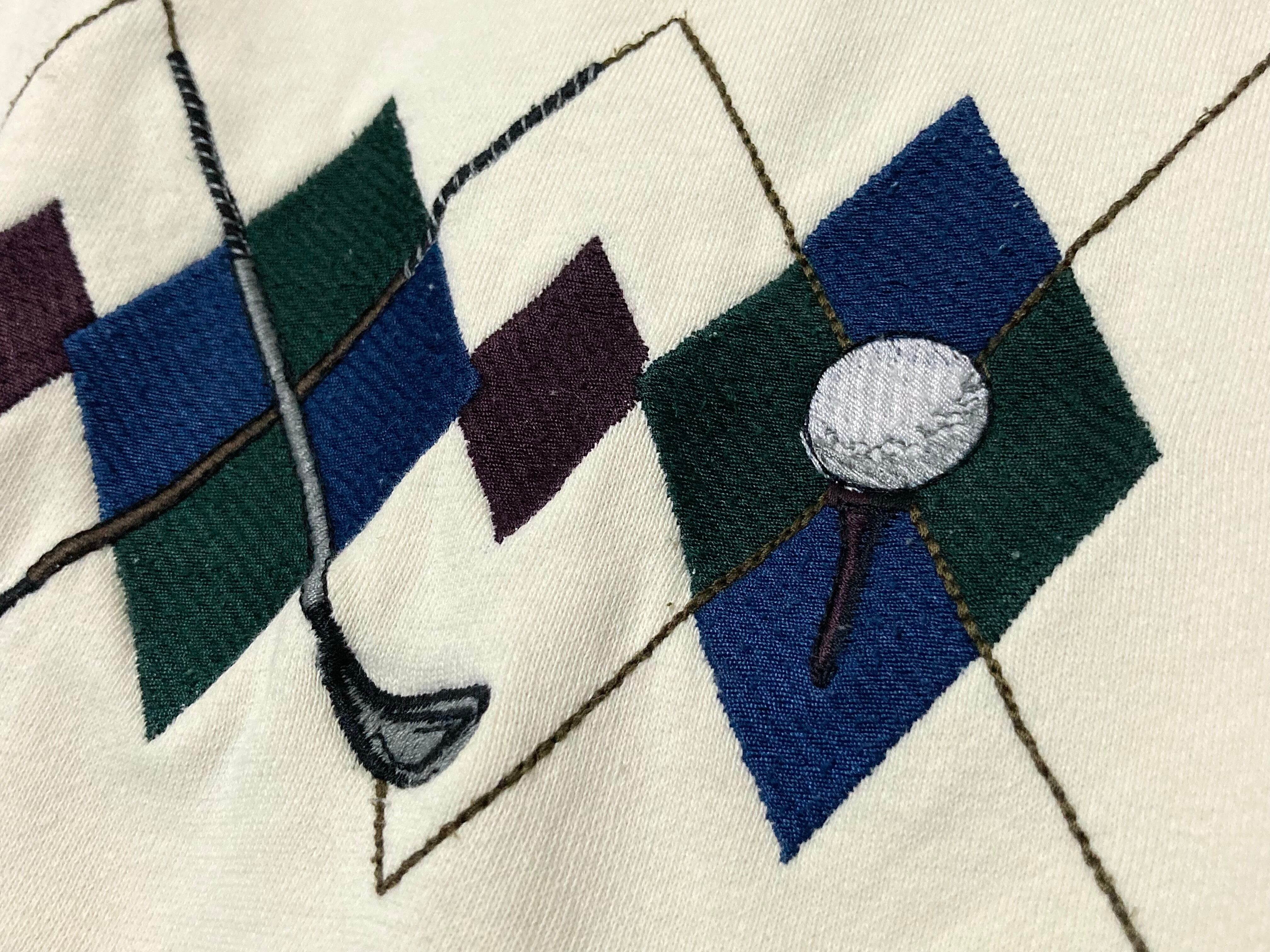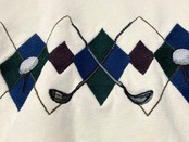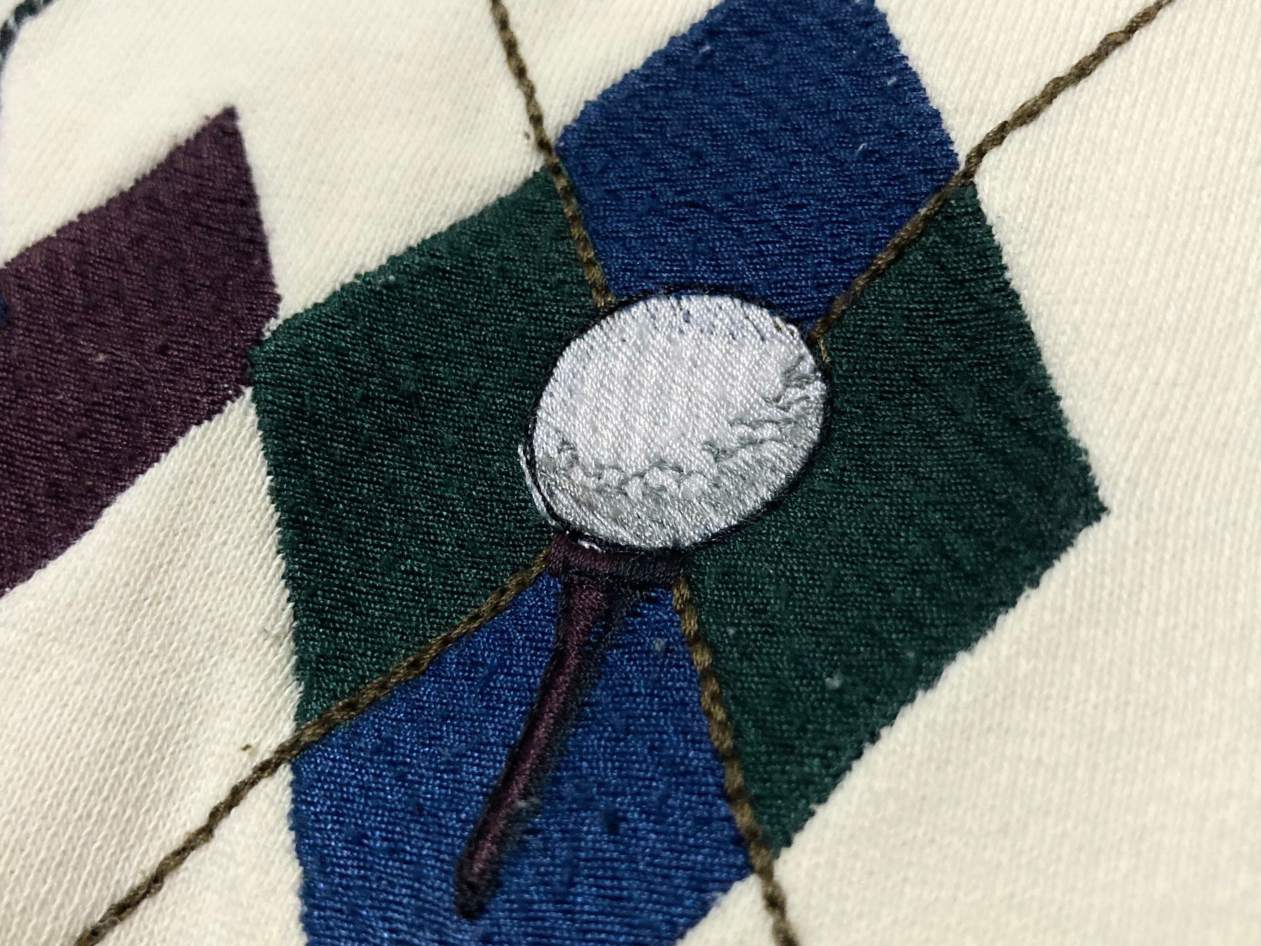 ゴルフボールとドライバーが細かく刺繍でデザインされており、3つのクロスのうちのセンターだけがゴルフクラブでクロスに見立てられたデザイン。