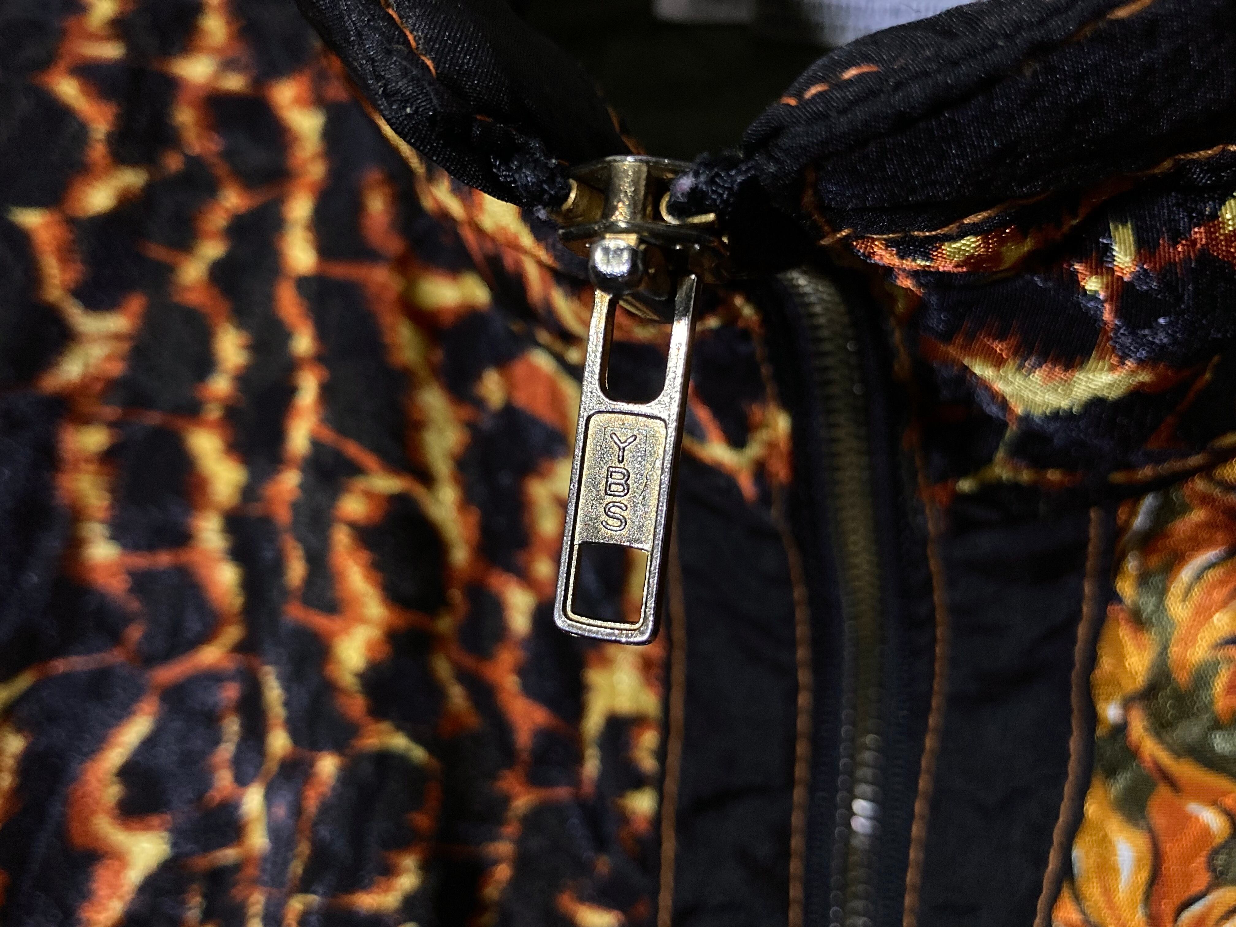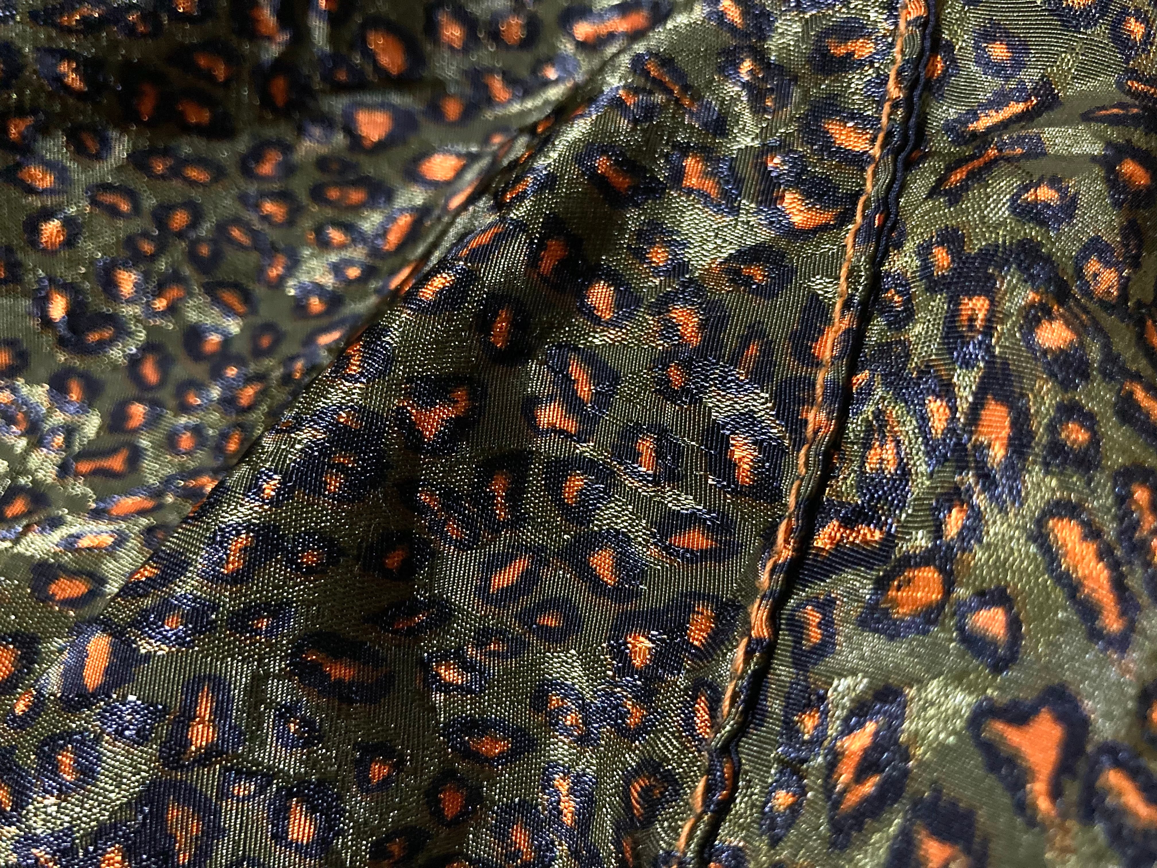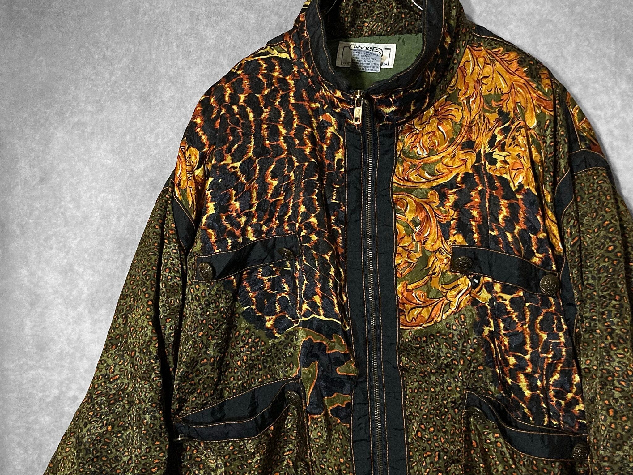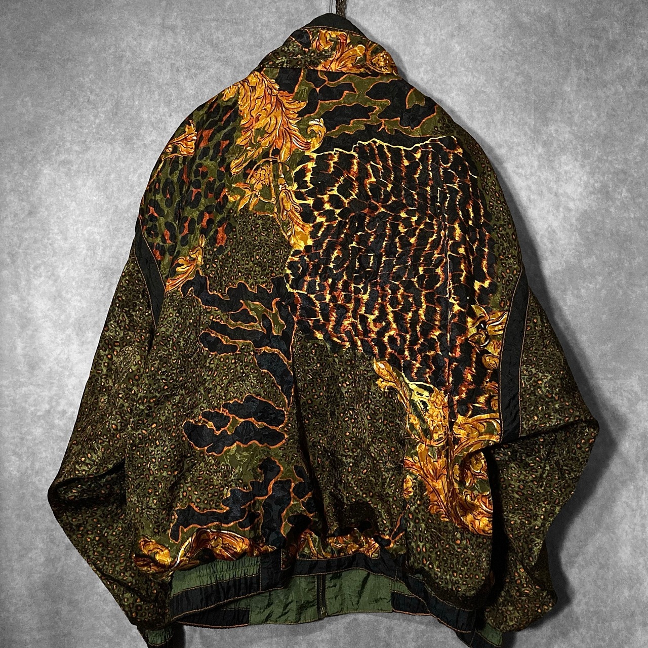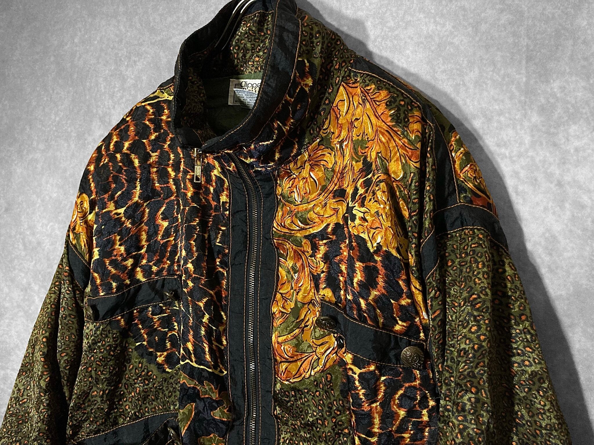 燃えるように朱いリーフ柄と細かいヒョウ柄とのコントラストが美しい雰囲気ムンムンな総柄ナイロンブルゾンの入荷です。