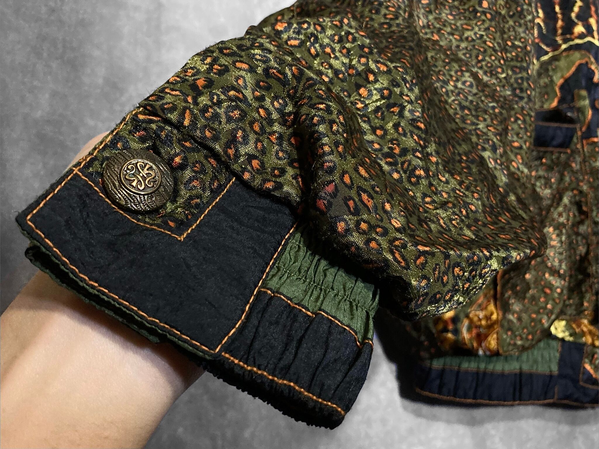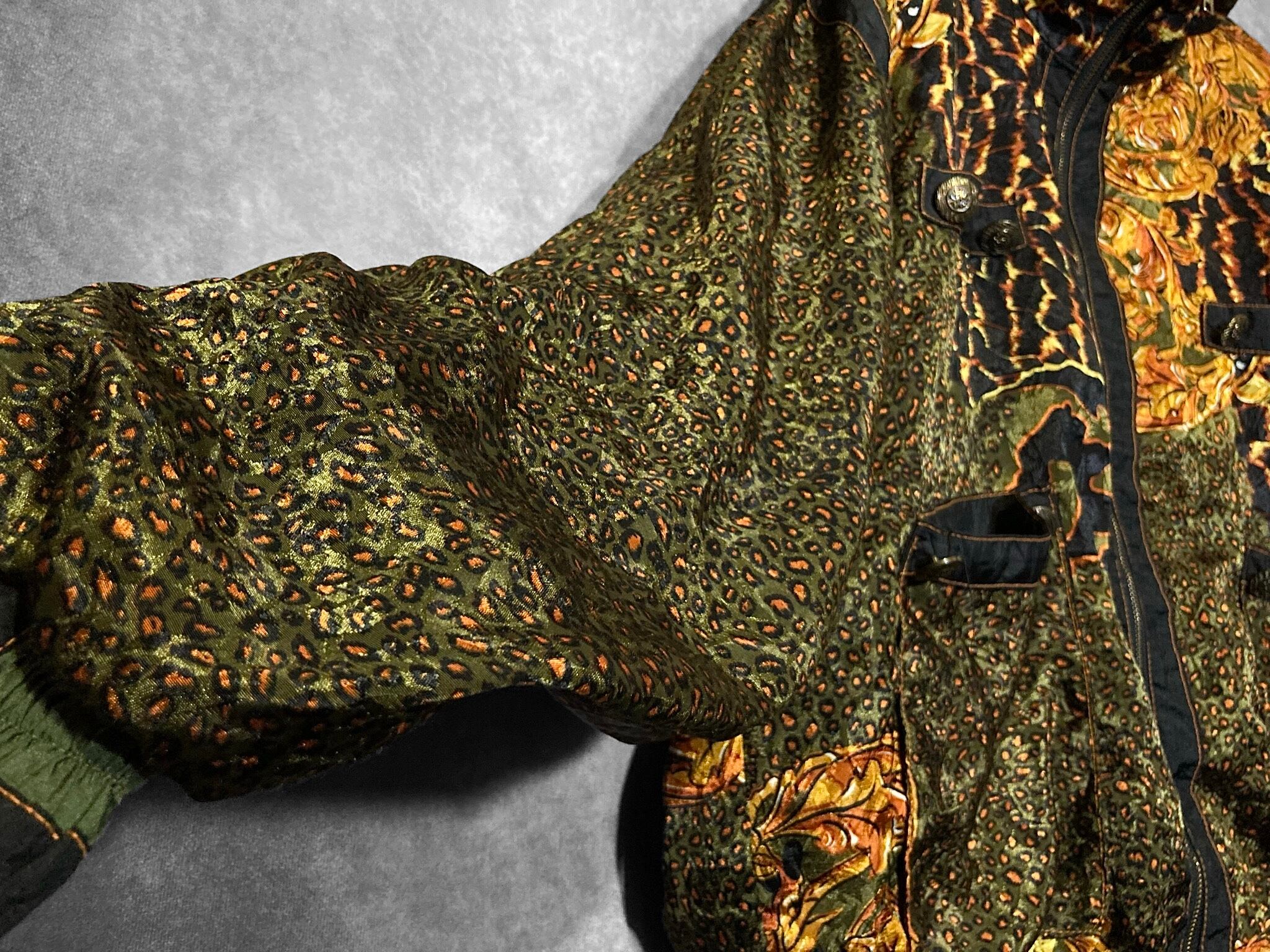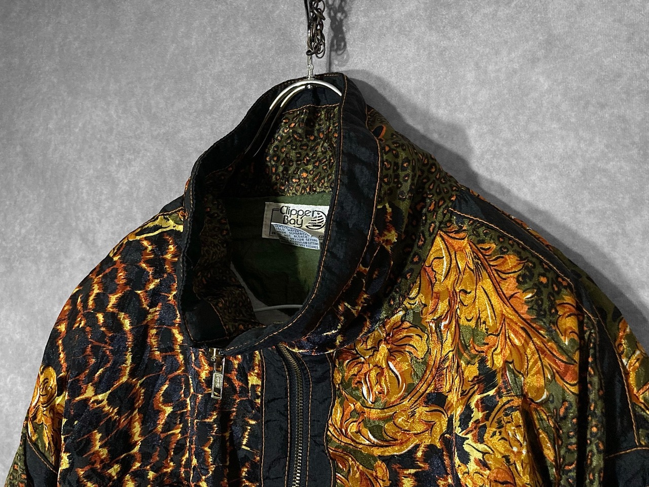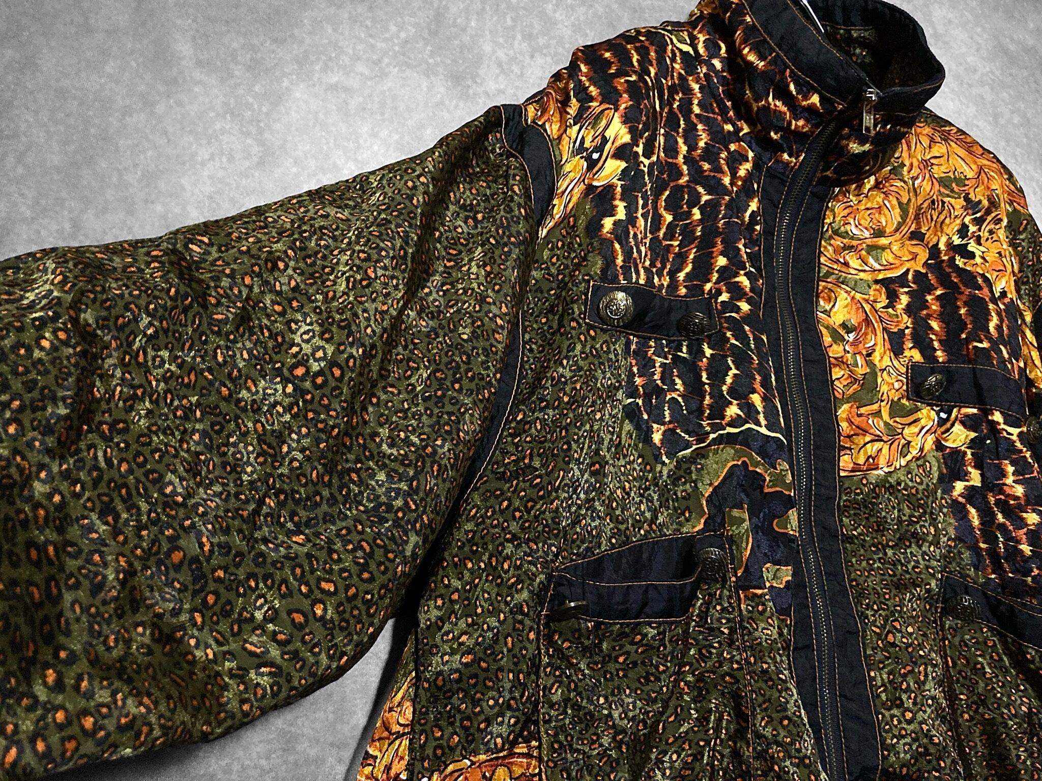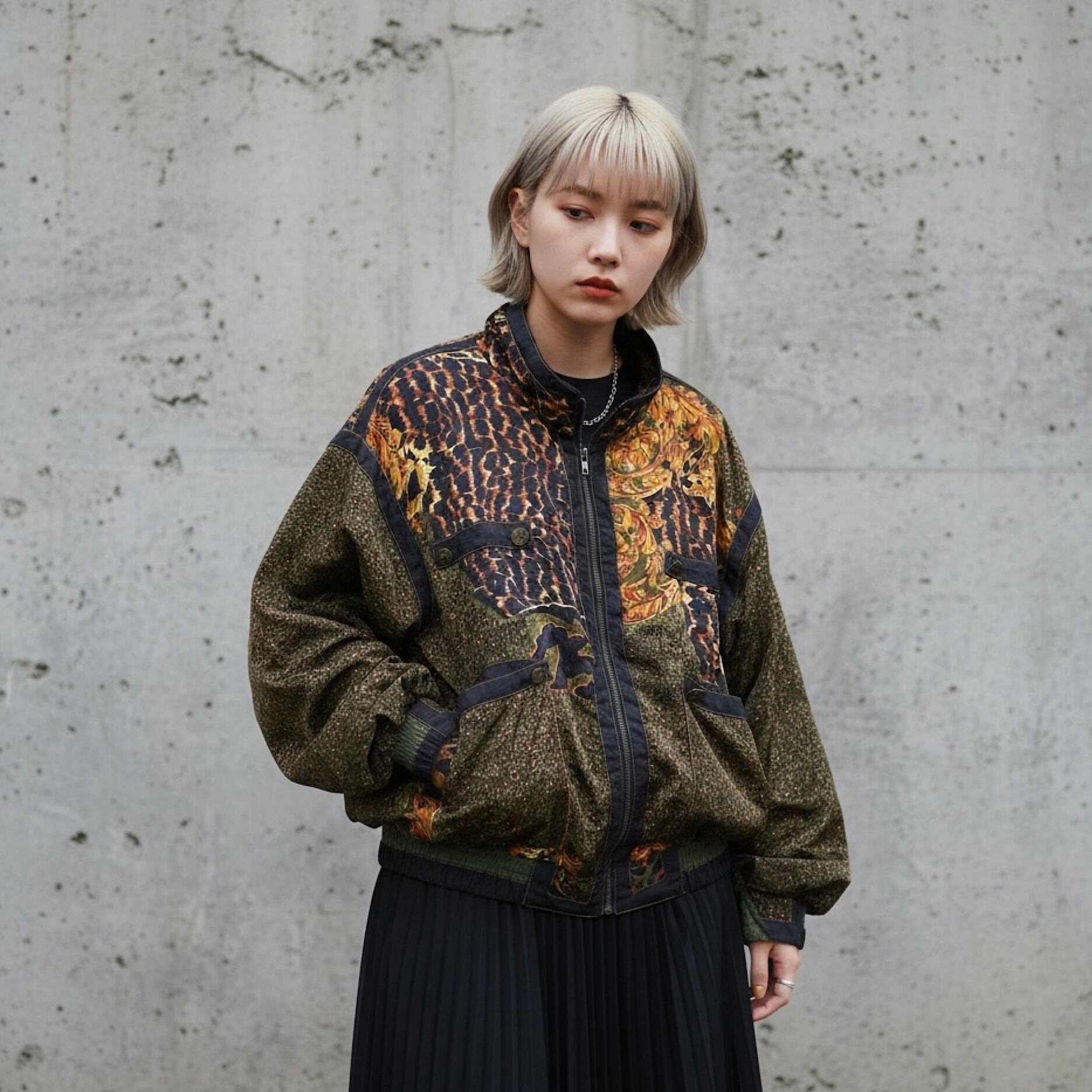 燃えるように朱いリーフ柄と細かいヒョウ柄とのコントラストが美しい雰囲気ムンムンな総柄ナイロンブルゾンの入荷です。