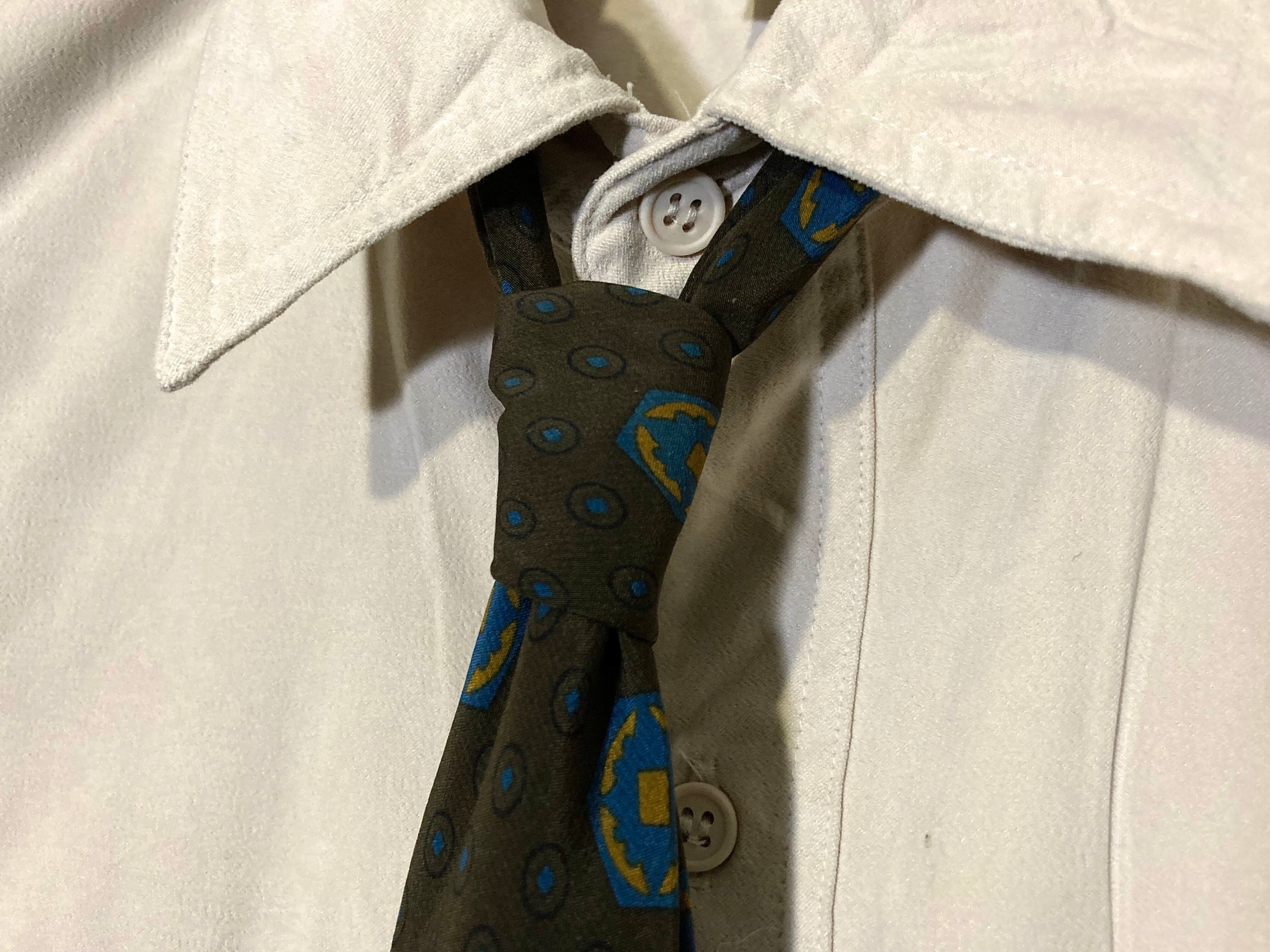 しっとりとした手触りのフェイクスウェード生地のシャツと深いブラウンの色味の総柄デザインのネクタイを組み合わせたセットコーデ。