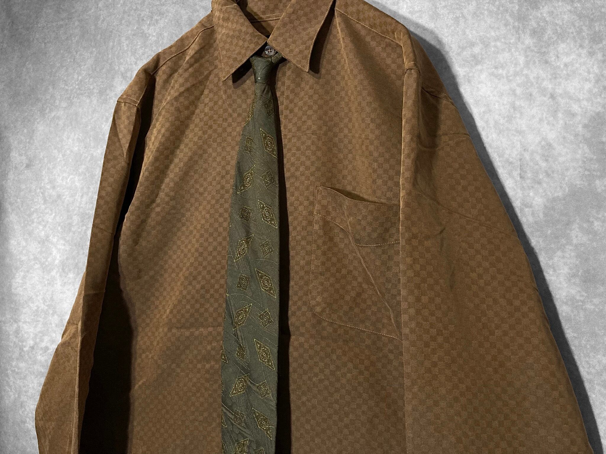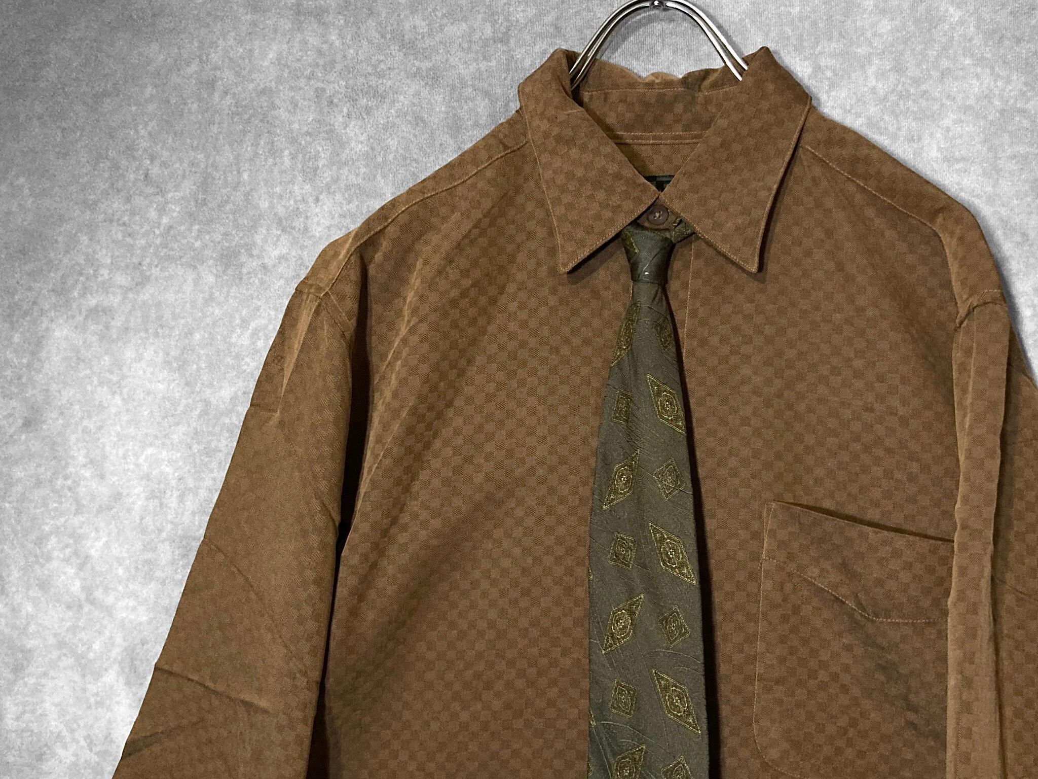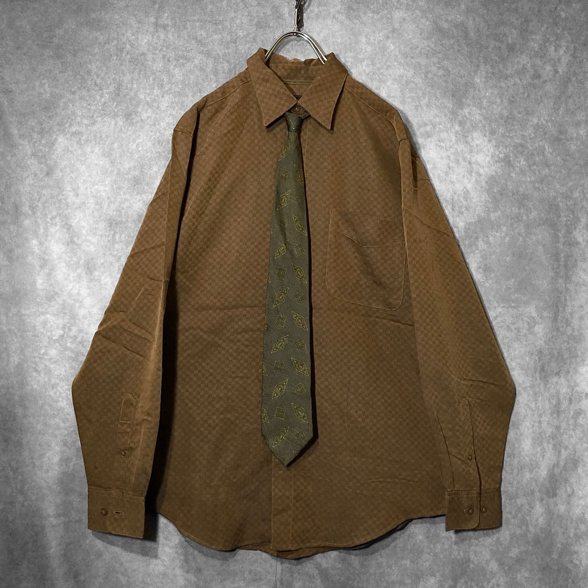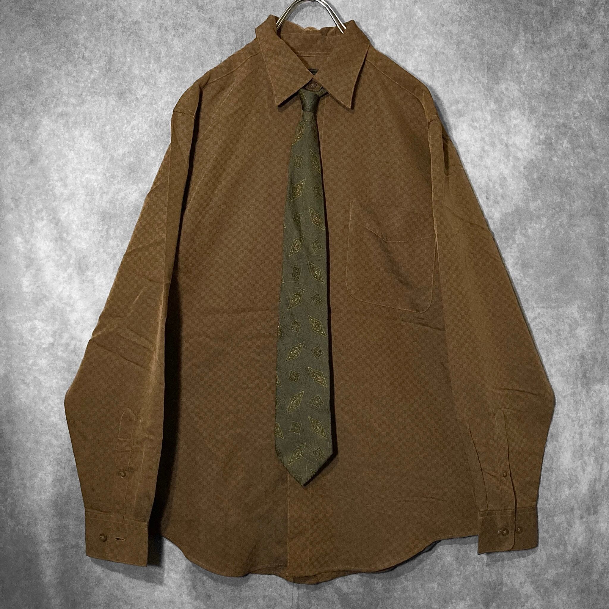 XL Hidden Four square all over pattern design Brown color L/S shirt × Khaki color Bewitching all over pattern design Necktie set
