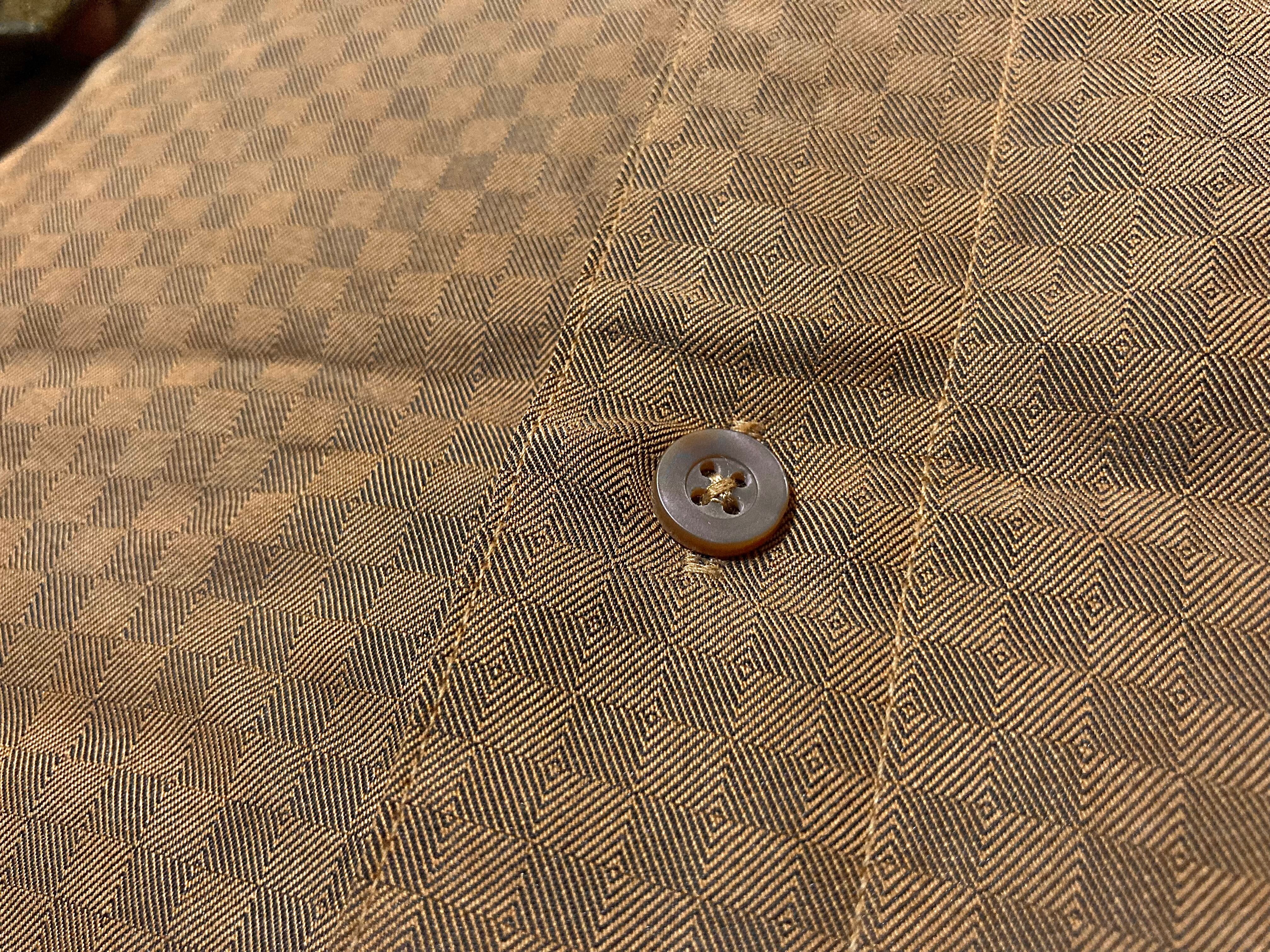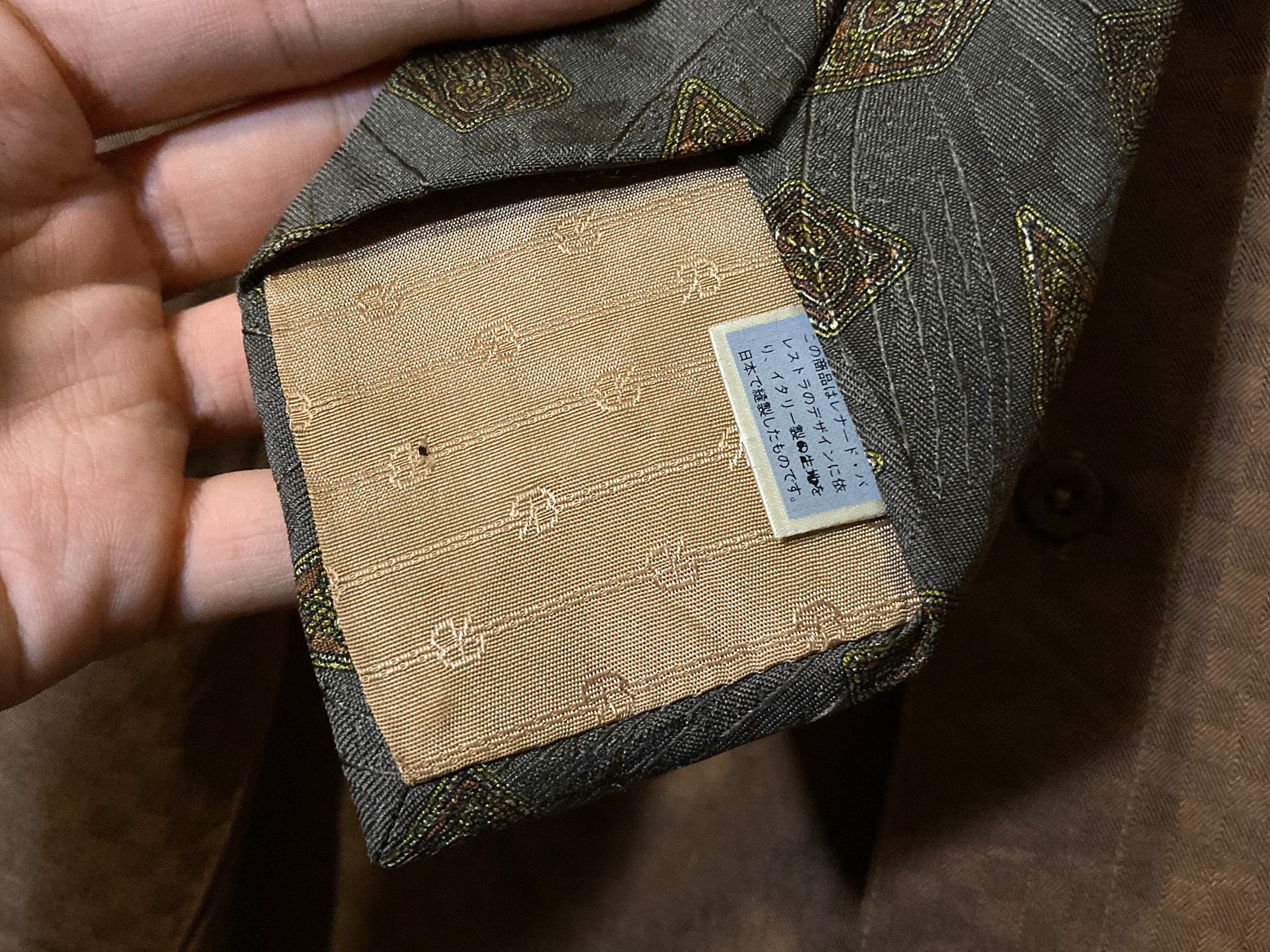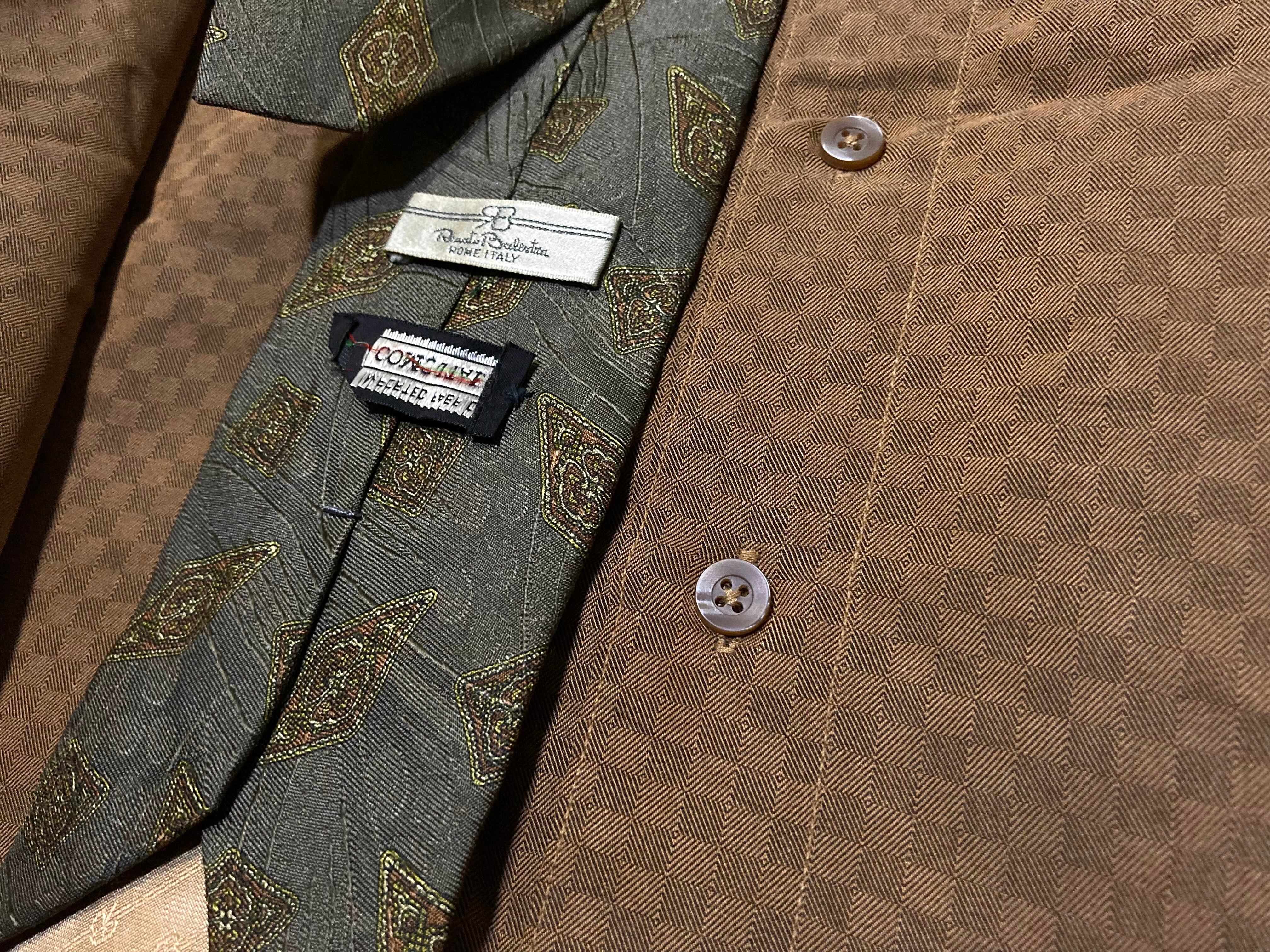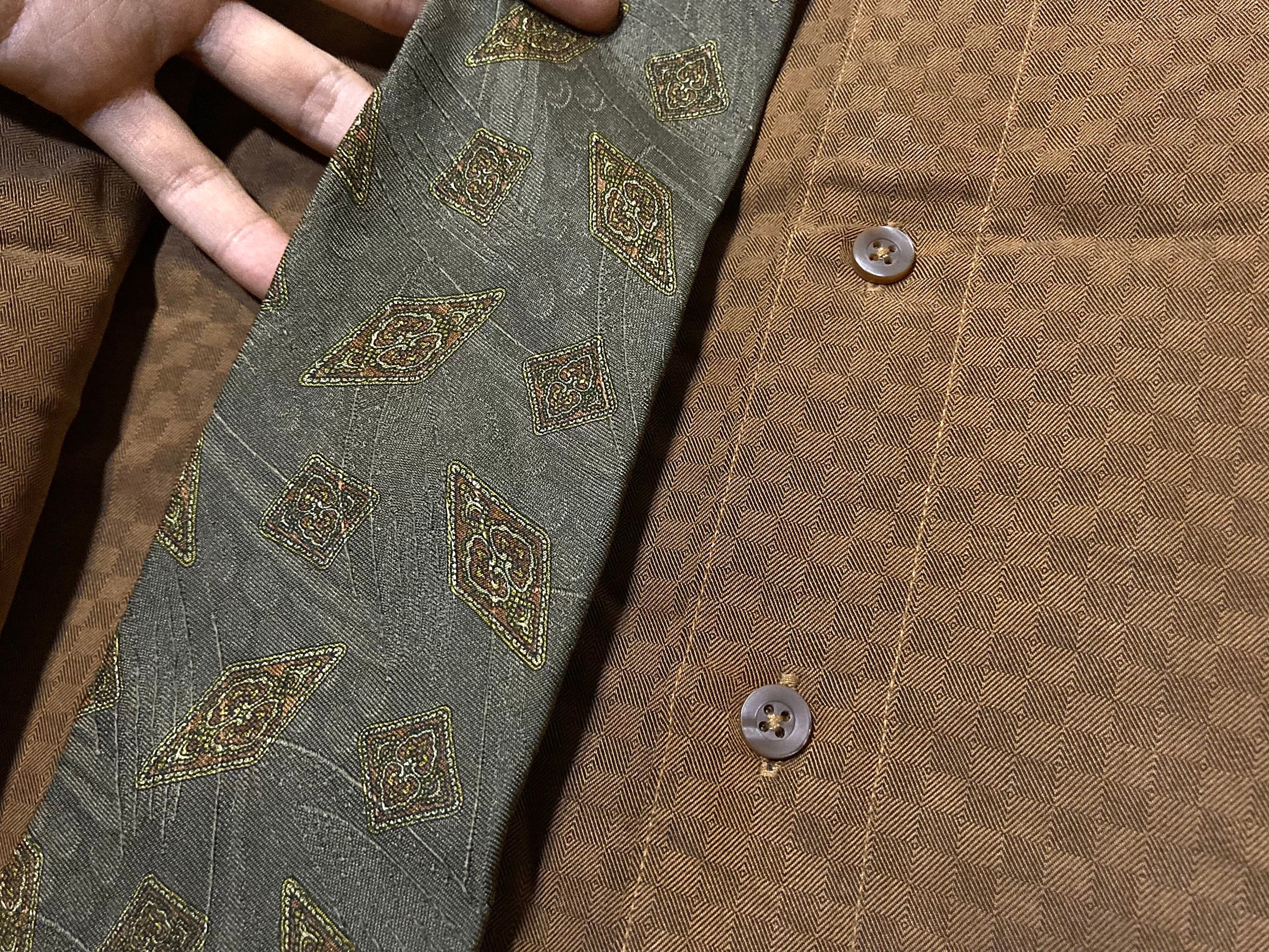 ほっこり暖かみを感じるブラウンカラーのシャツとカーキ色の総柄ネクタイのセットの入荷です。