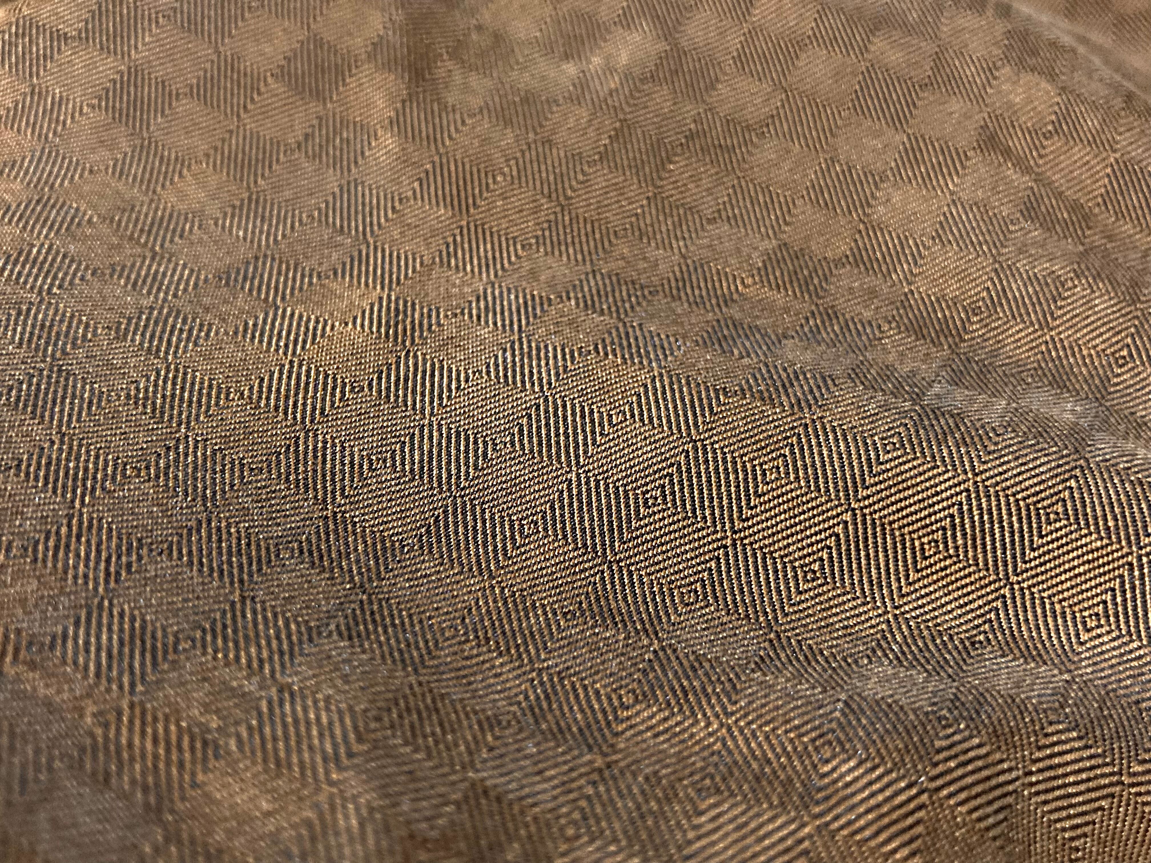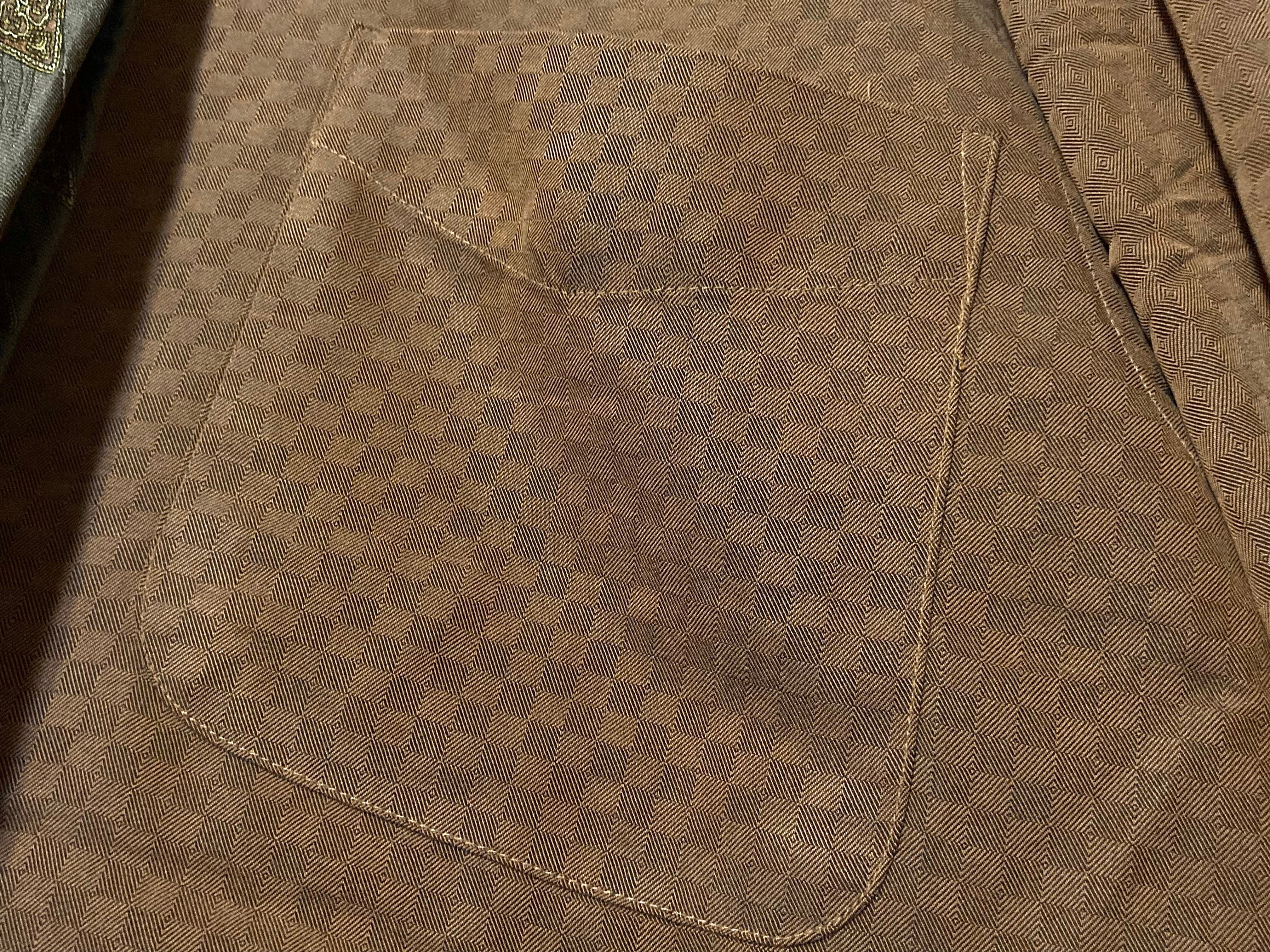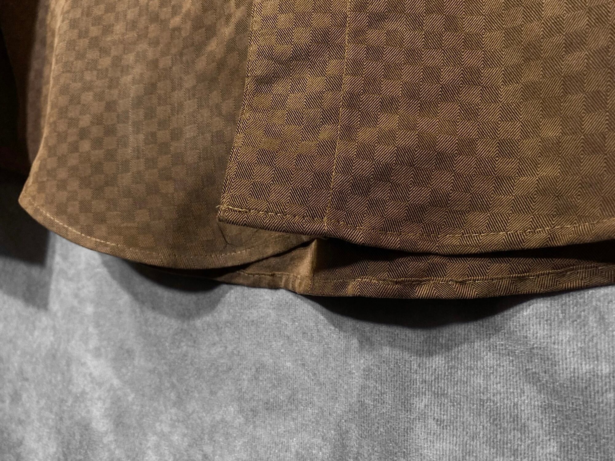 表面に薄っすらと見えるスクエアパターン柄のデザインで、プレーンのように見えてさりげないデザインが可愛いブラウンカラーシャツ。
