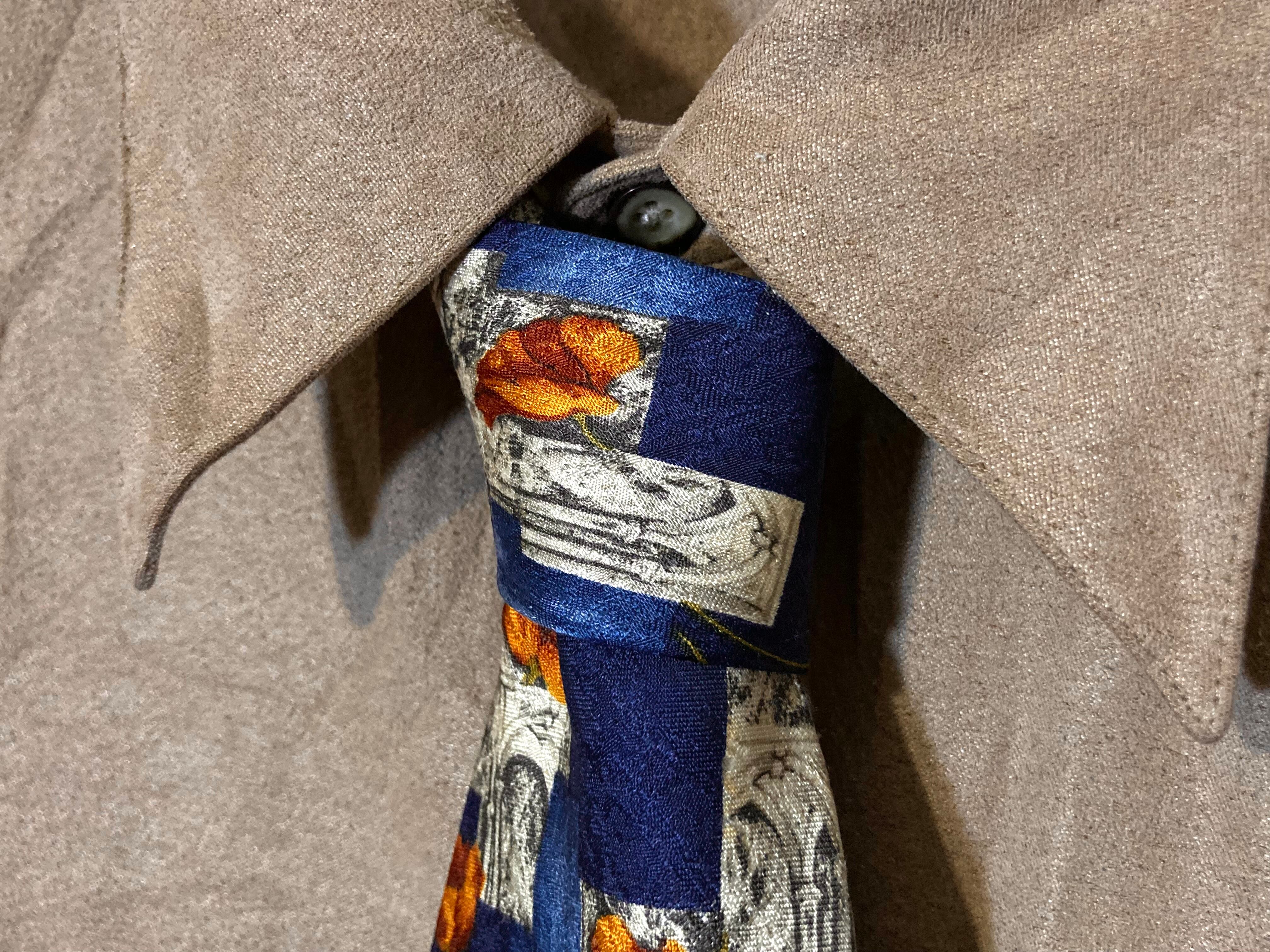 オレンジと同系色であるライトブラウンのシャツと合わせることでよりアーティスティックでハイセンスなデザインのネクタイが引き立ちます◎