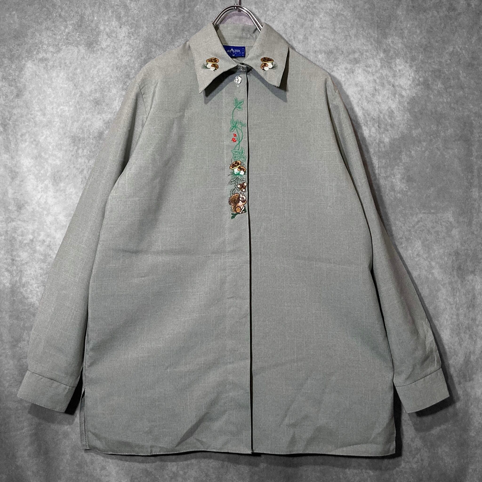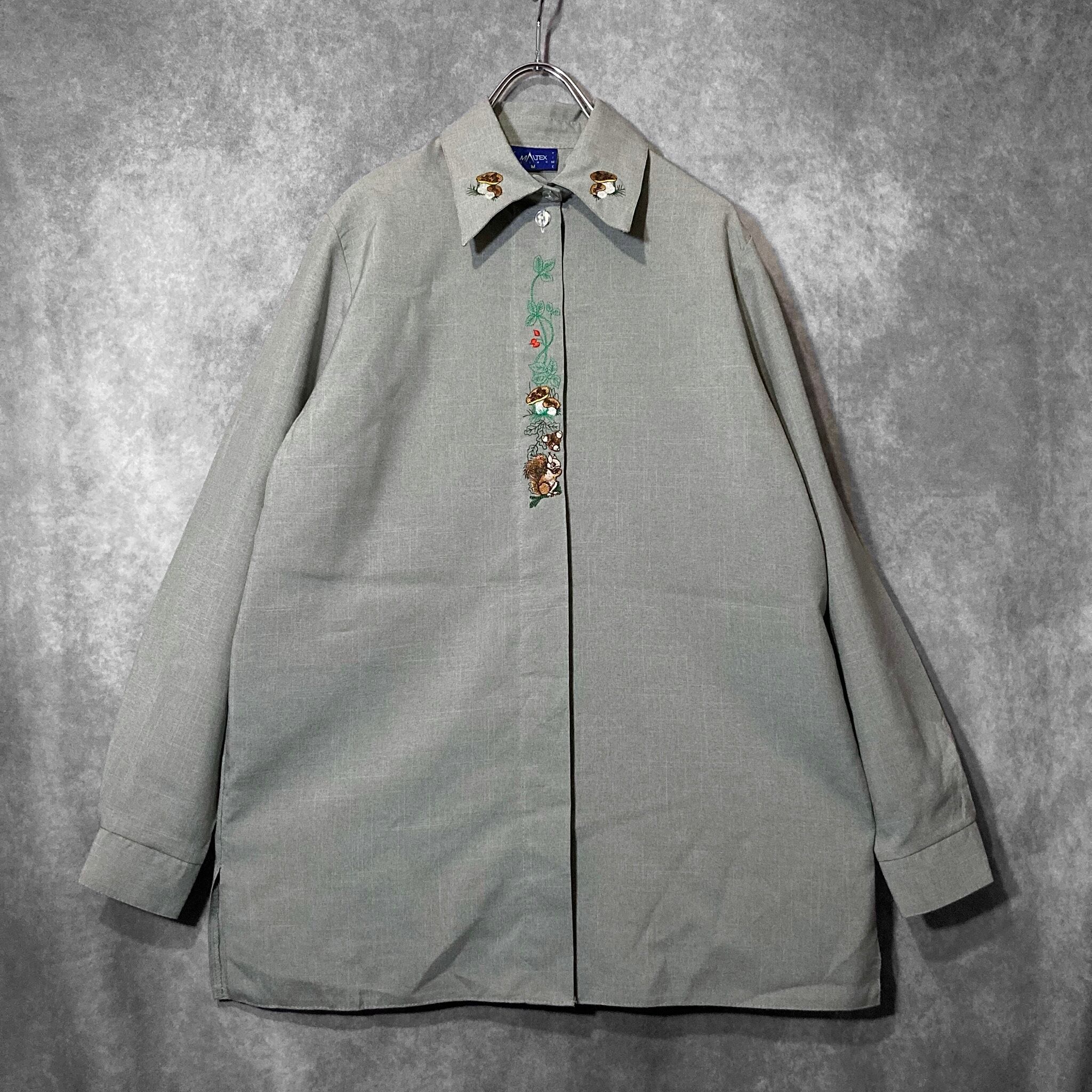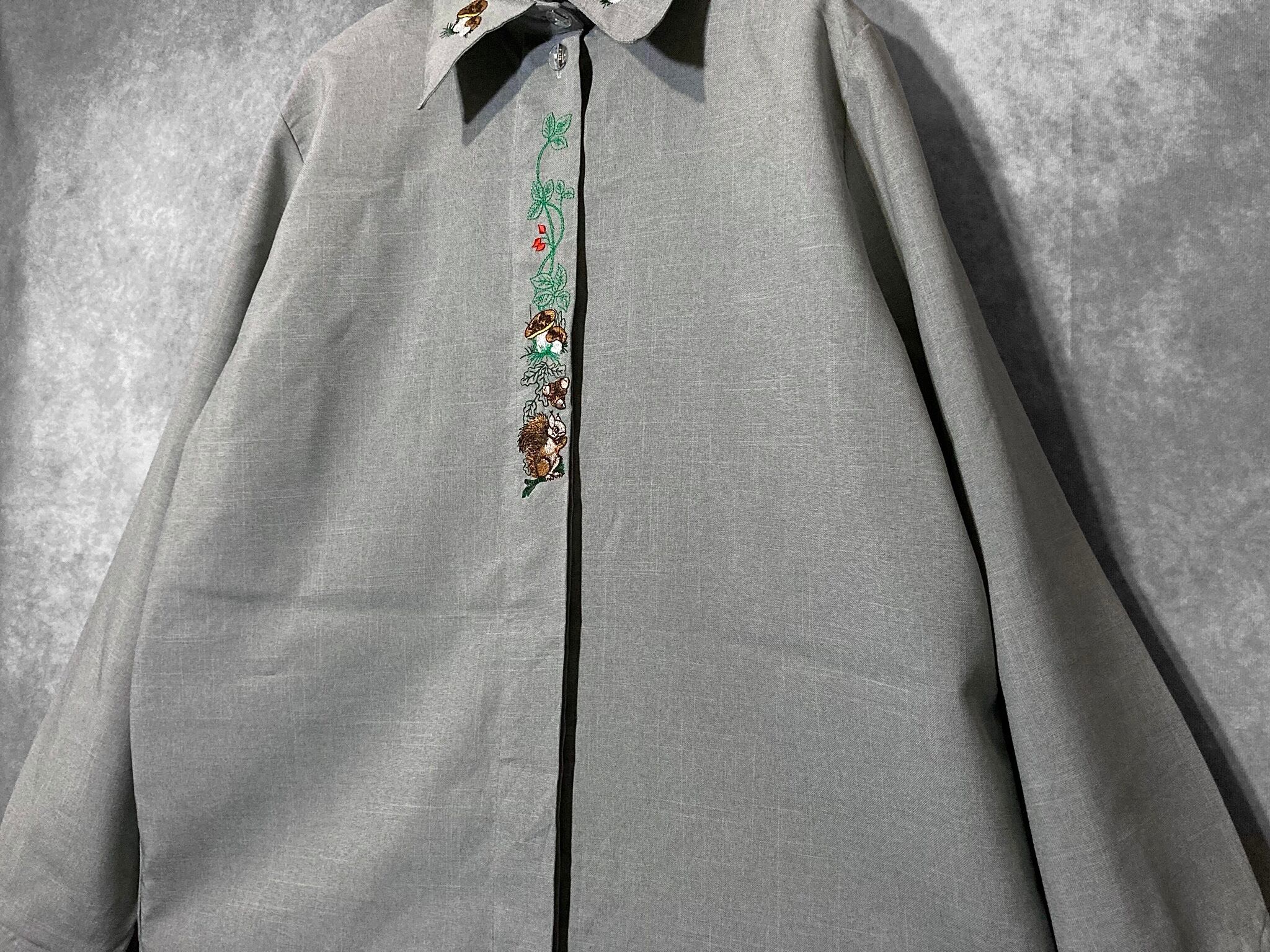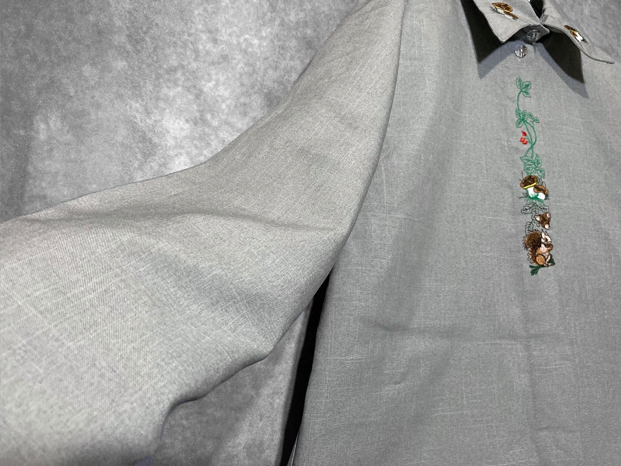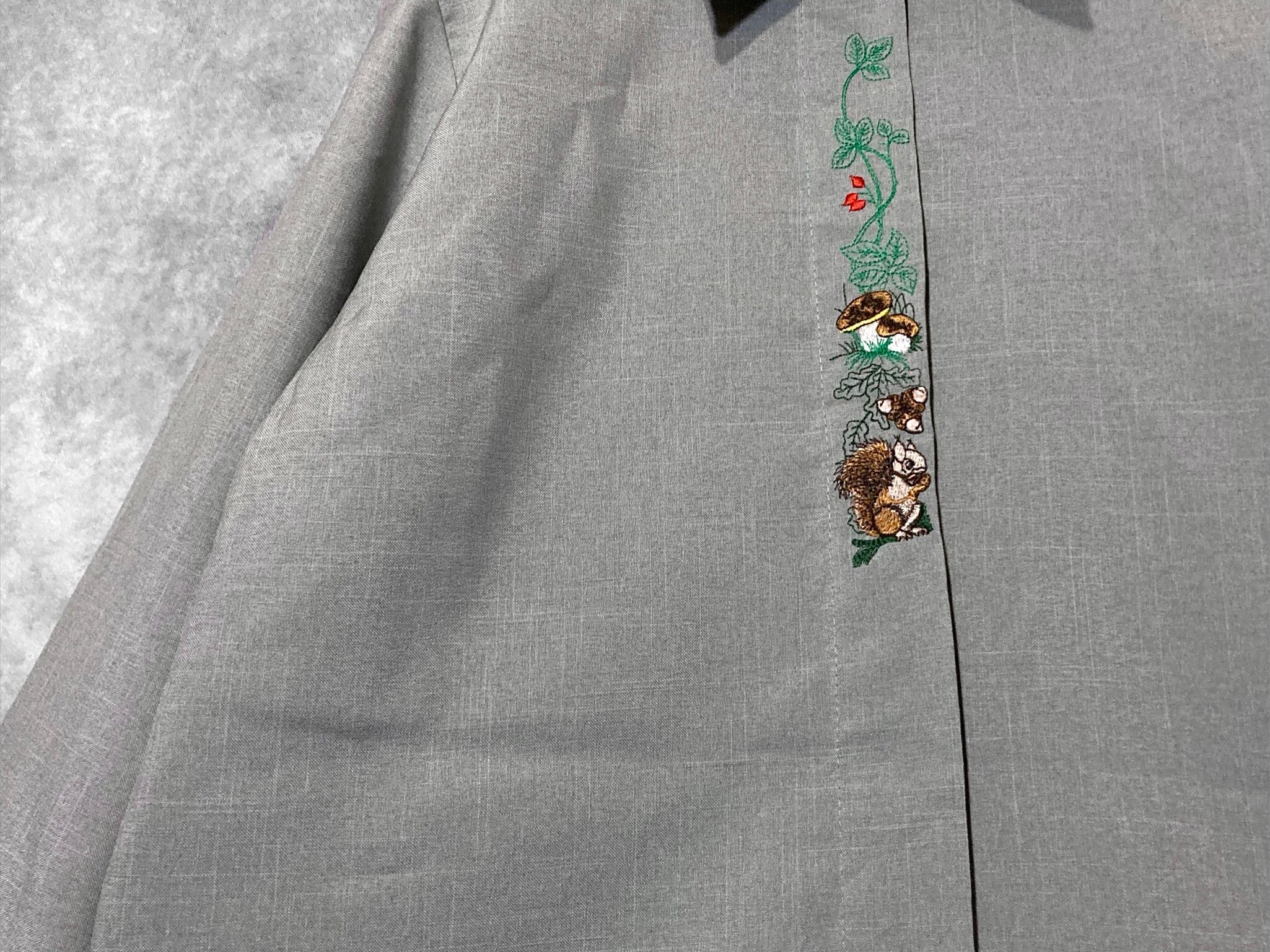 Squirrel and mushroom embroidery design L/S chambray Gray shirt