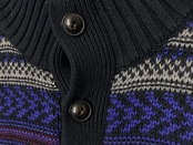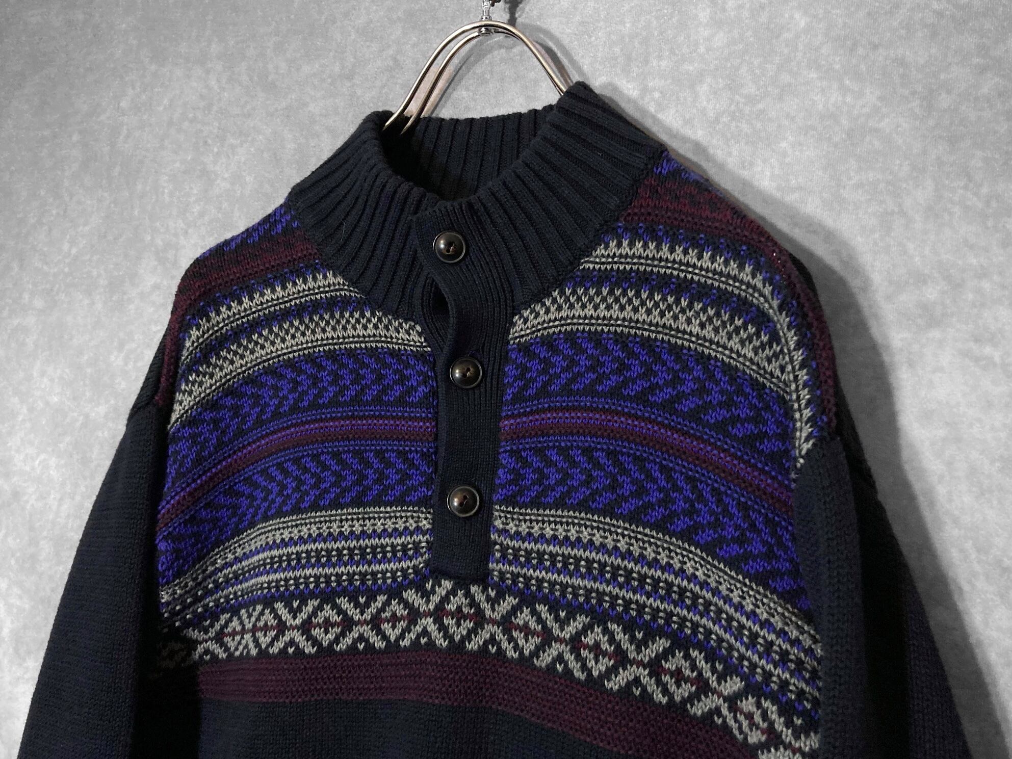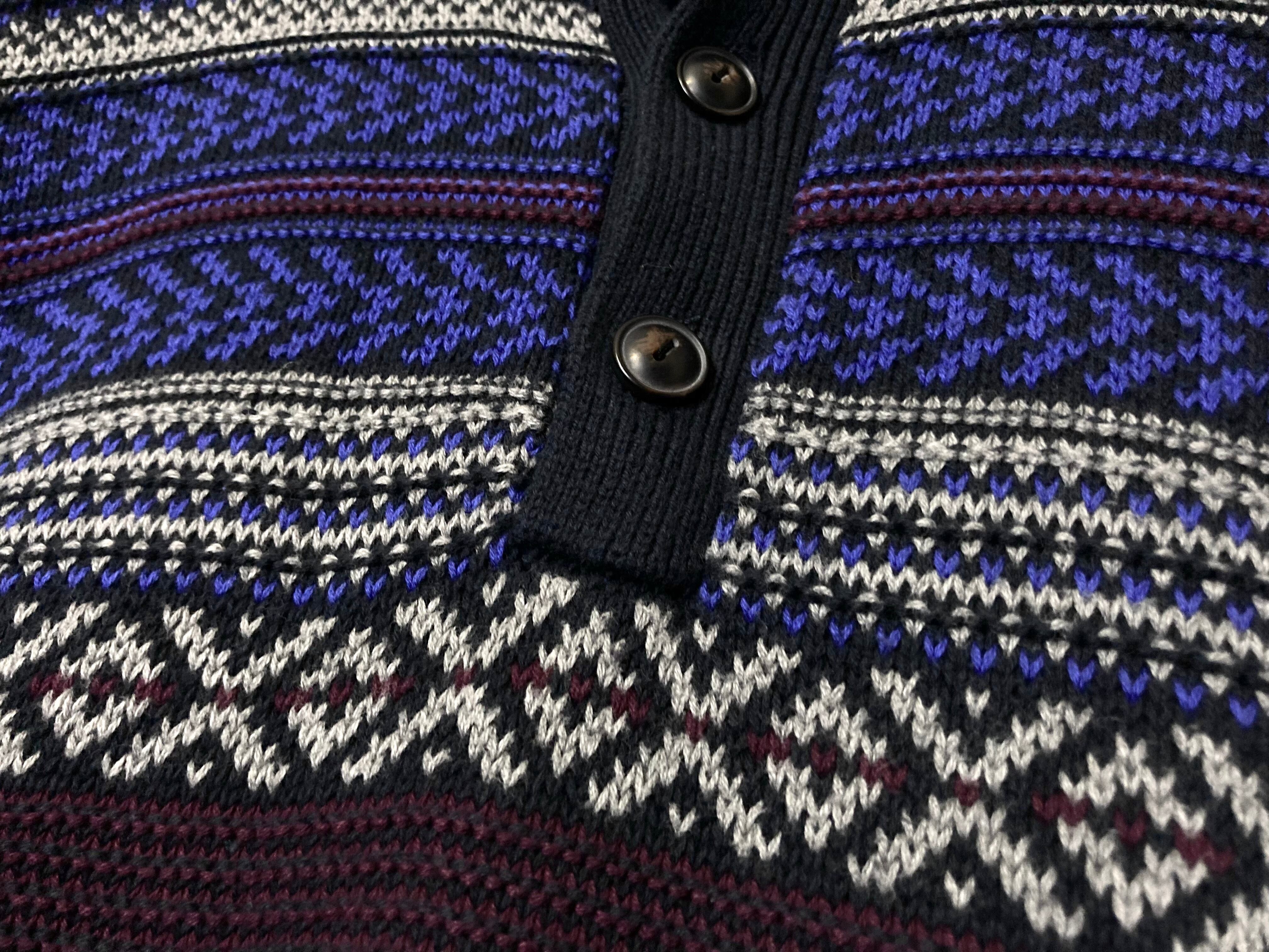 目を惹くパープルのジャガード柄デザインが可愛いハーフボタンのニットプルオーバー。