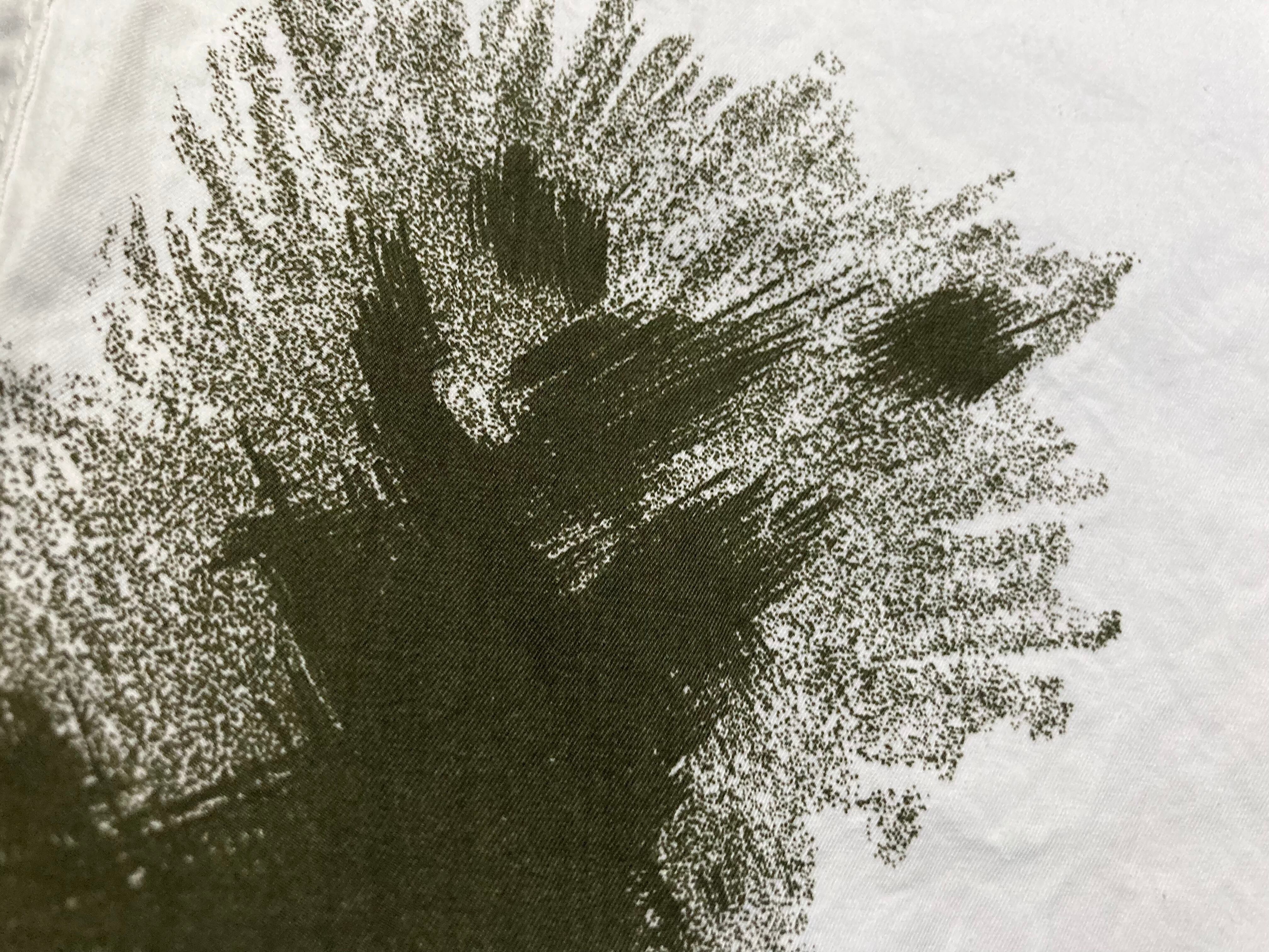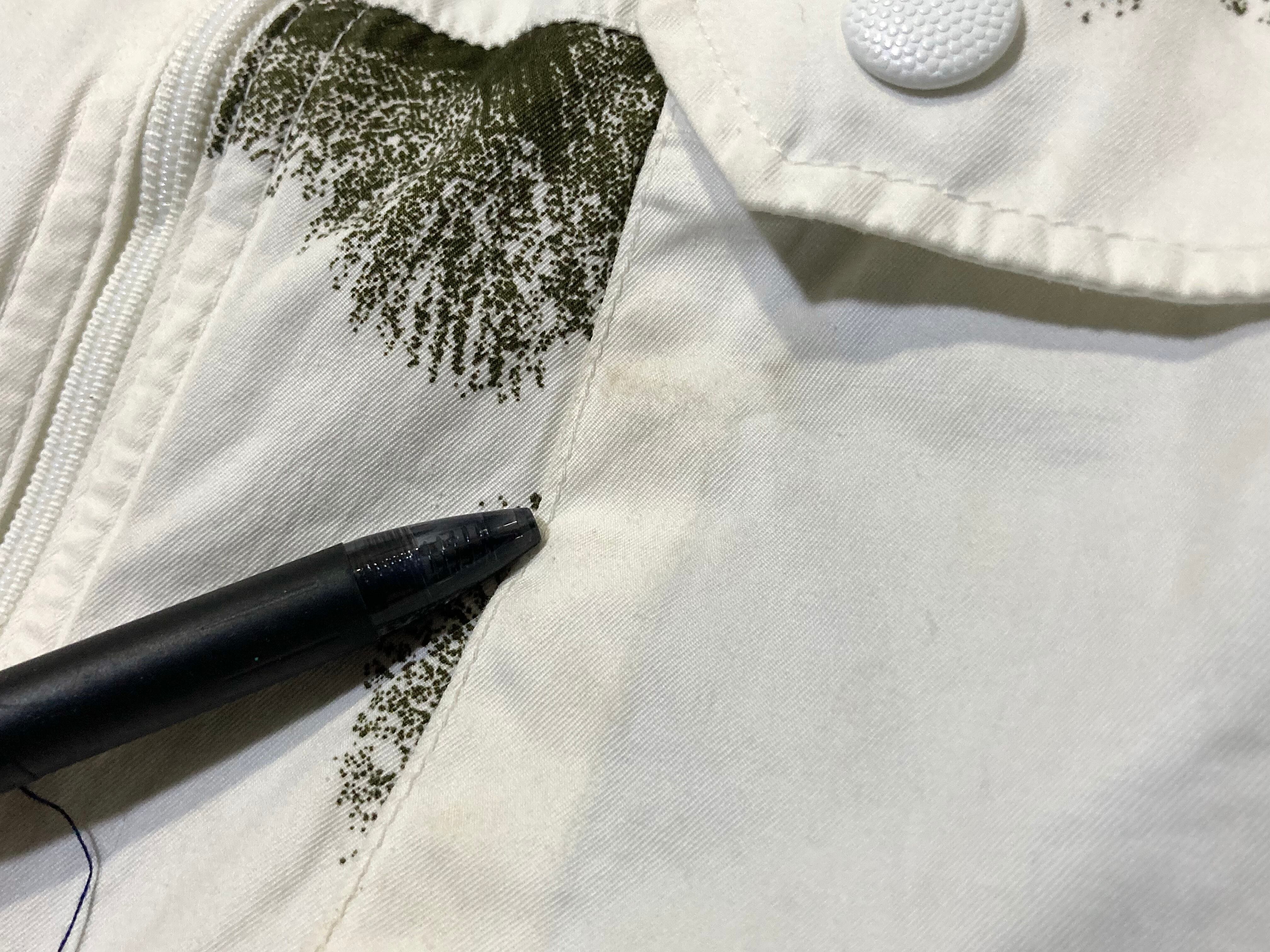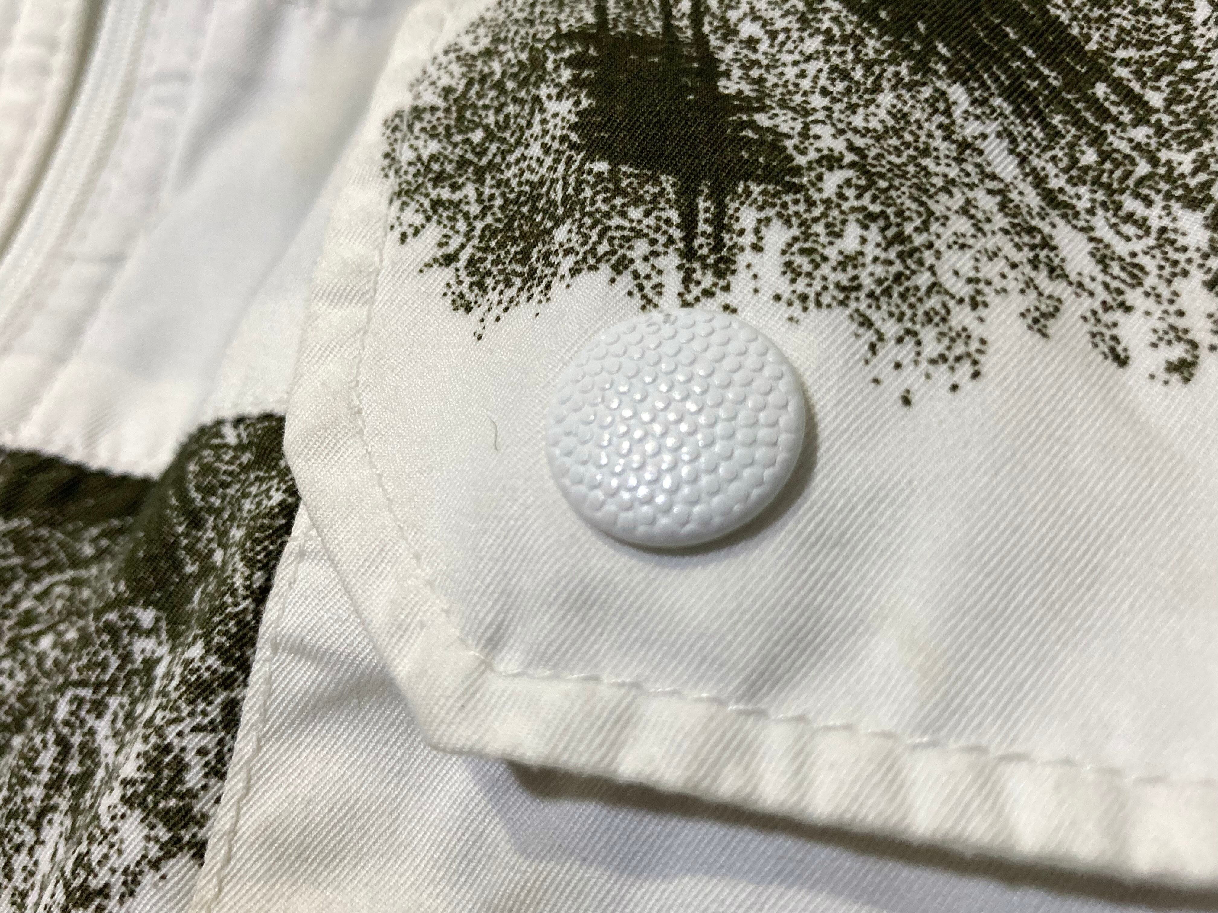 一見、泥で汚れているかのようなカーキの幻影グラフィックが全体にランダムに配され、スノーホワイトとのコントラストが絶妙です。