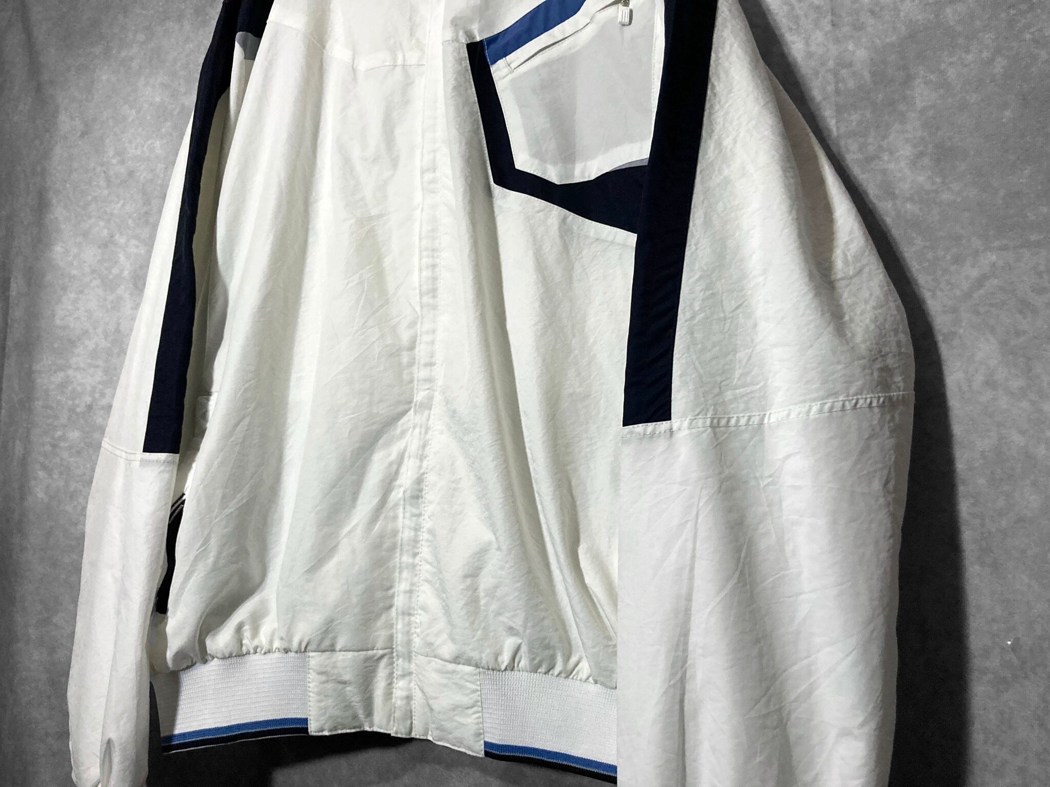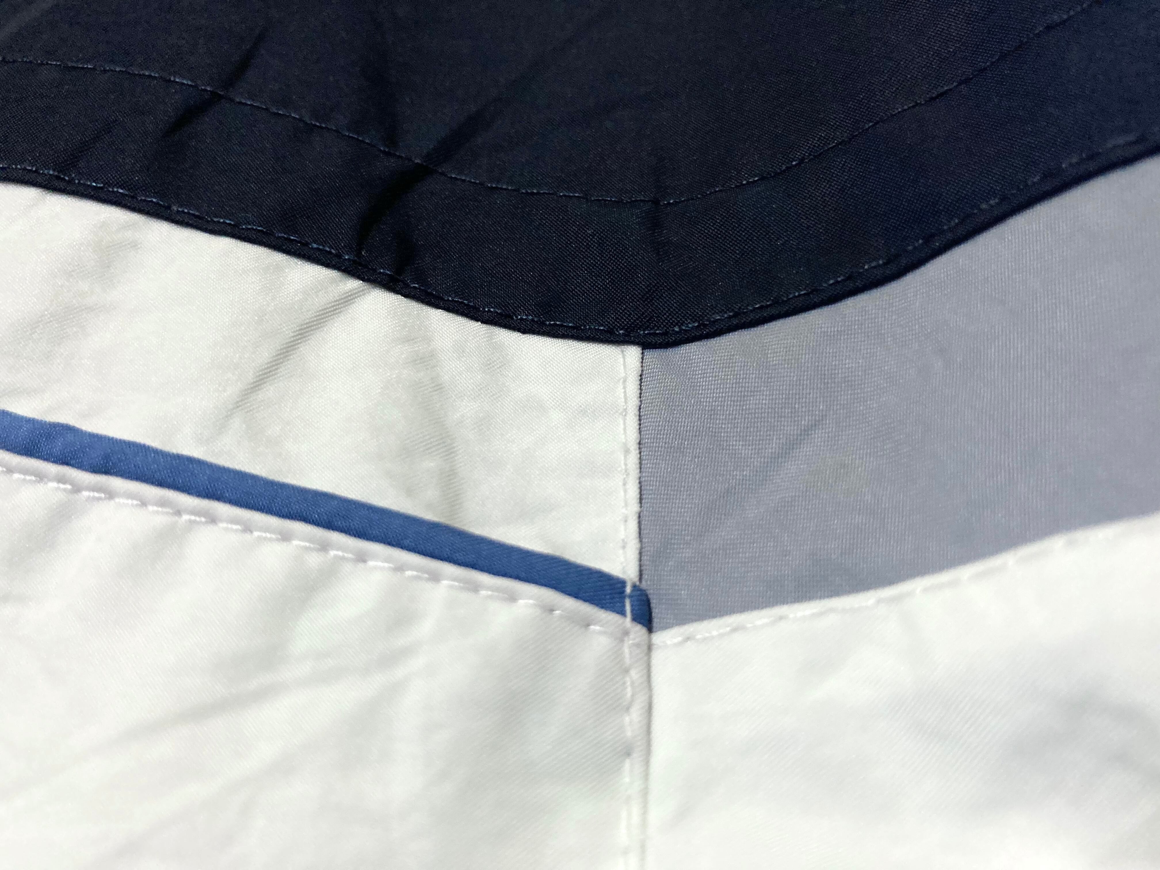 真っ白なホワイトとダークネイビーの切り替えのコントラストの中に斜めにズラした位置に配されたポケットが近未来的でテックな雰囲気を感じさせるデザイン。