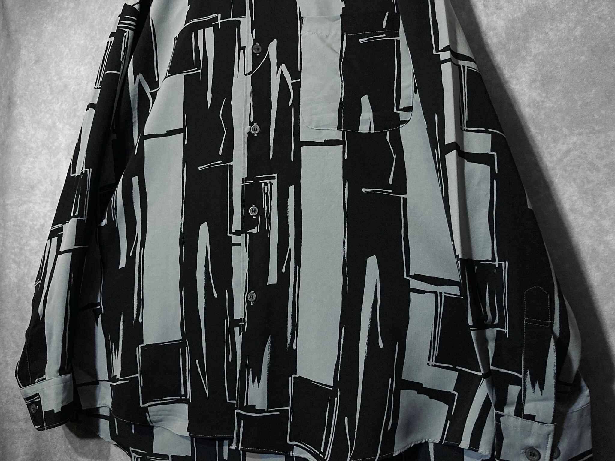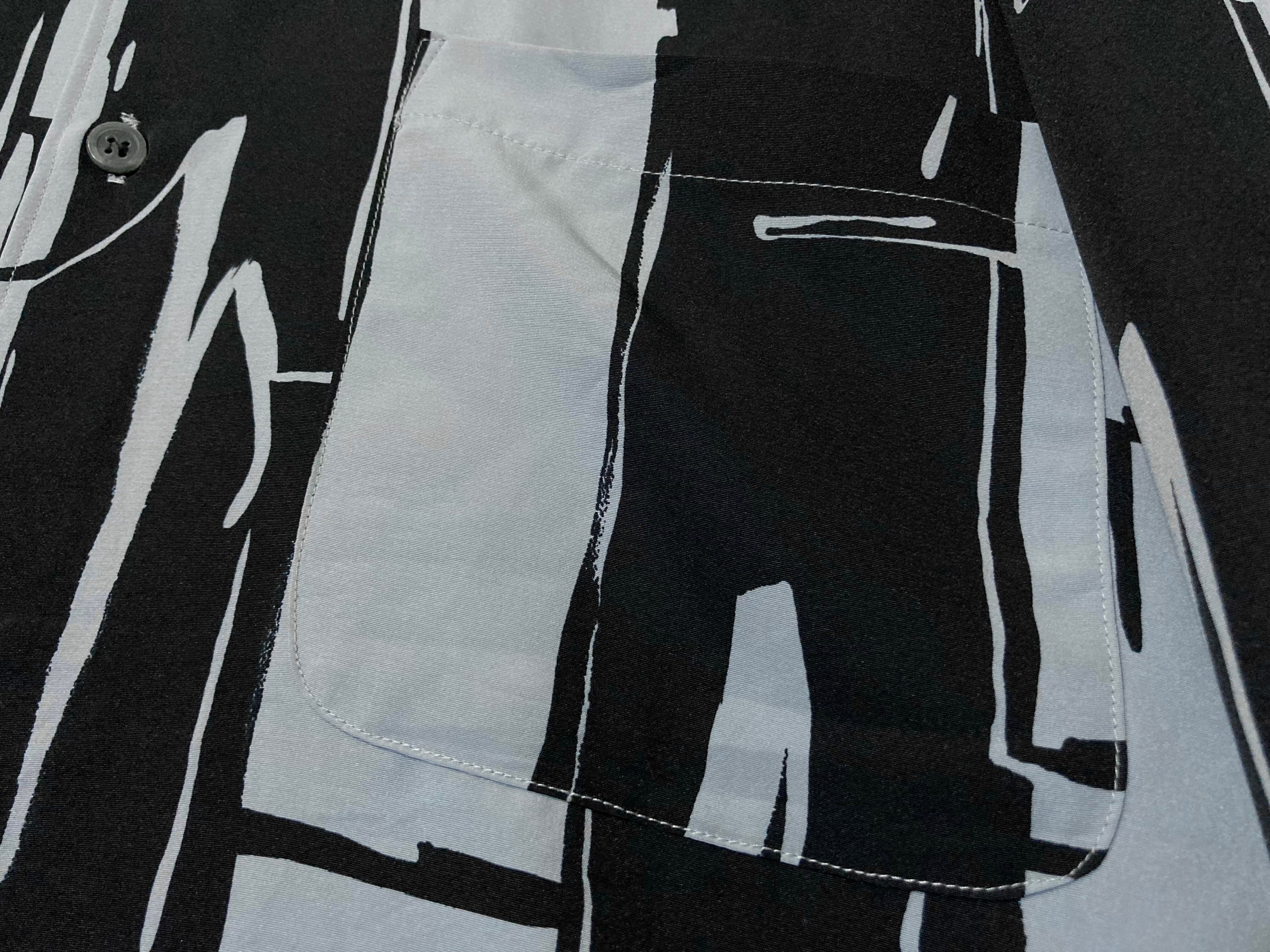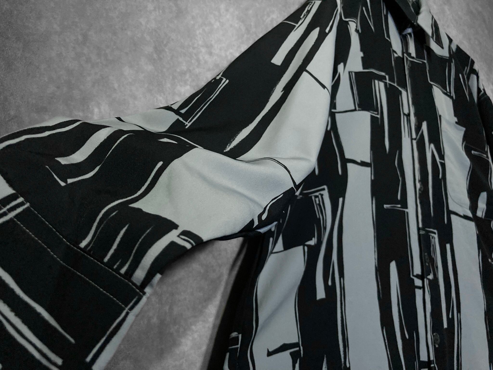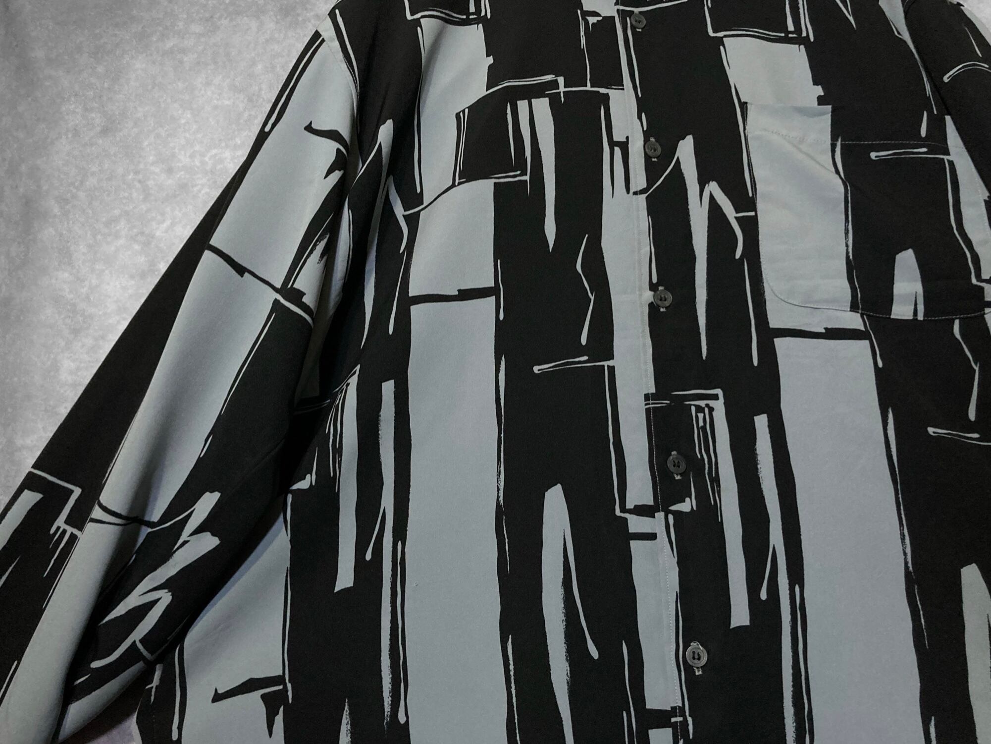 影が落ちた裏路地のようなモノトーンデザインの総柄が雰囲気ムンムンのデザインシャツの入荷です。