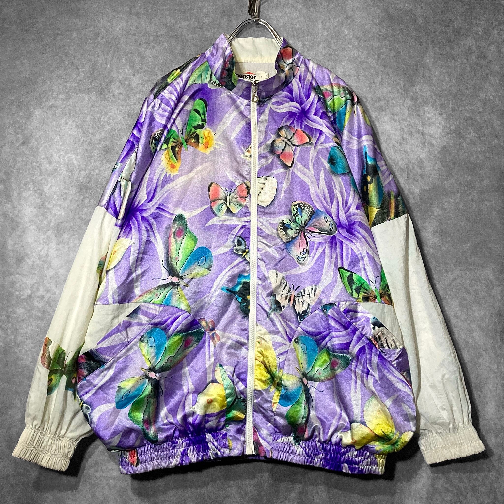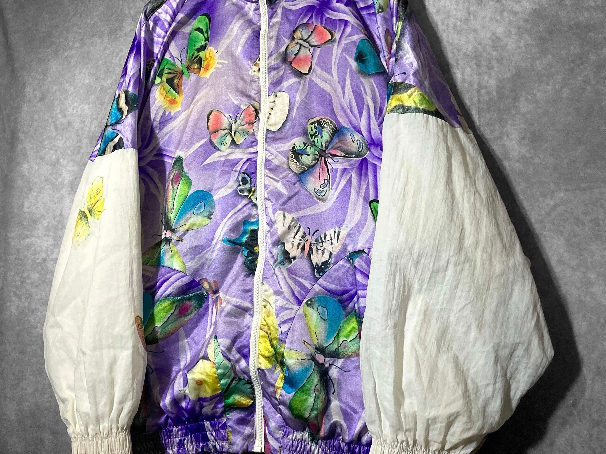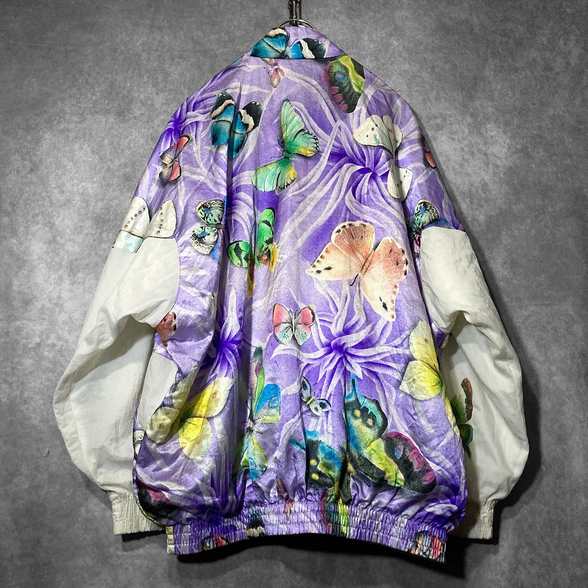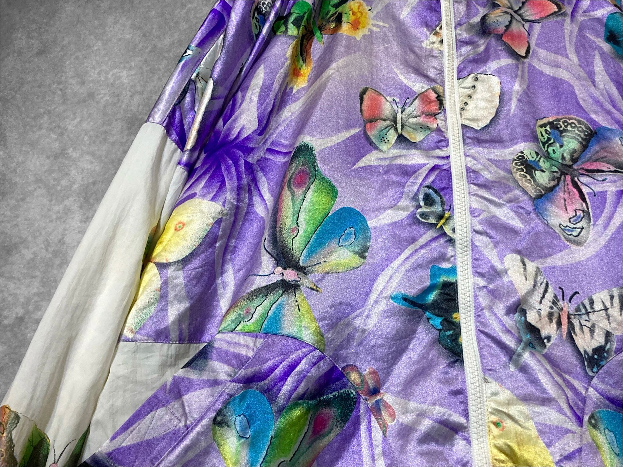 幻想的な紫の花柄と色鮮やかな蝶が舞うアーティスティックな総柄が雰囲気ムンムンなナイロンジャケットの入荷です✔︎